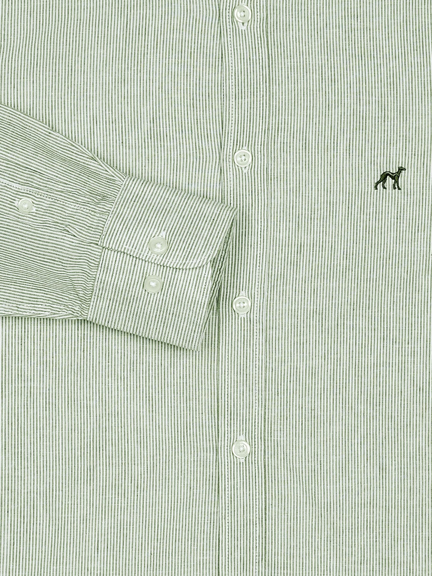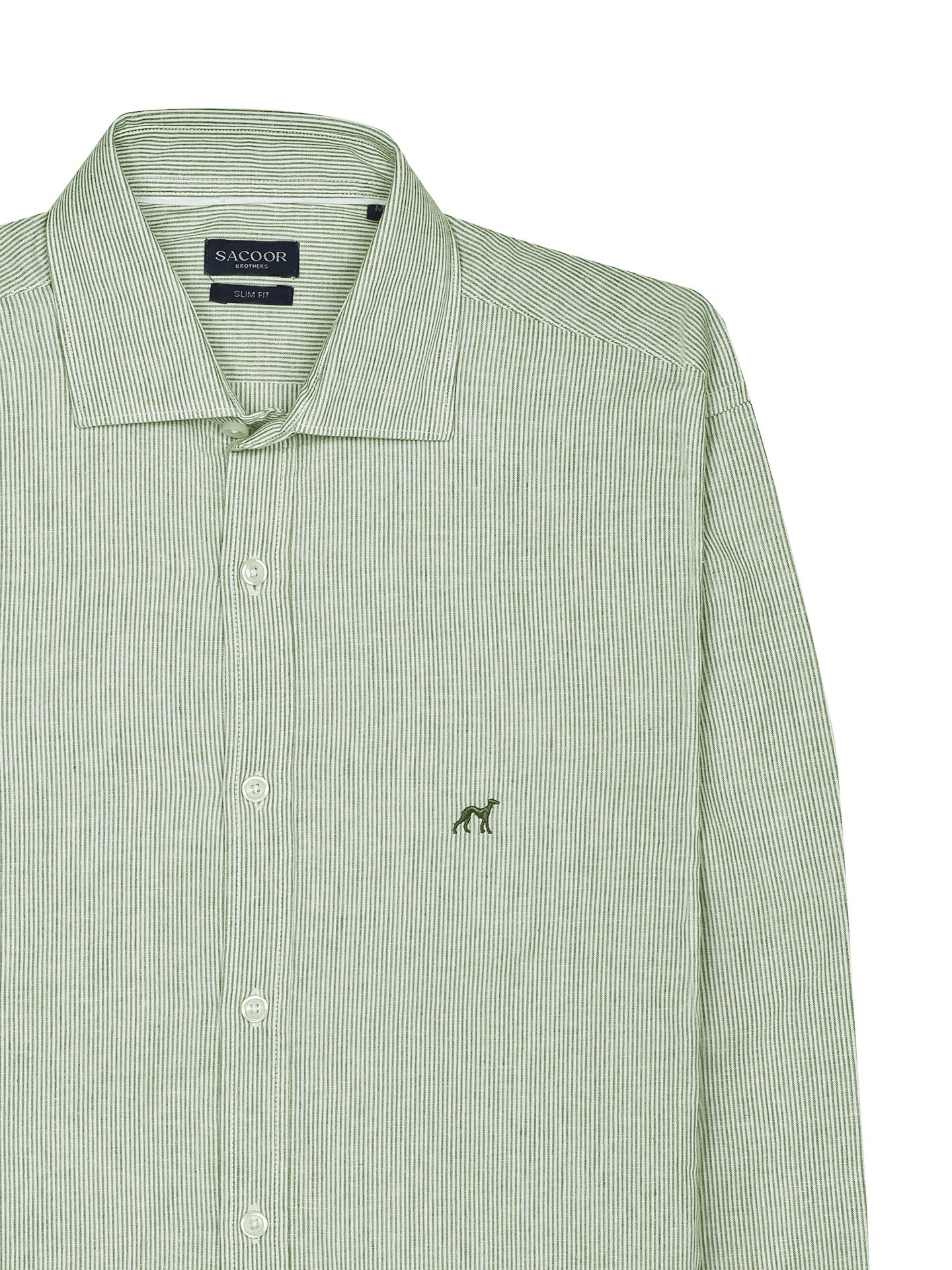 Crafted from 70% cotton and 30% linen, this slim fit casual sport shirt features an open collar, single cuff, long sleeves, and striped plain structured fabric. Comfortable and breathable, ideal for work, casual outings, or weekend events with a modern slim silhouette.