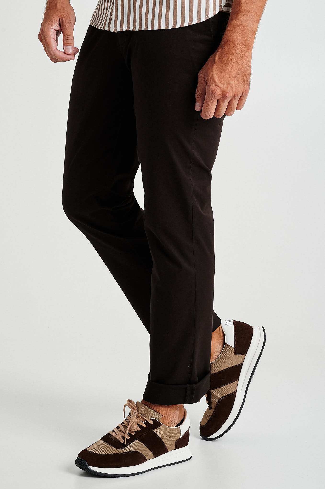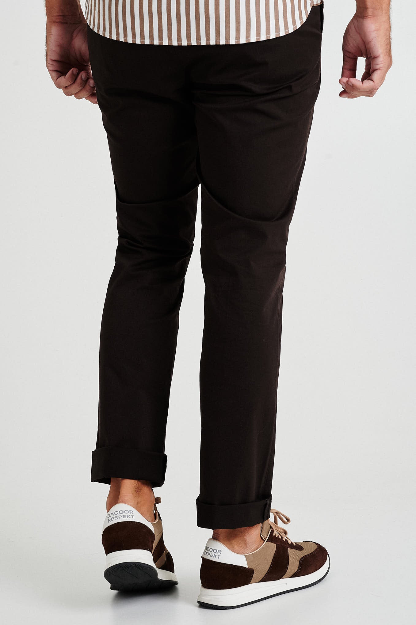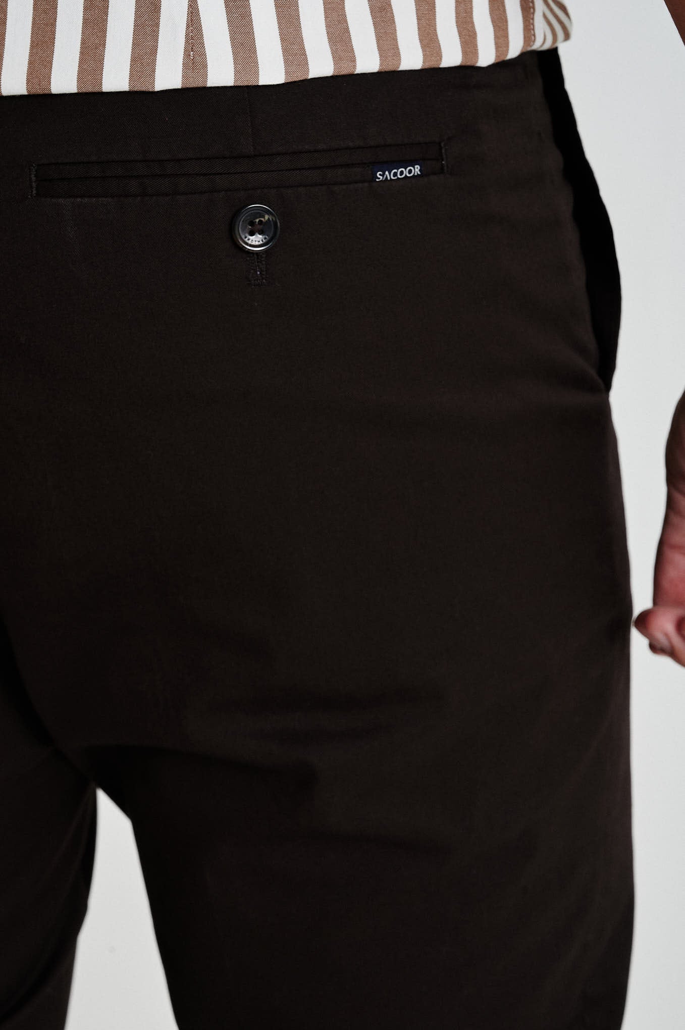 Creased plain chino trousers, fabric made from a blend of Cotton with Spandex for maximum comfort, featuring a regular fit, zip fly and top brand's button waistband fastening. Two slash pockets and one clock pocket with Sacoor?s brand print at front and two back doble welt pockets with buttons and belt loops. Regular single-stitch hem. Brand's metal plate at back pocket.