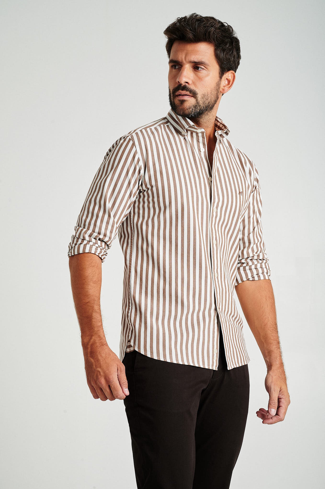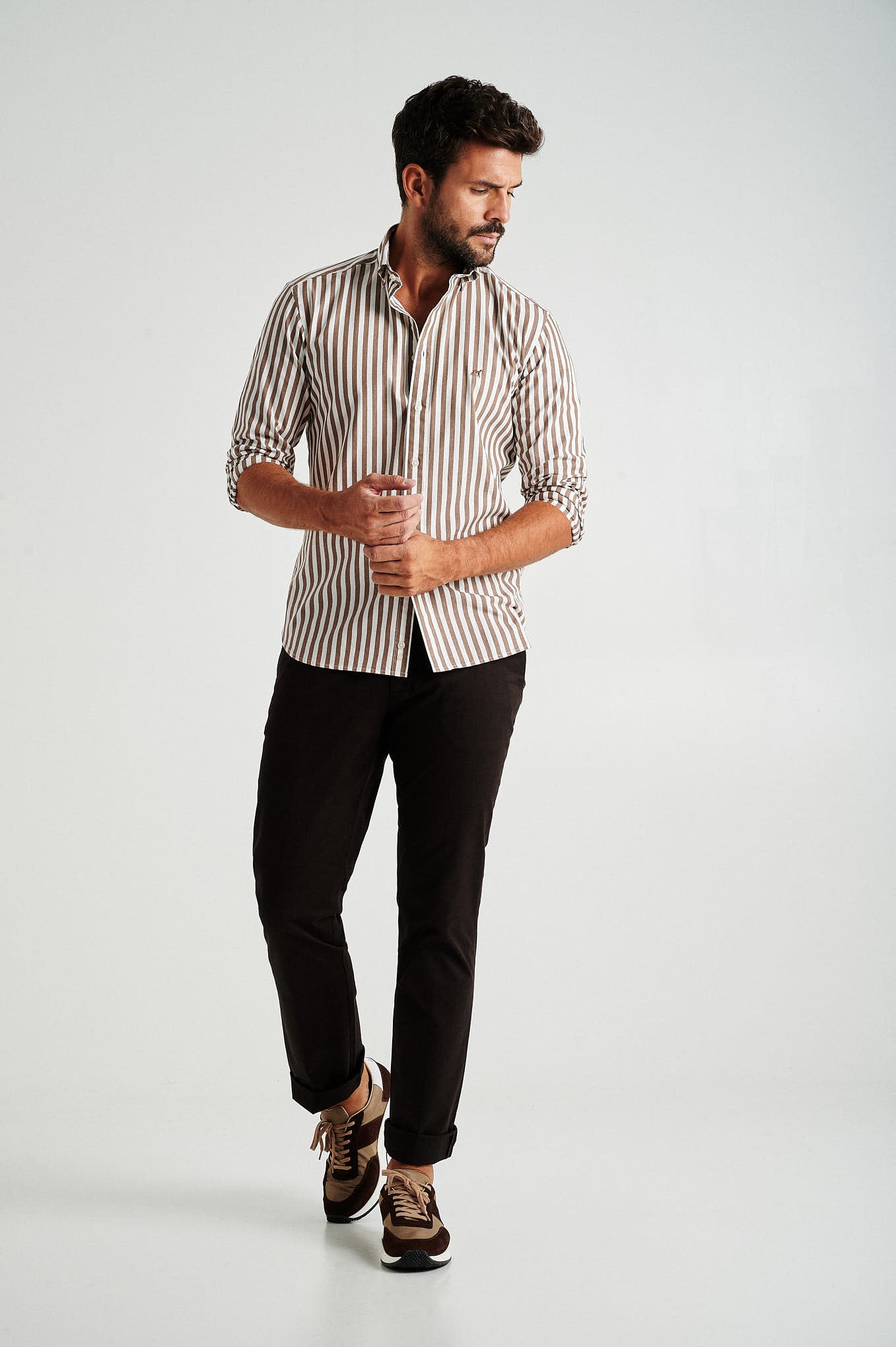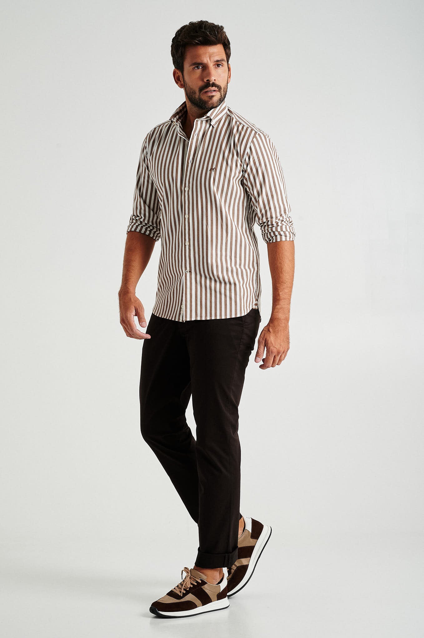 Creased plain chino trousers, fabric made from a blend of Cotton with Spandex for maximum comfort, featuring a regular fit, zip fly and top brand's button waistband fastening. Two slash pockets and one clock pocket with Sacoor?s brand print at front and two back doble welt pockets with buttons and belt loops. Regular single-stitch hem. Brand's metal plate at back pocket.