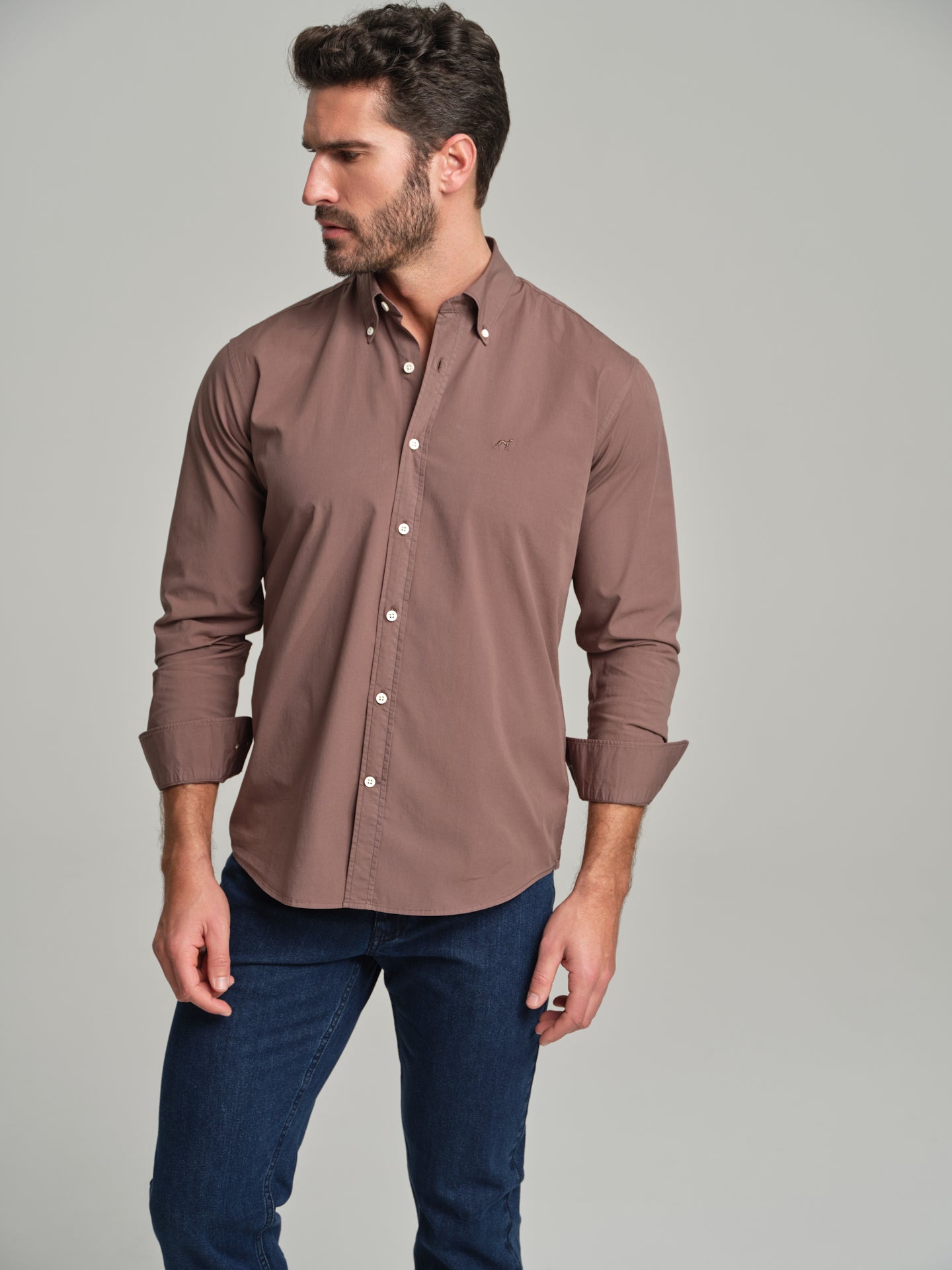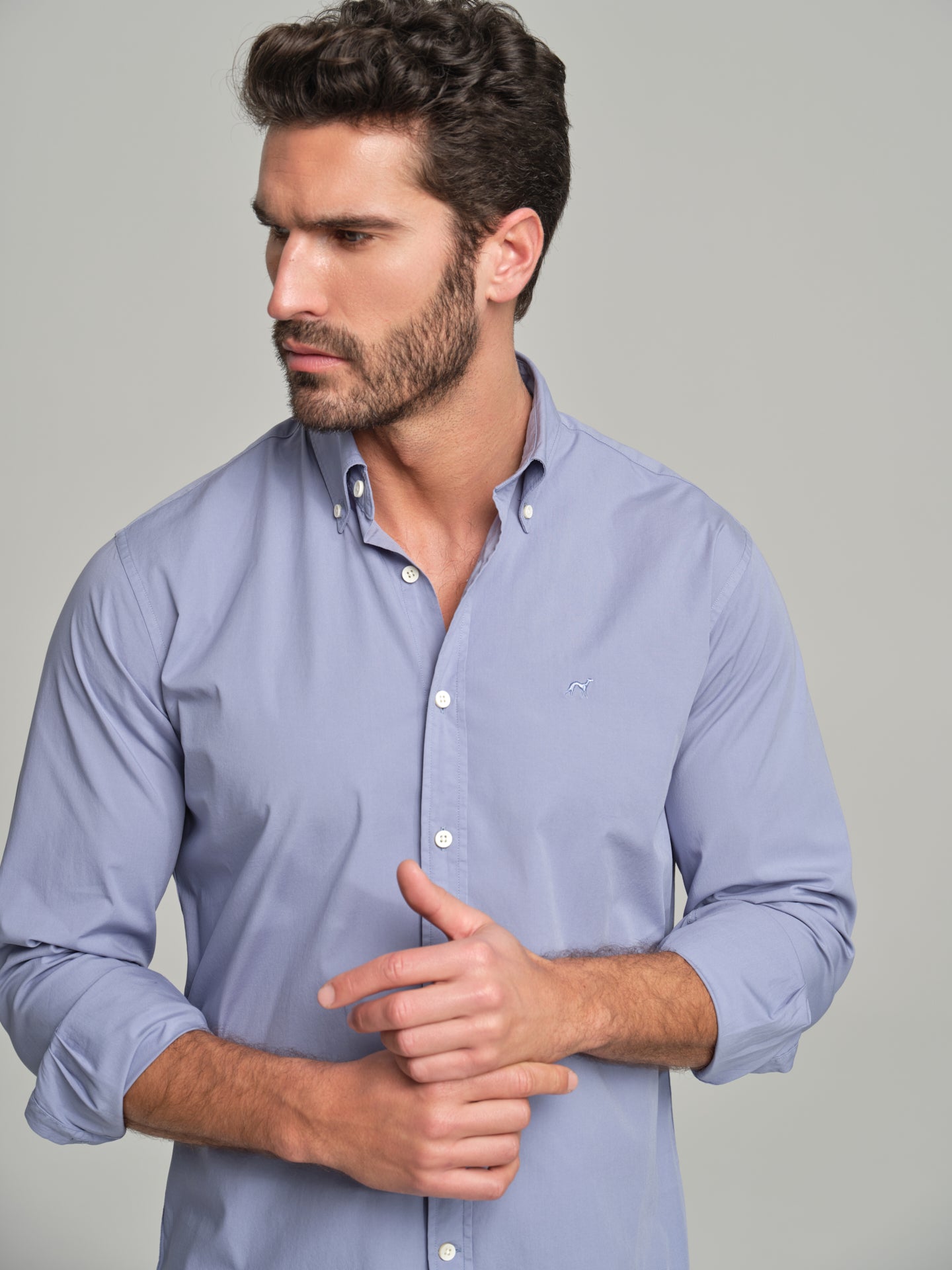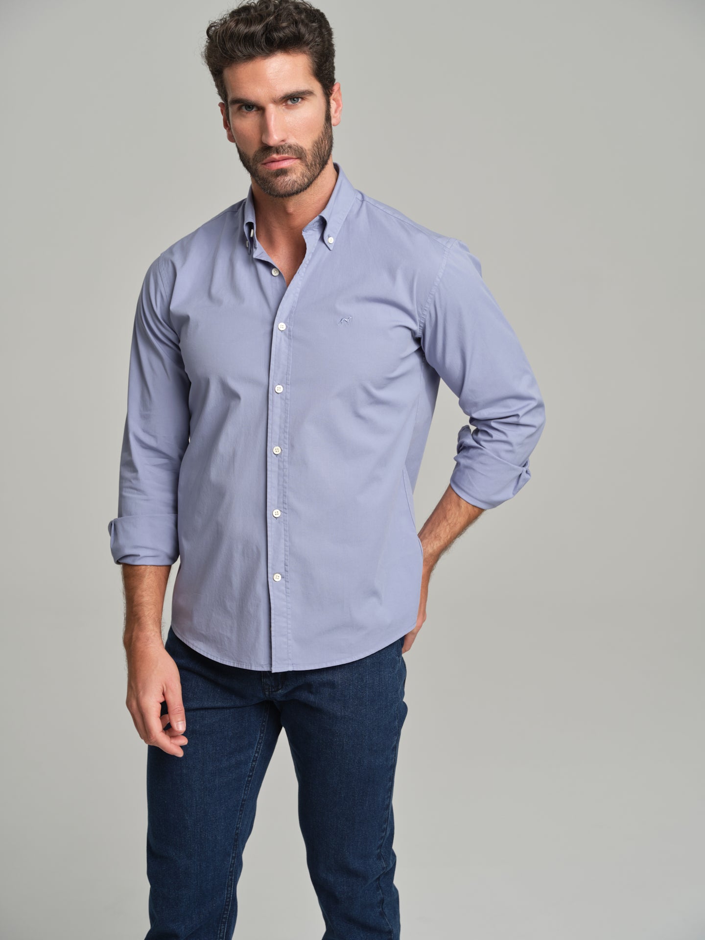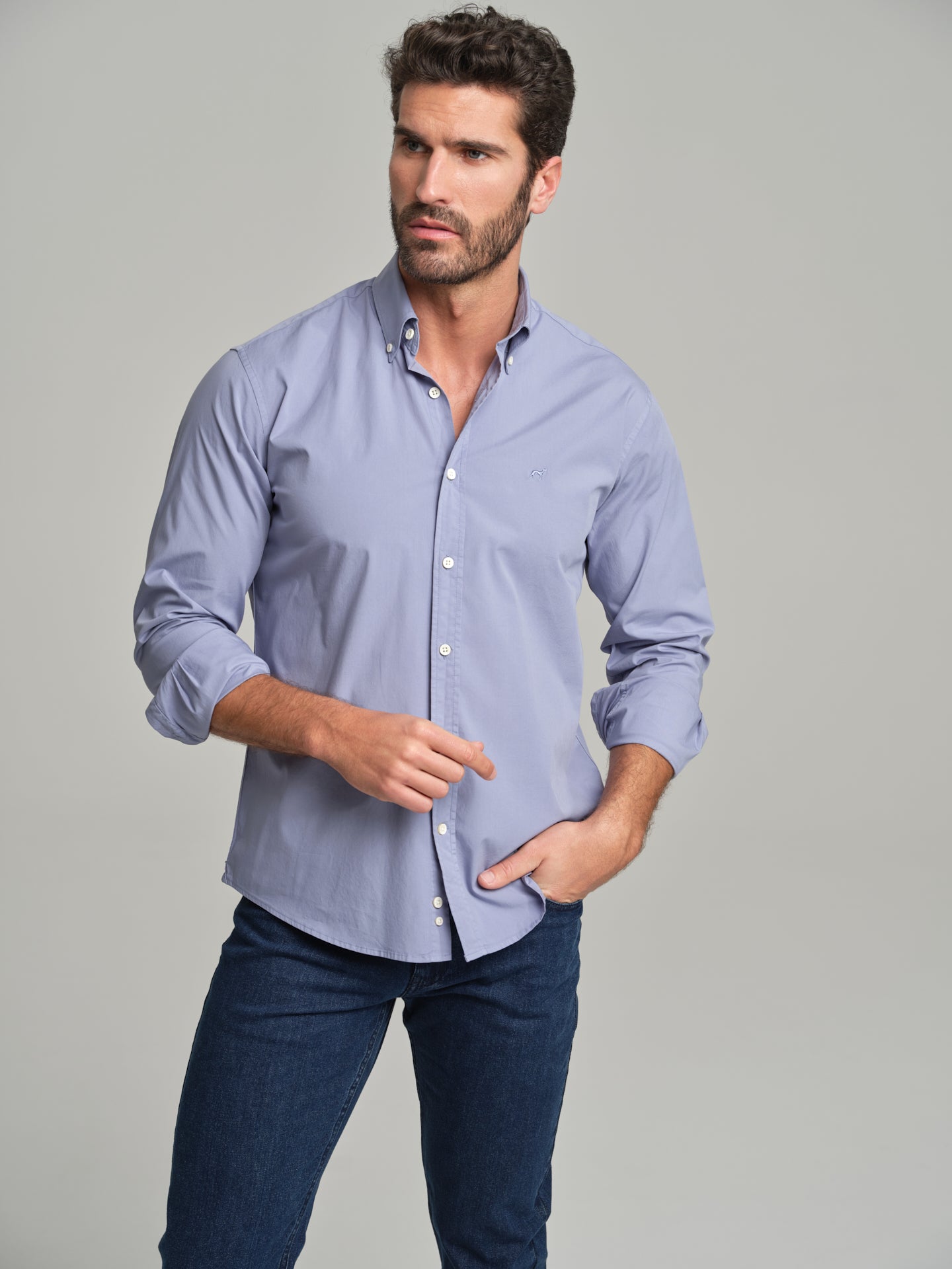 Sport garment dye shirt in plain poplin. Fabric made of 100% cotton. Featuring a button-down collar and front button-up fastening. Long sleeves with single cuffs with 2 buttons. Chest logo embroidery. Details such as last front button in contrast color and inside yoke in contrast pattern.