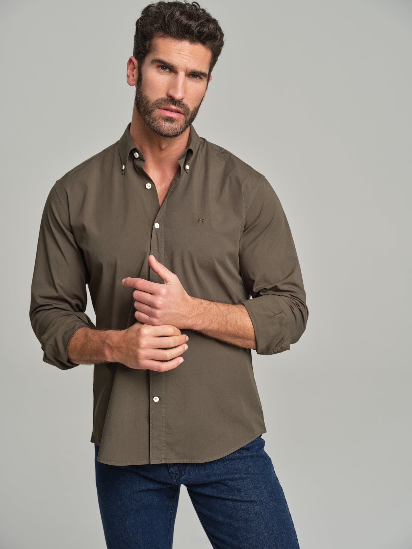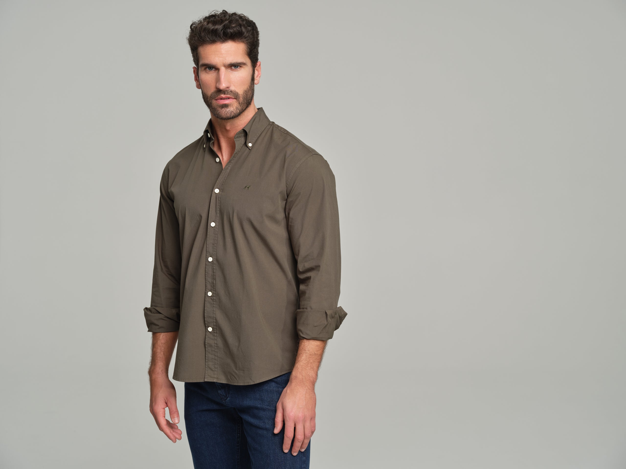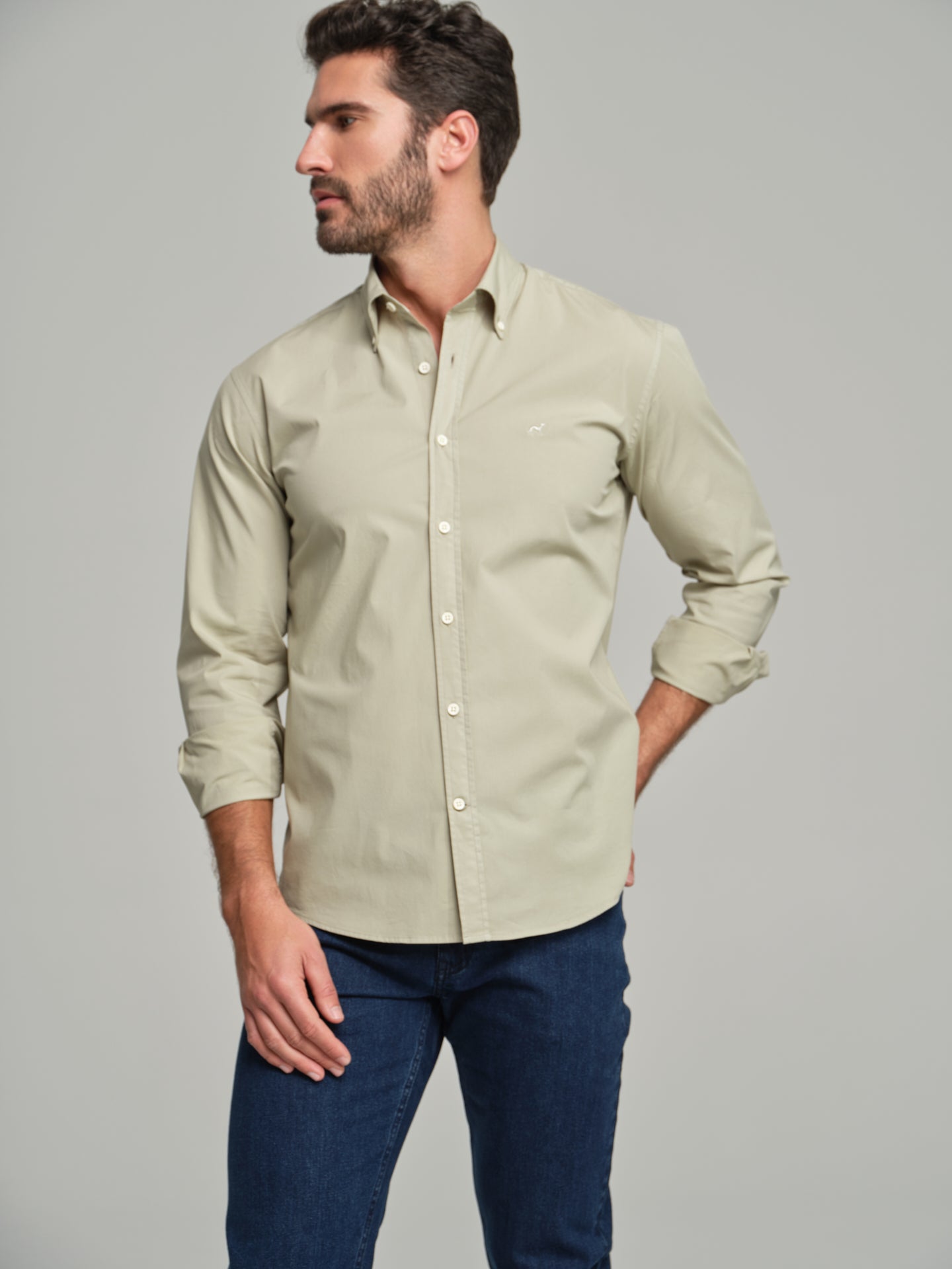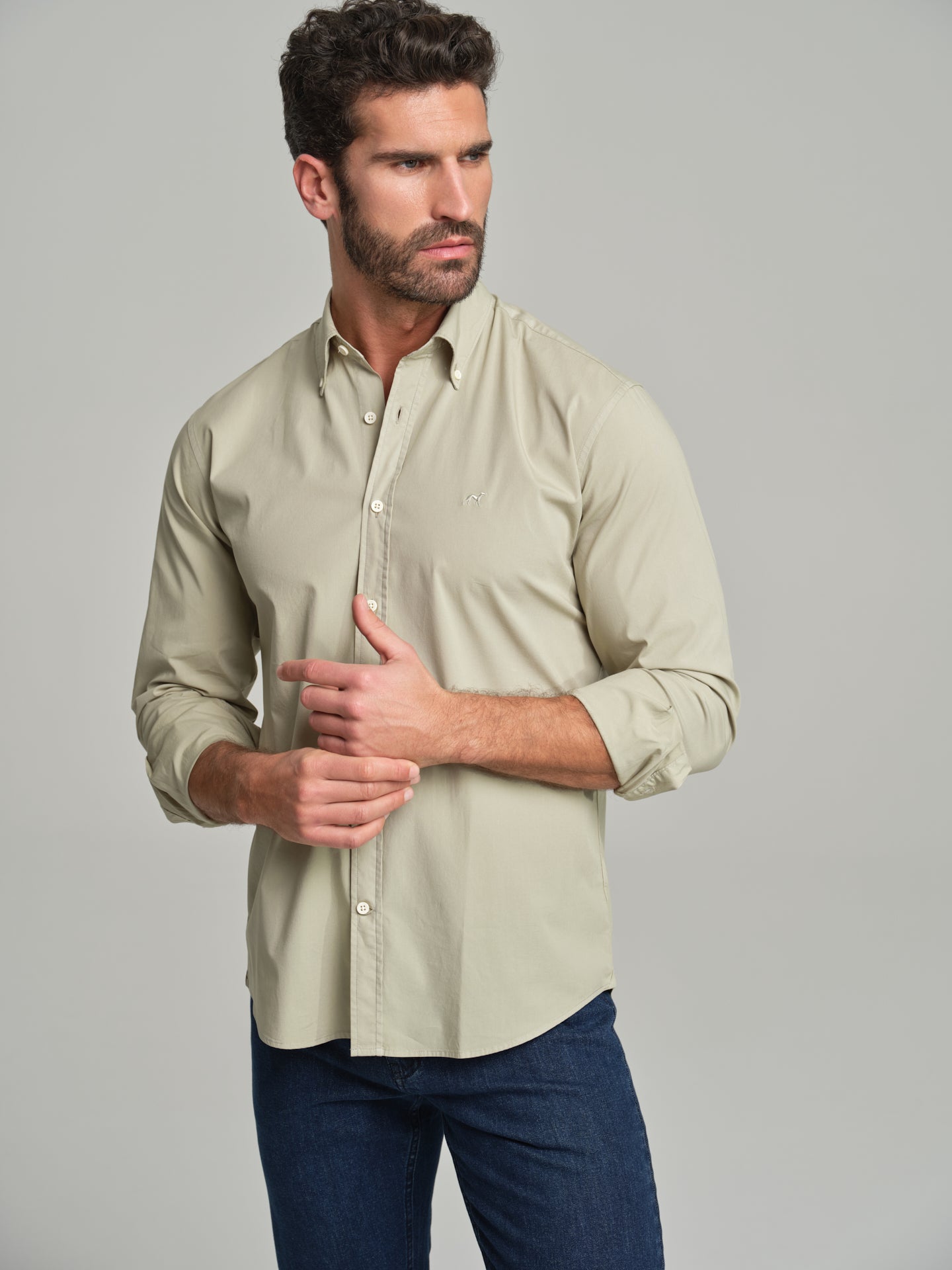Sport garment dye shirt in plain poplin. Fabric made of 100% cotton. Featuring a button-down collar and front button-up fastening. Long sleeves with single cuffs with 2 buttons. Chest logo embroidery. Details such as last front button in contrast color and inside yoke in contrast pattern.