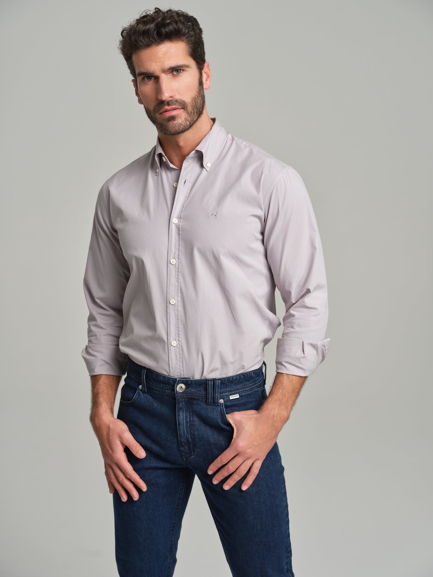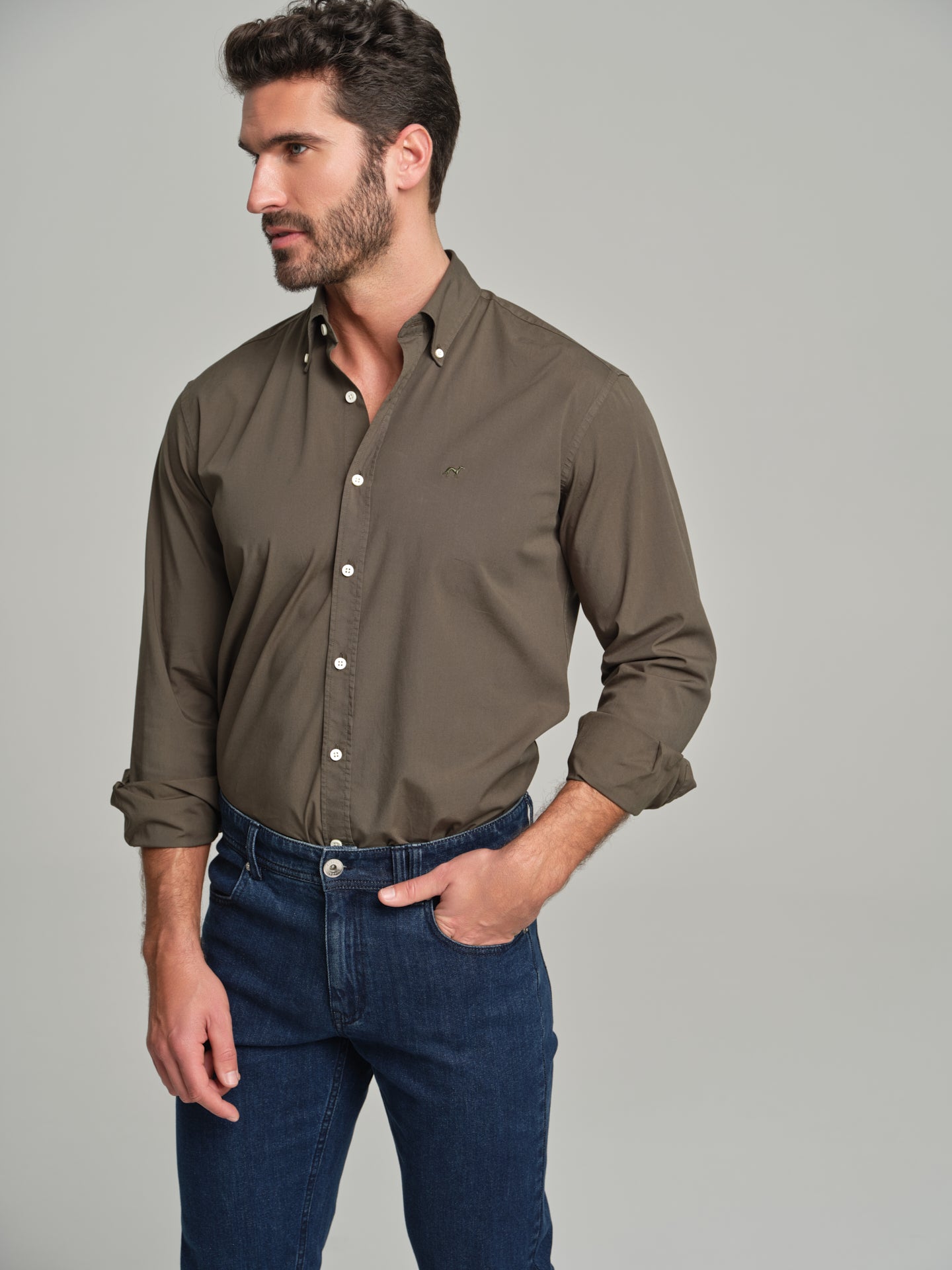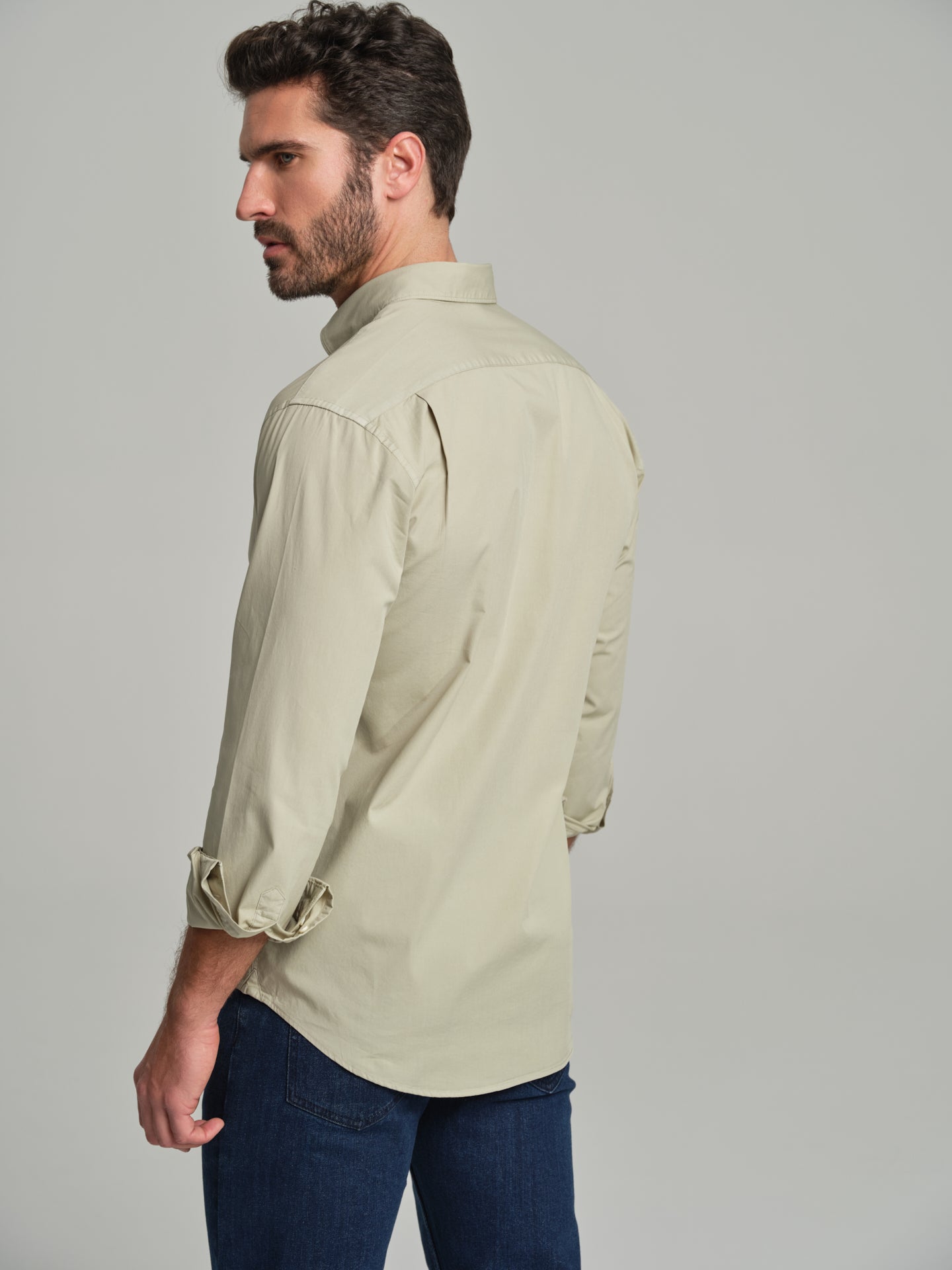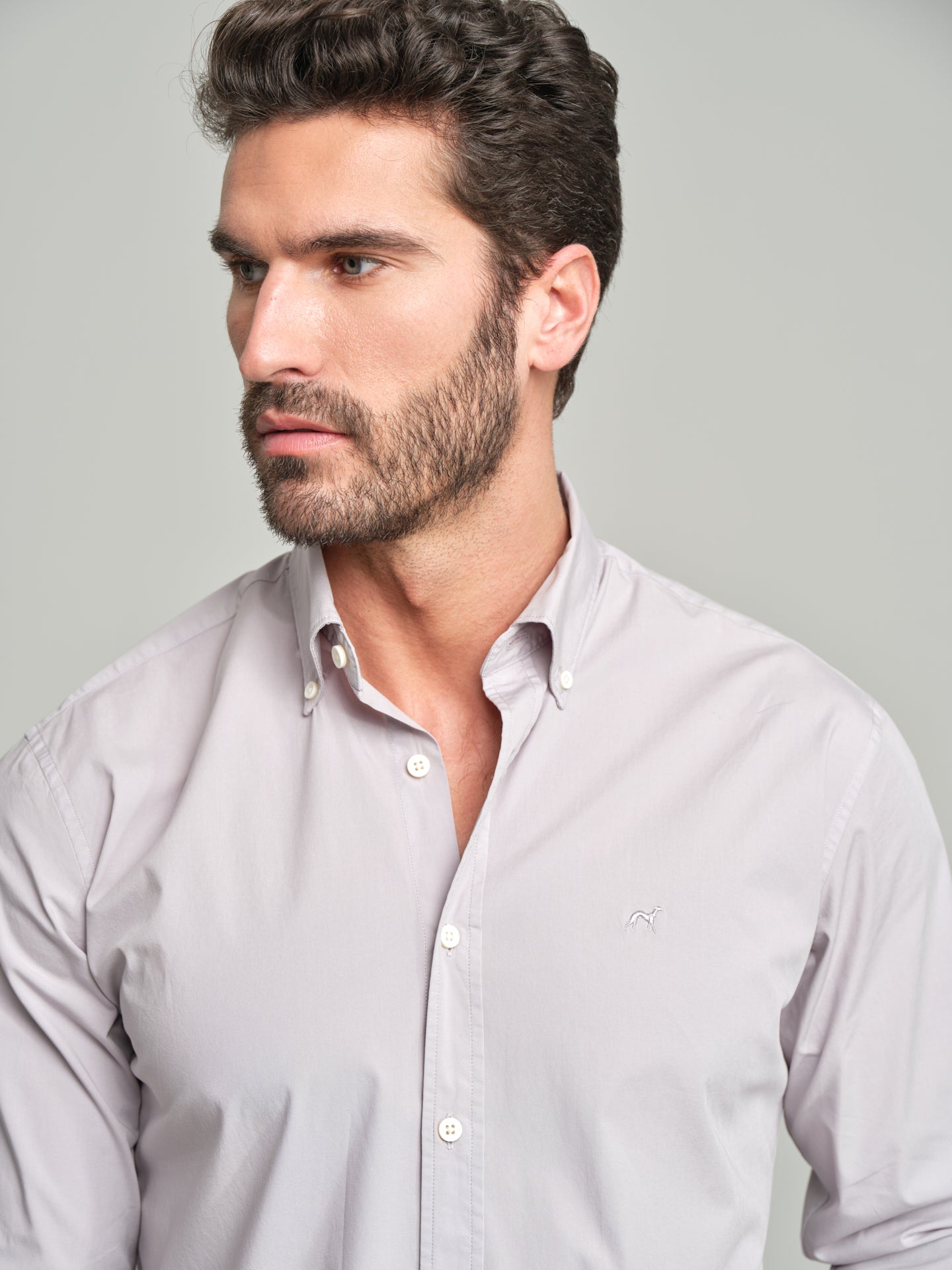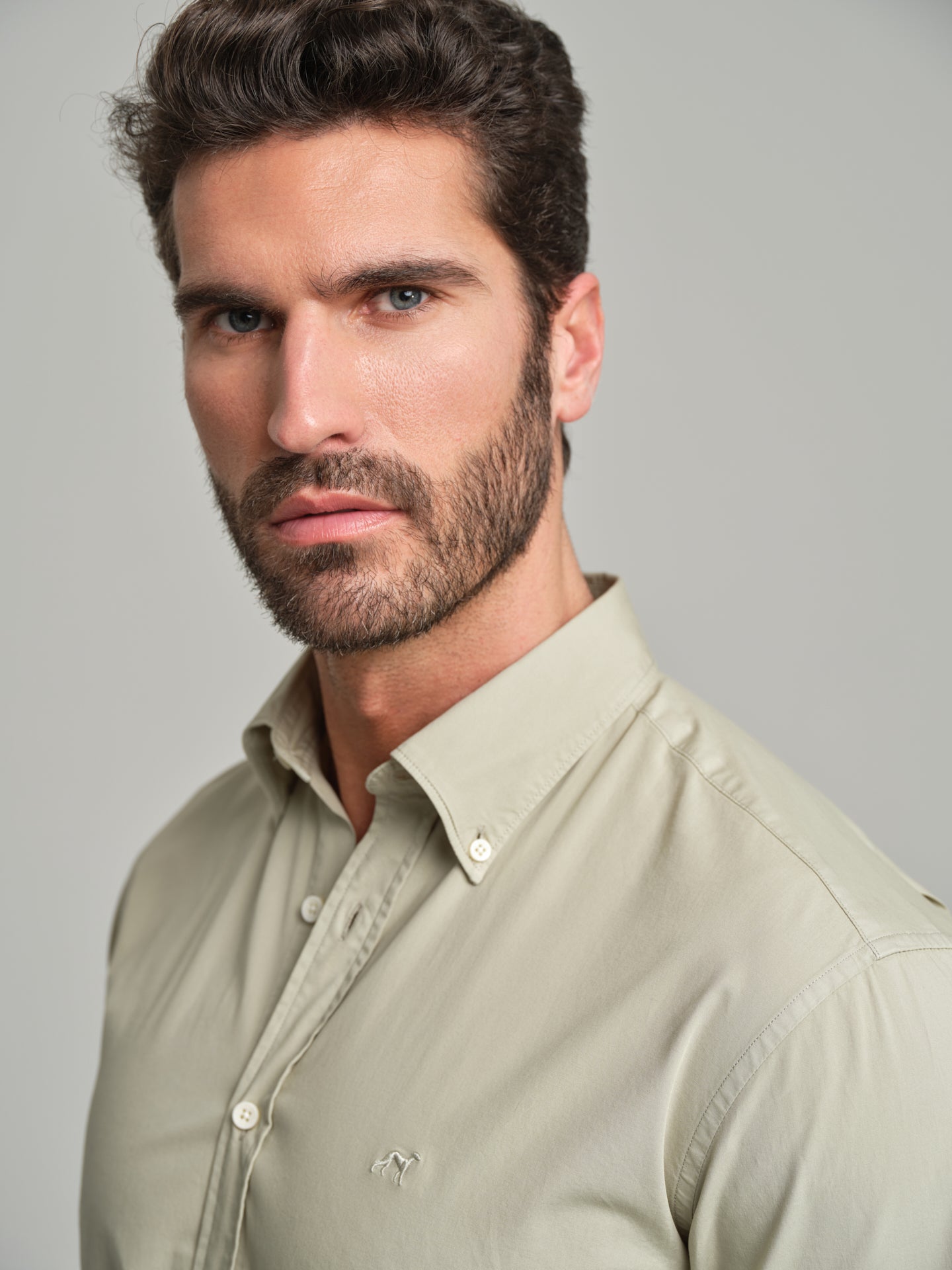 Sport garment dye shirt in plain poplin. Fabric made of 100% cotton. Featuring a button-down collar and front button-up fastening. Long sleeves with single cuffs with 2 buttons. Chest logo embroidery. Details such as last front button in contrast color and inside yoke in contrast pattern.