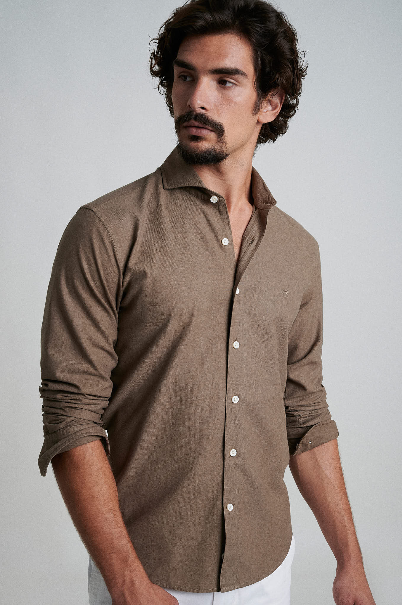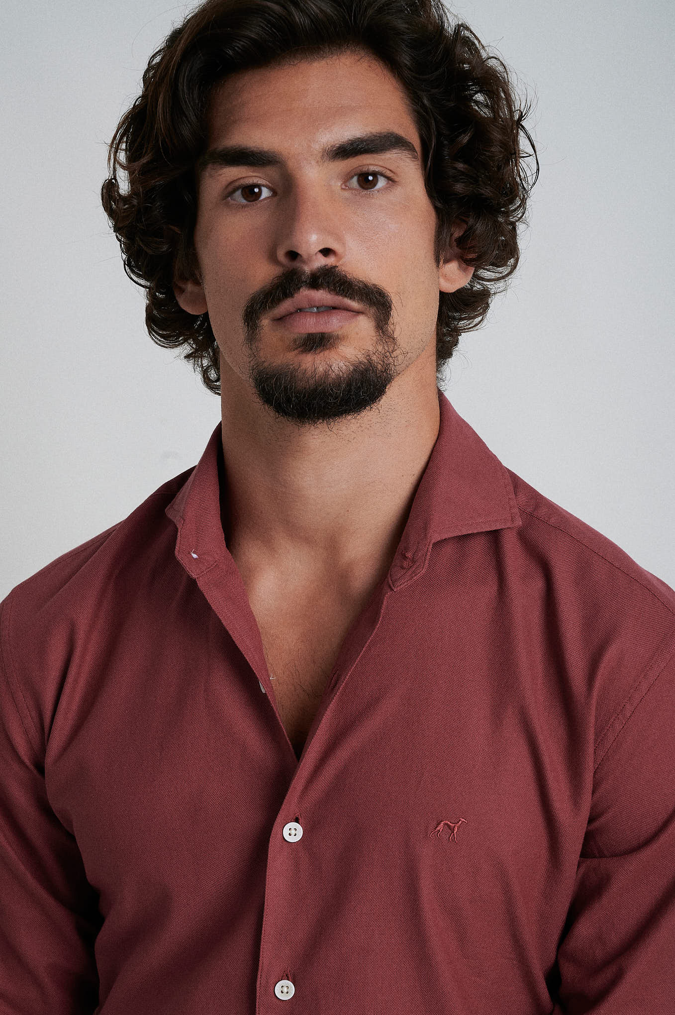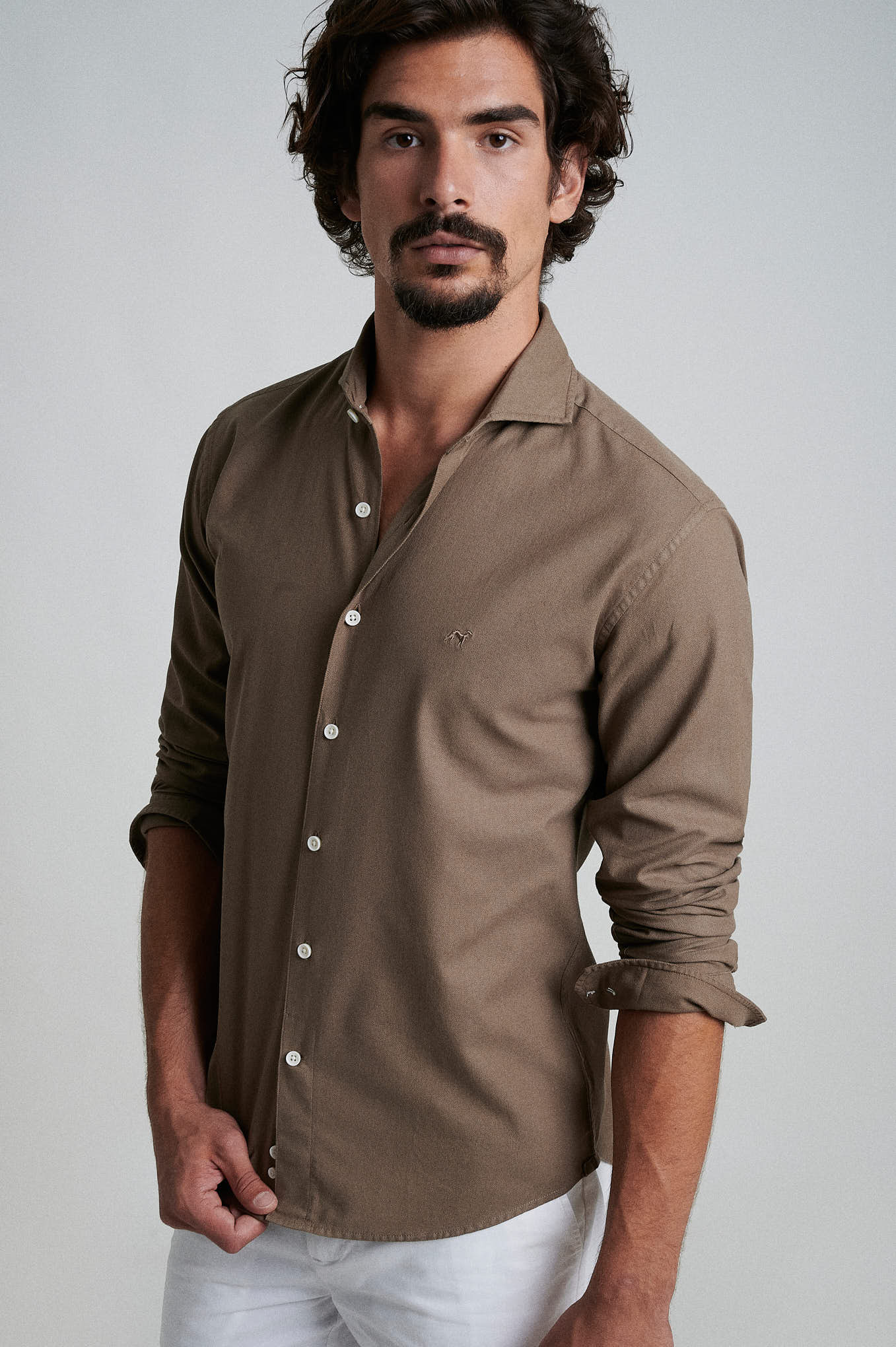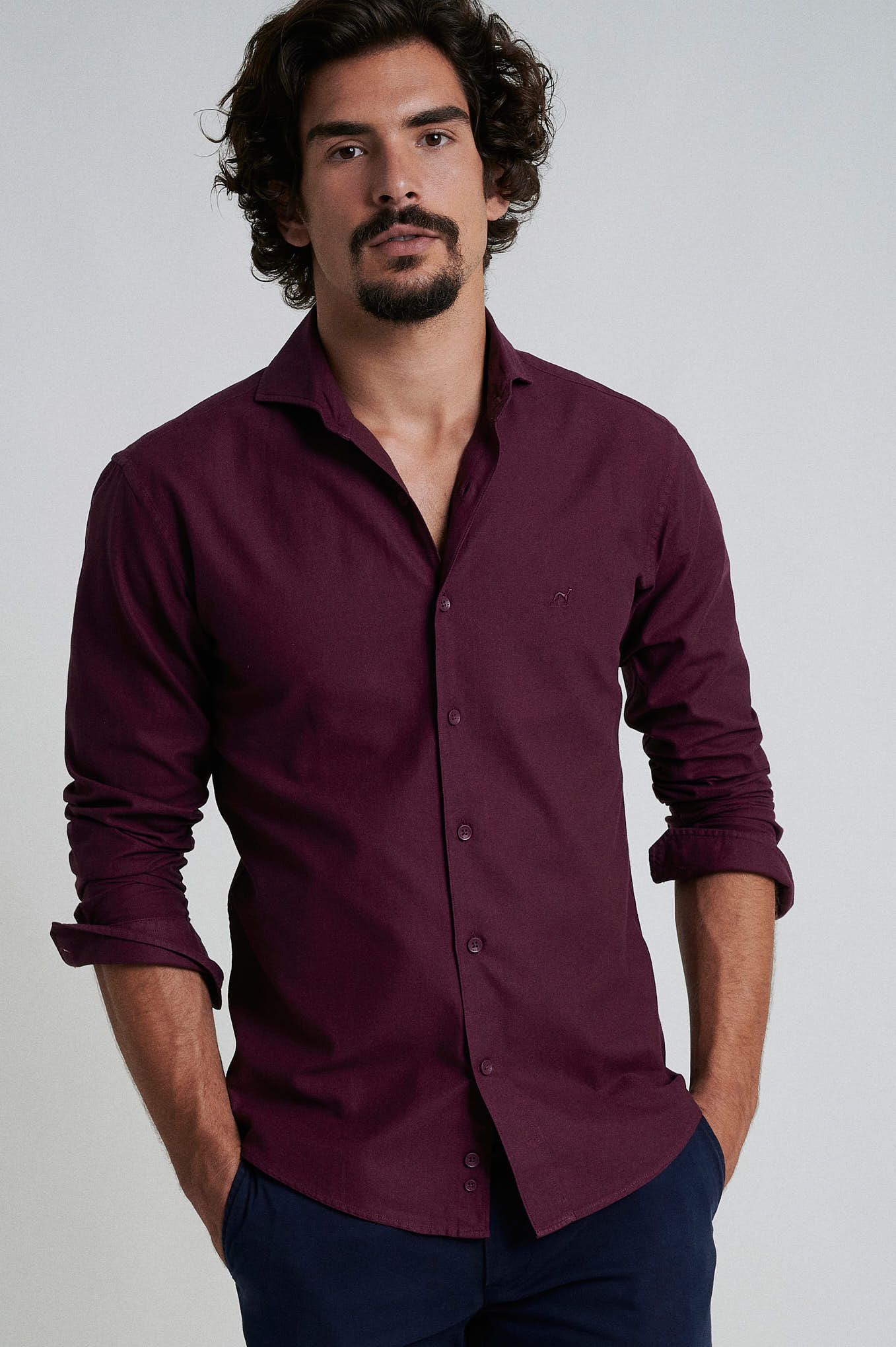 Dobby casual shirt made of 100% cotton fabric, garment dye. Features a slim fit with open collar and long sleeves with rounded cuffs with 1 button. Side gussets in self fabric. Flag label at side and new zigzag stitching on front placed at bottom button. Tone on tone chest embroidery.