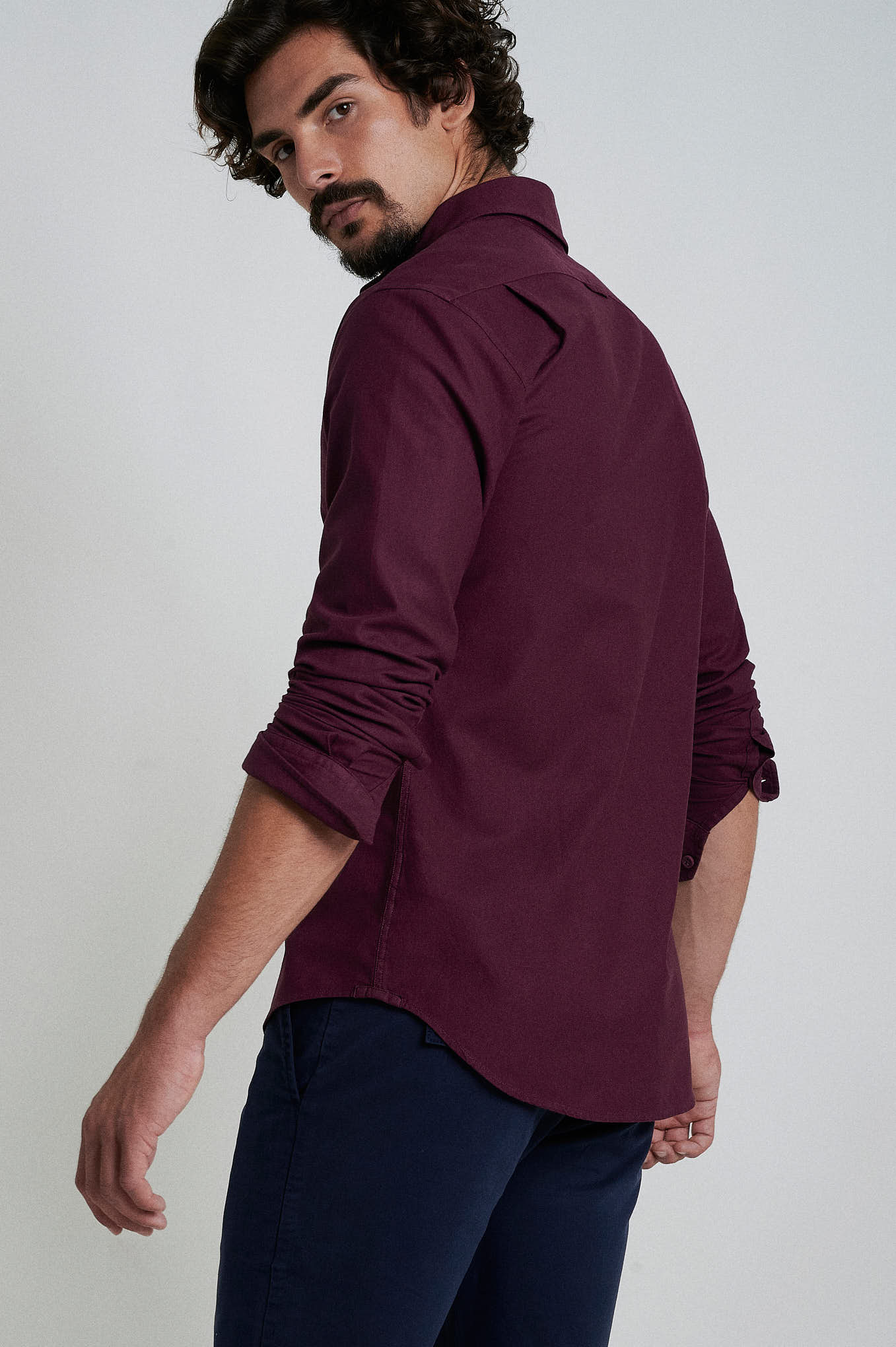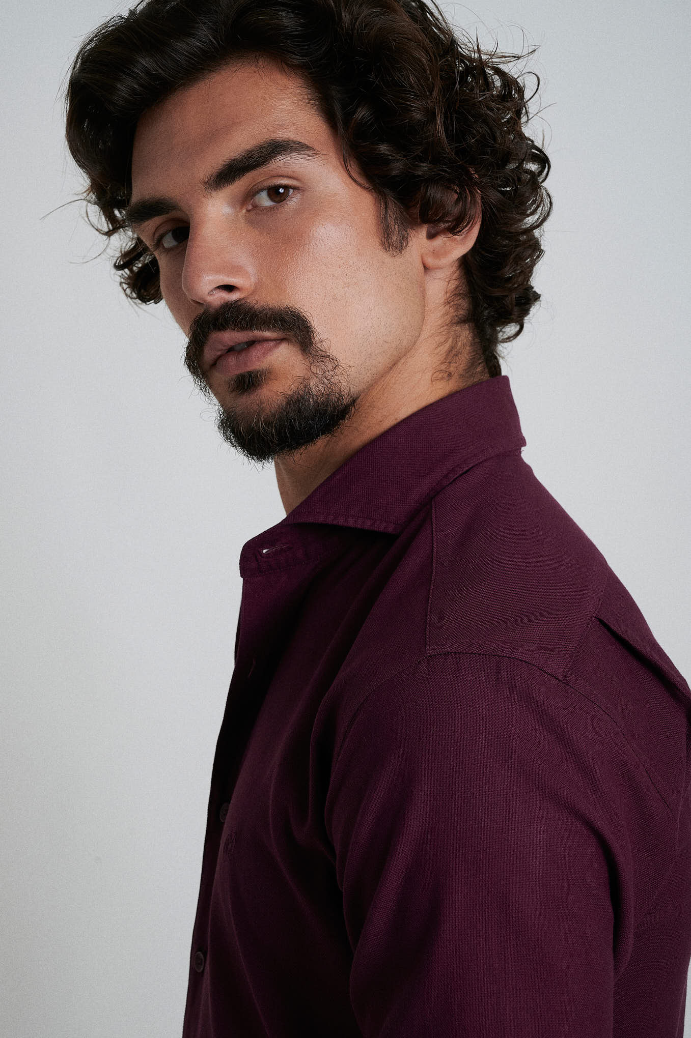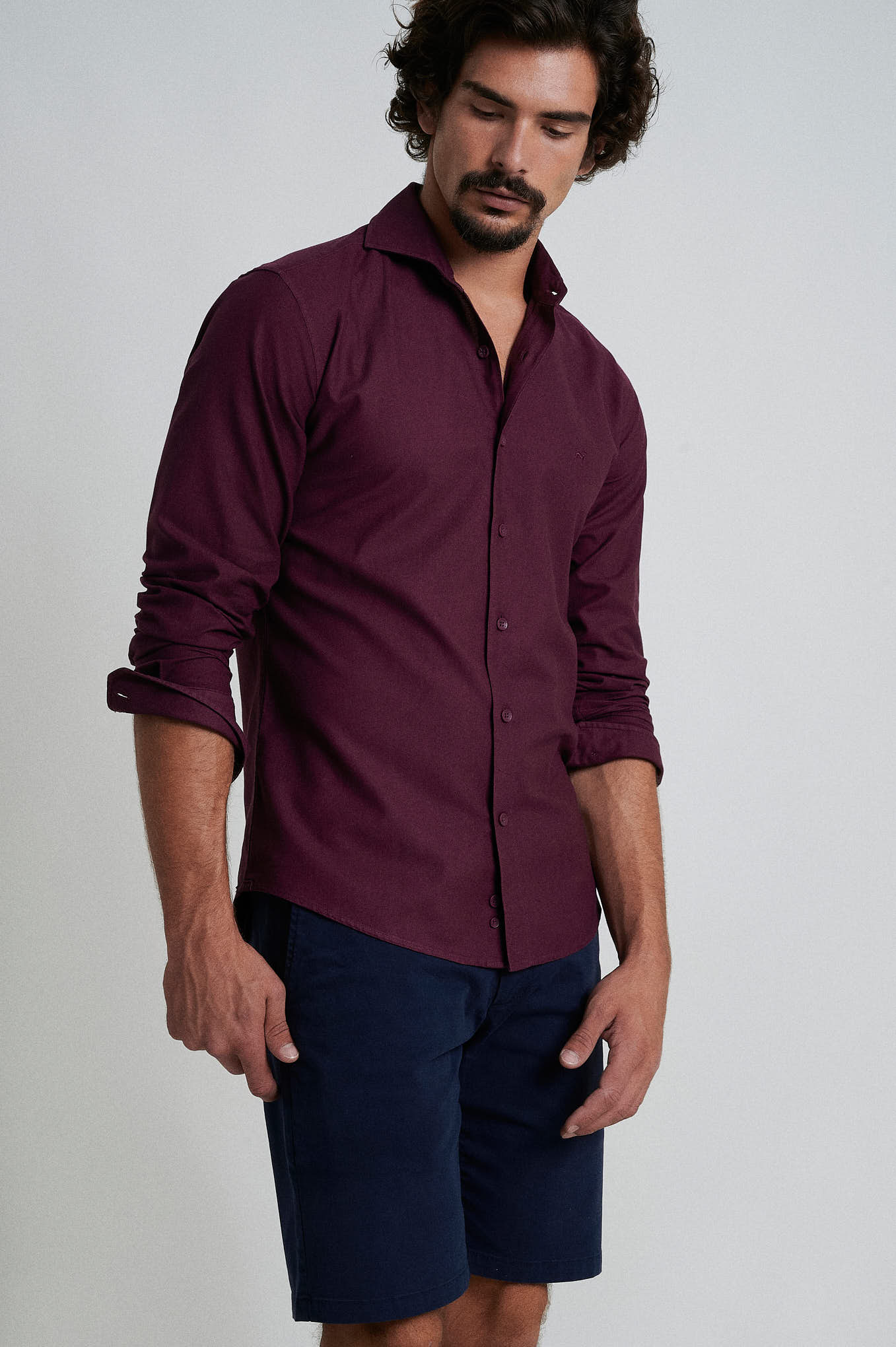 Dobby casual shirt made of 100% cotton fabric, garment dye. Features a slim fit with open collar and long sleeves with rounded cuffs with 1 button. Side gussets in self fabric. Flag label at side and new zigzag stitching on front placed at bottom button. Tone on tone chest embroidery.