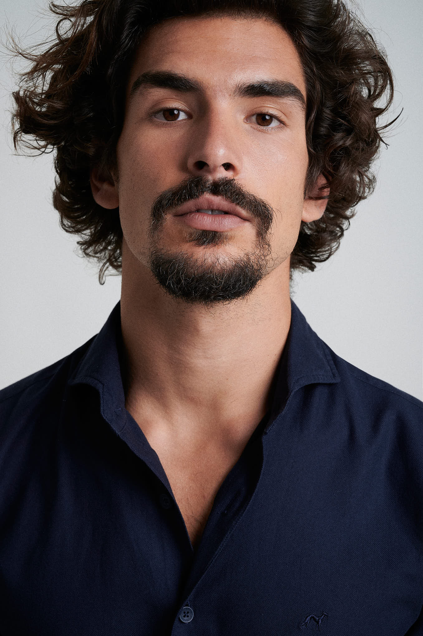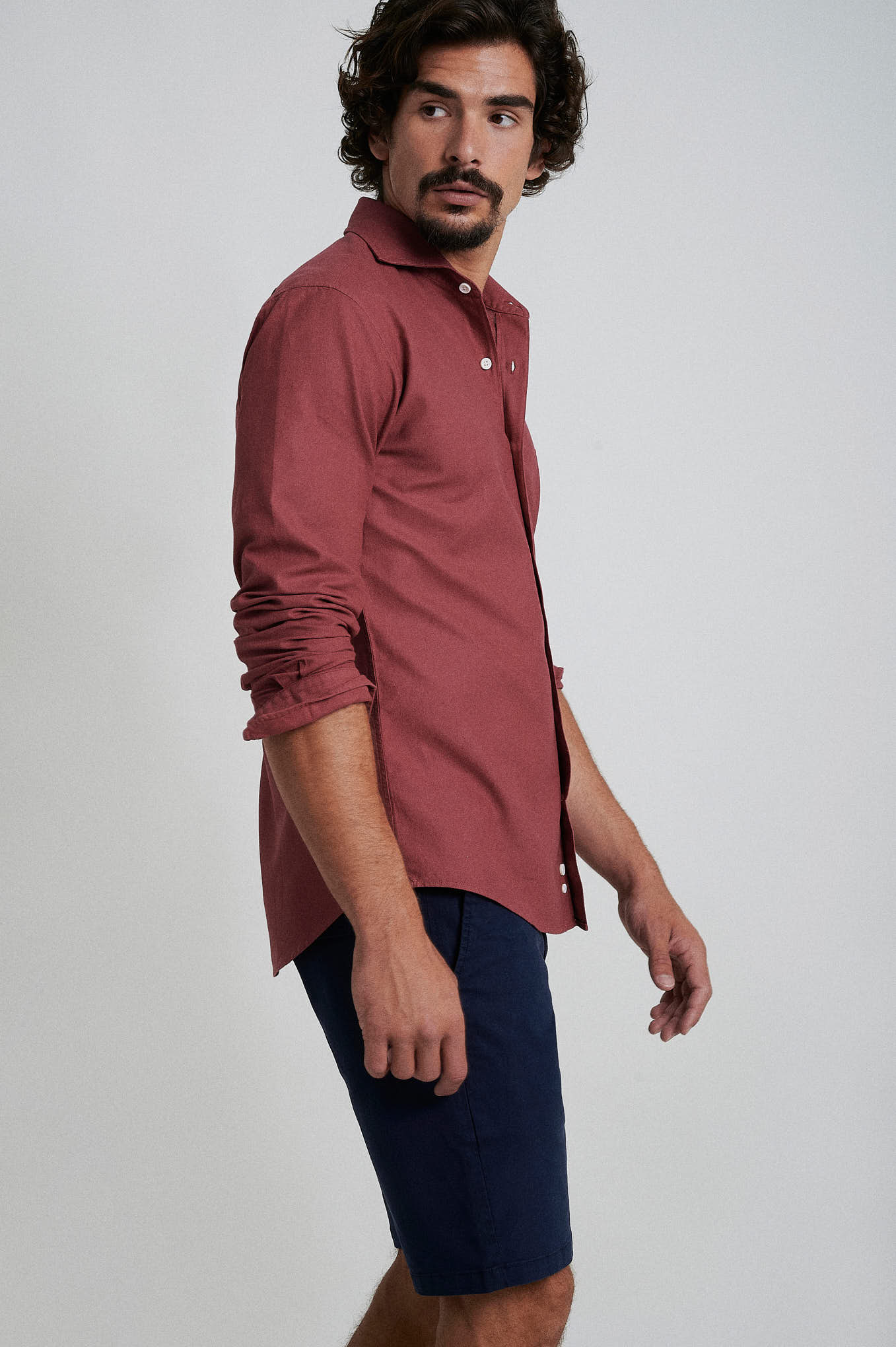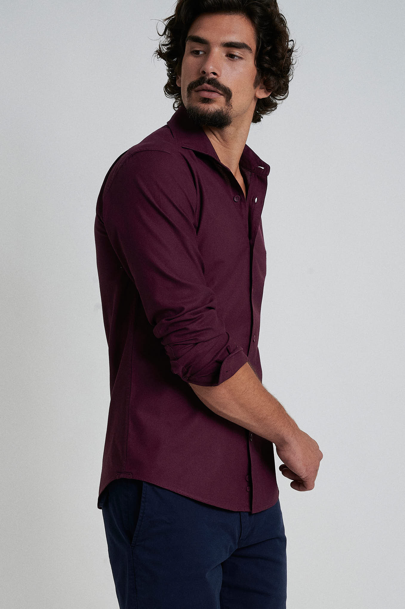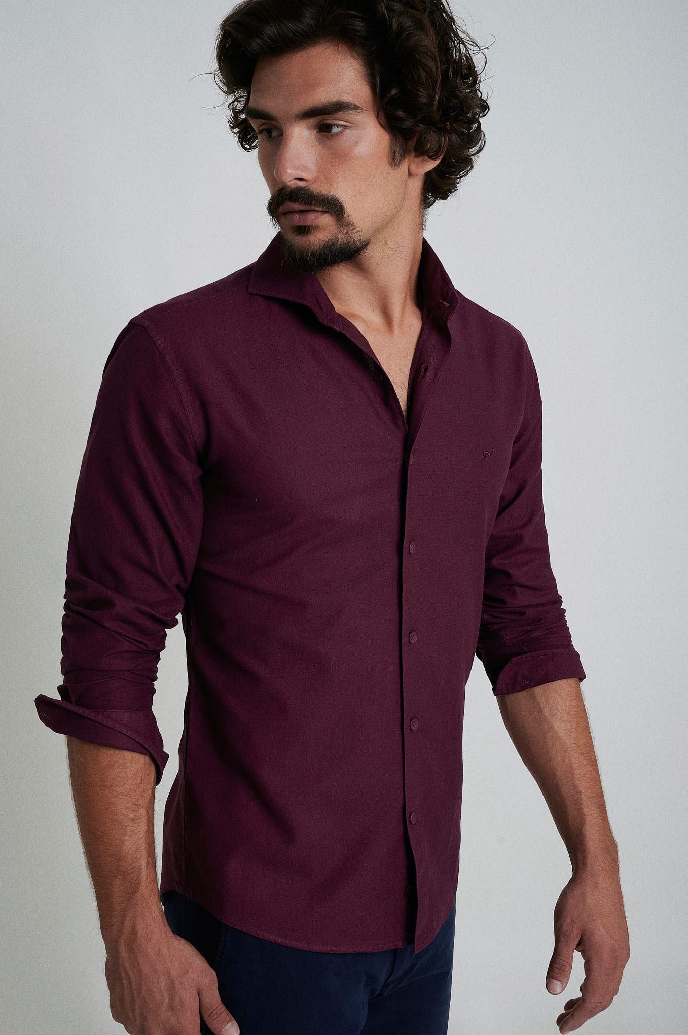 Dobby casual shirt made of 100% cotton fabric, garment dye. Features a slim fit with open collar and long sleeves with rounded cuffs with 1 button. Side gussets in self fabric. Flag label at side and new zigzag stitching on front placed at bottom button. Tone on tone chest embroidery.