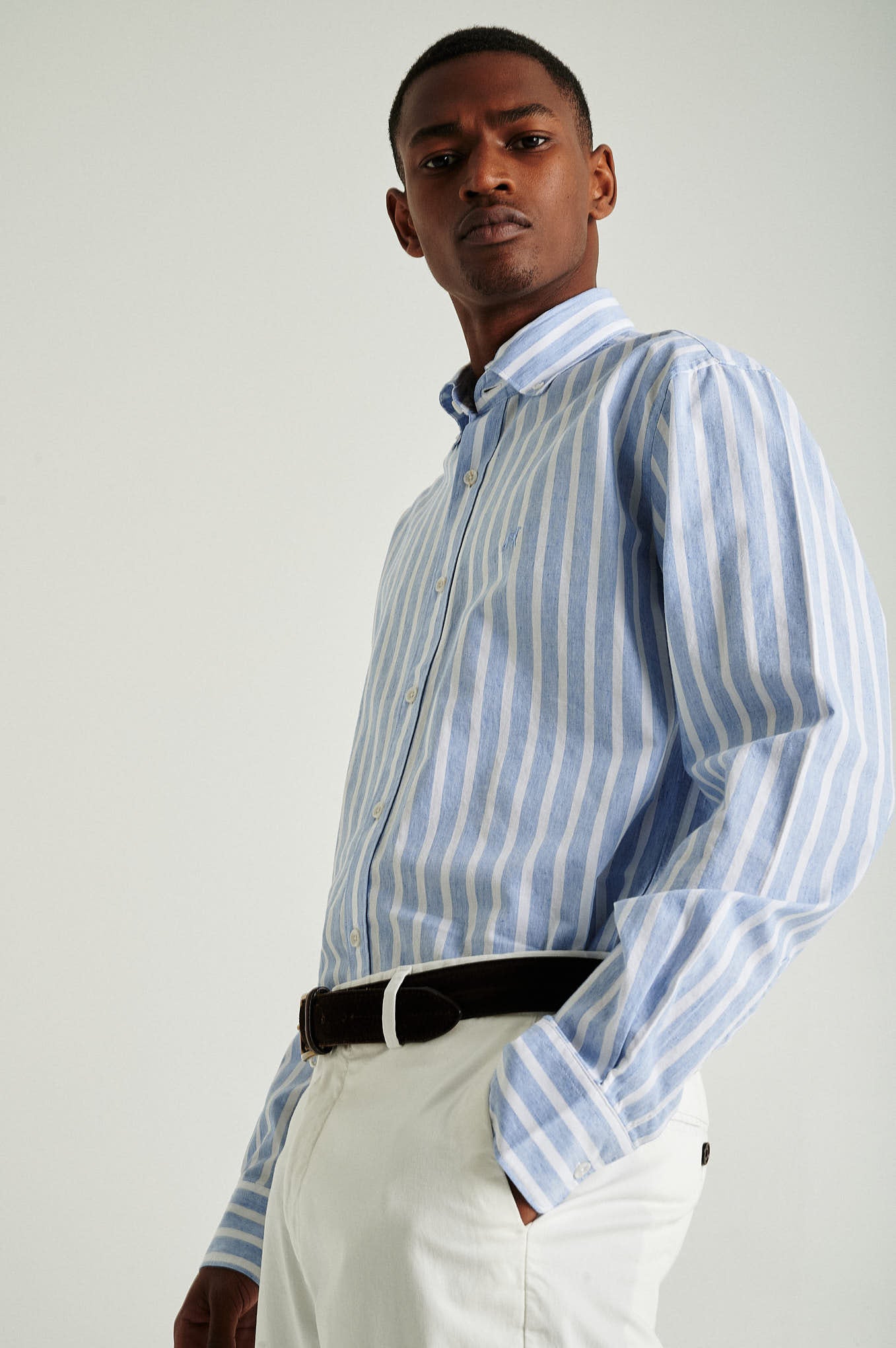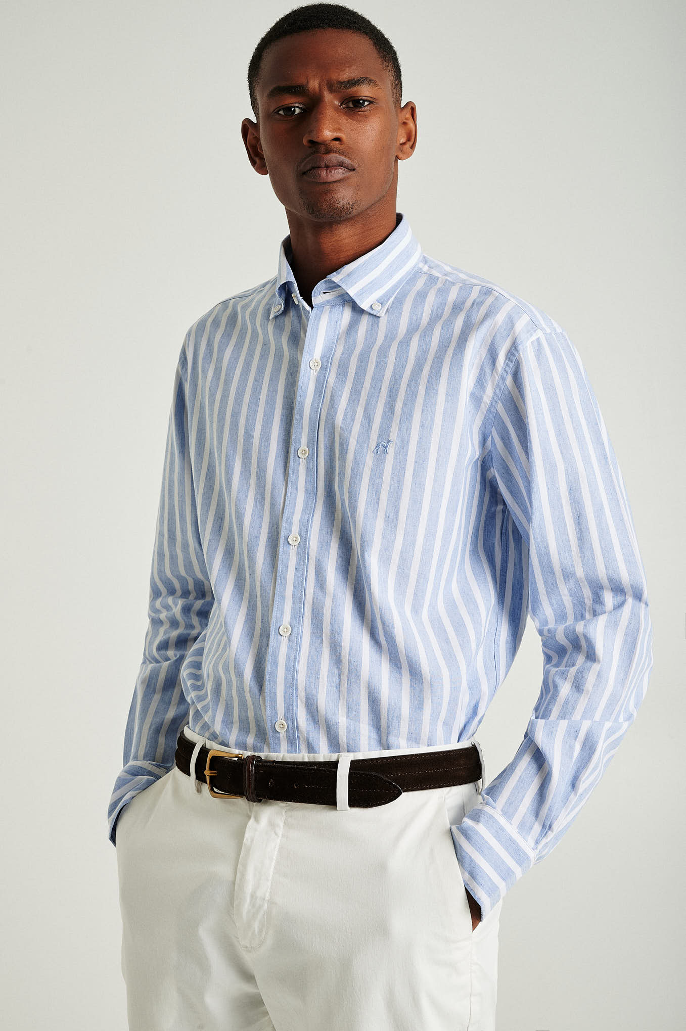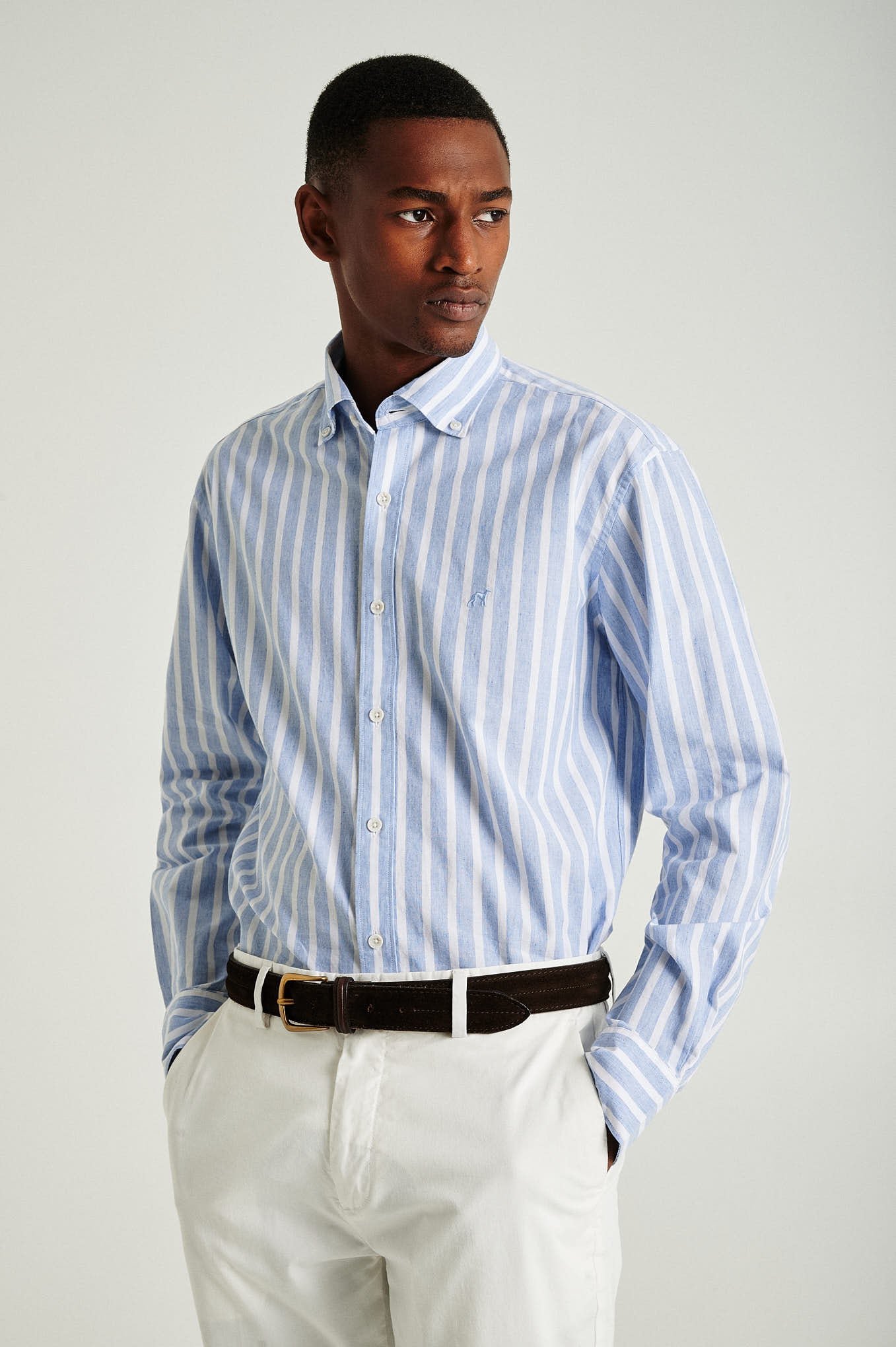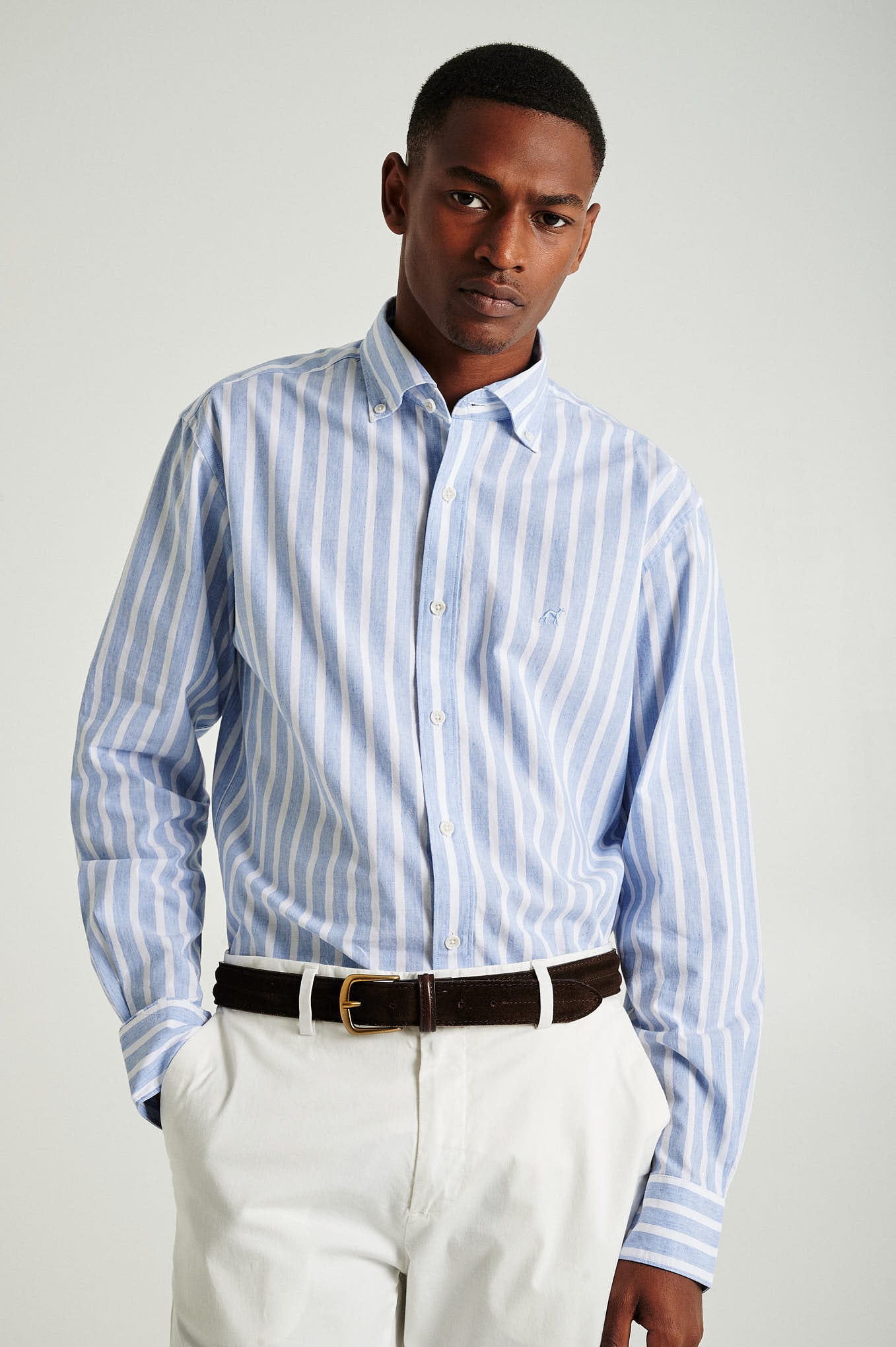Striped shirt in 100% Cotton. Features a slim fit button down collar. Long sleeves with rounded cuffs with 1 button. Piping in contrast color inside collar and cuffs. Chest embroidery matching body fabric.