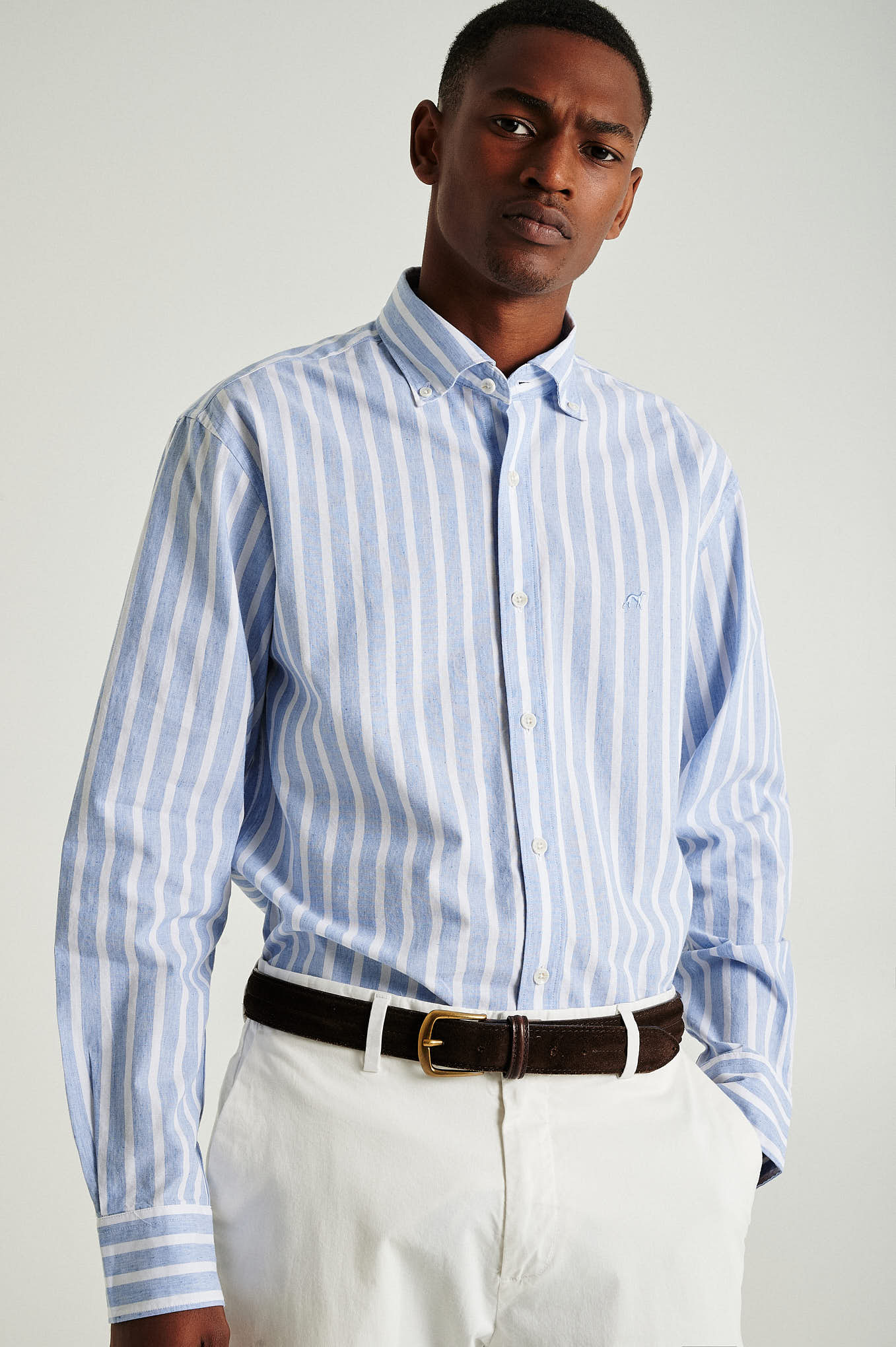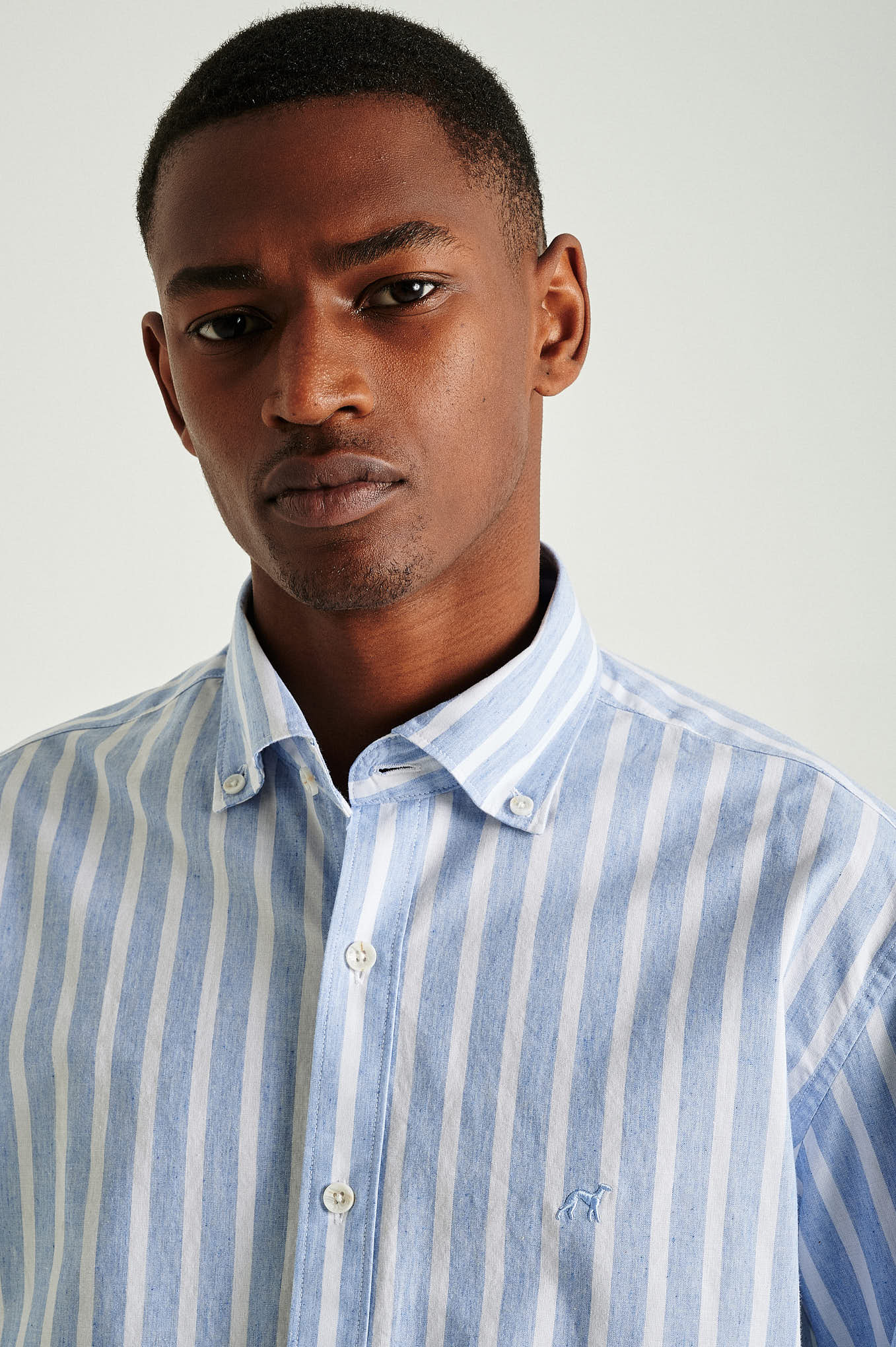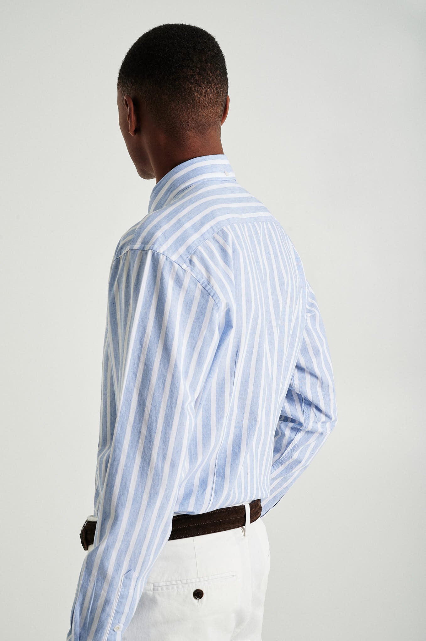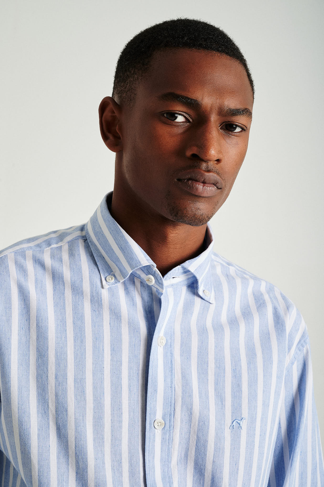 Striped shirt in 100% Cotton. Features a slim fit button down collar. Long sleeves with rounded cuffs with 1 button. Piping in contrast color inside collar and cuffs. Chest embroidery matching body fabric.