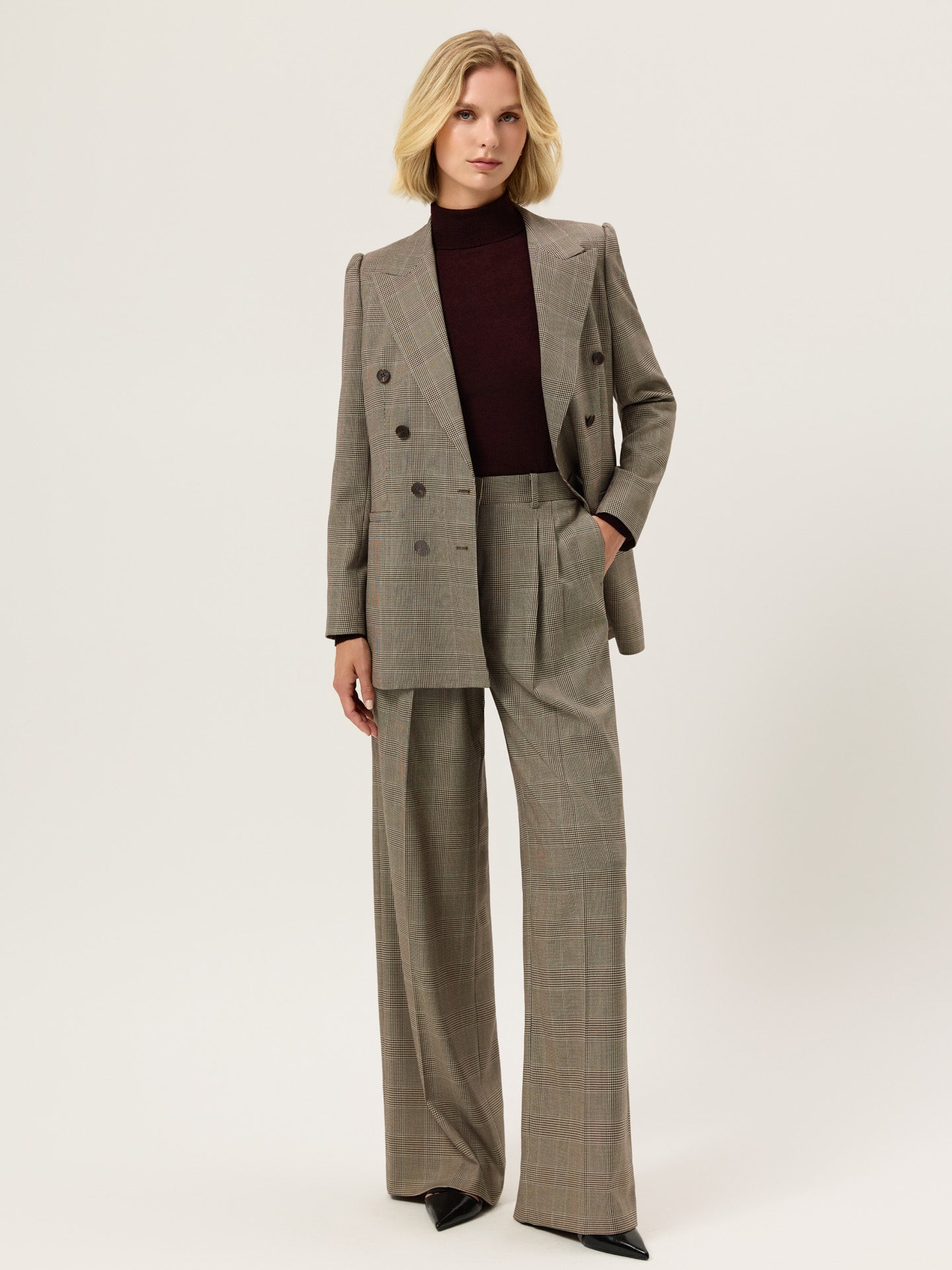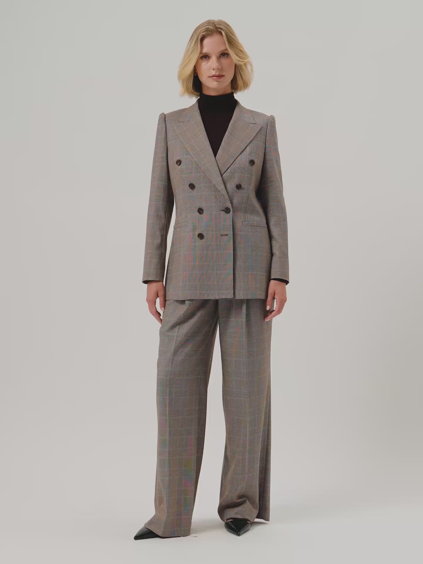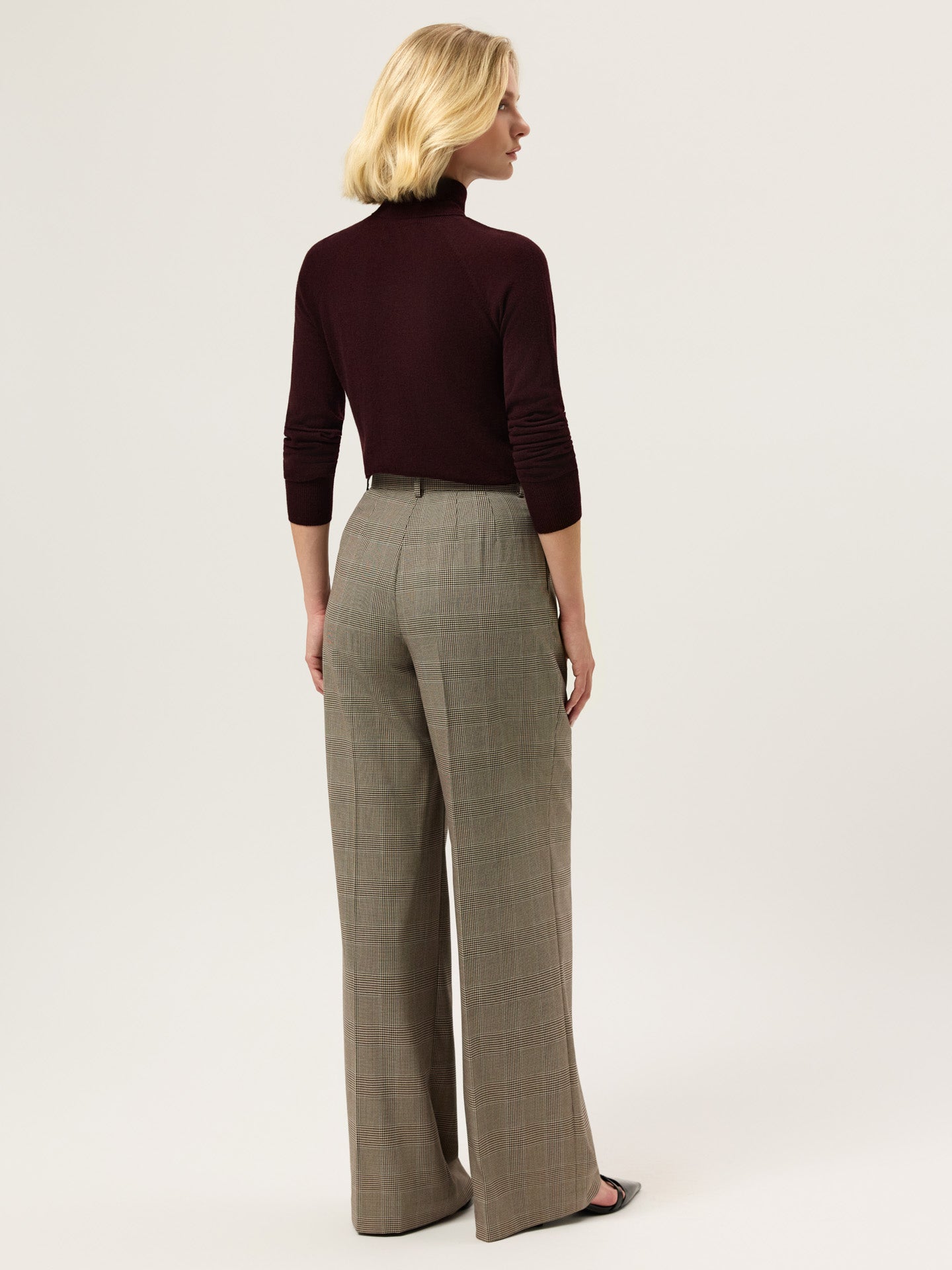 Creased high waist trousers expertly tailored from In Viscose Blend Checks fabric with loose fit and front pleats. Zip fly and hook and eye waistband fastening, knife pockets, welt back pockets and invisible hem.