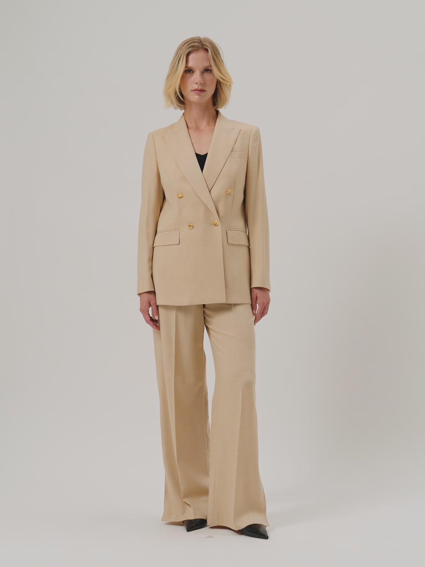 Creased high waist trousers expertly tailored from Wool blend Herringbone fabric with loose fit. Zip fly and hook and eye waistband fastening, side pockets, welt back pockets, and invisible hem.