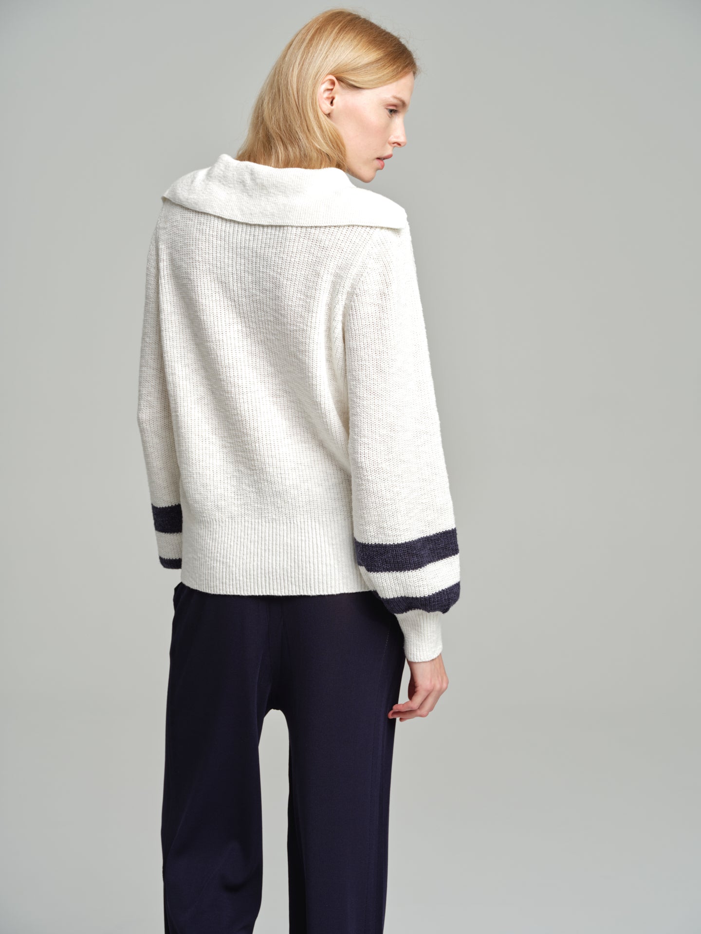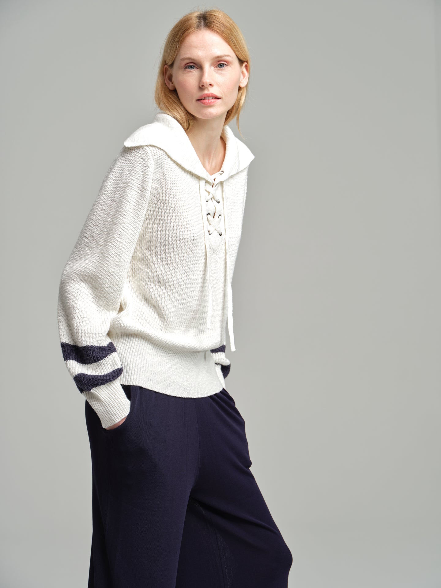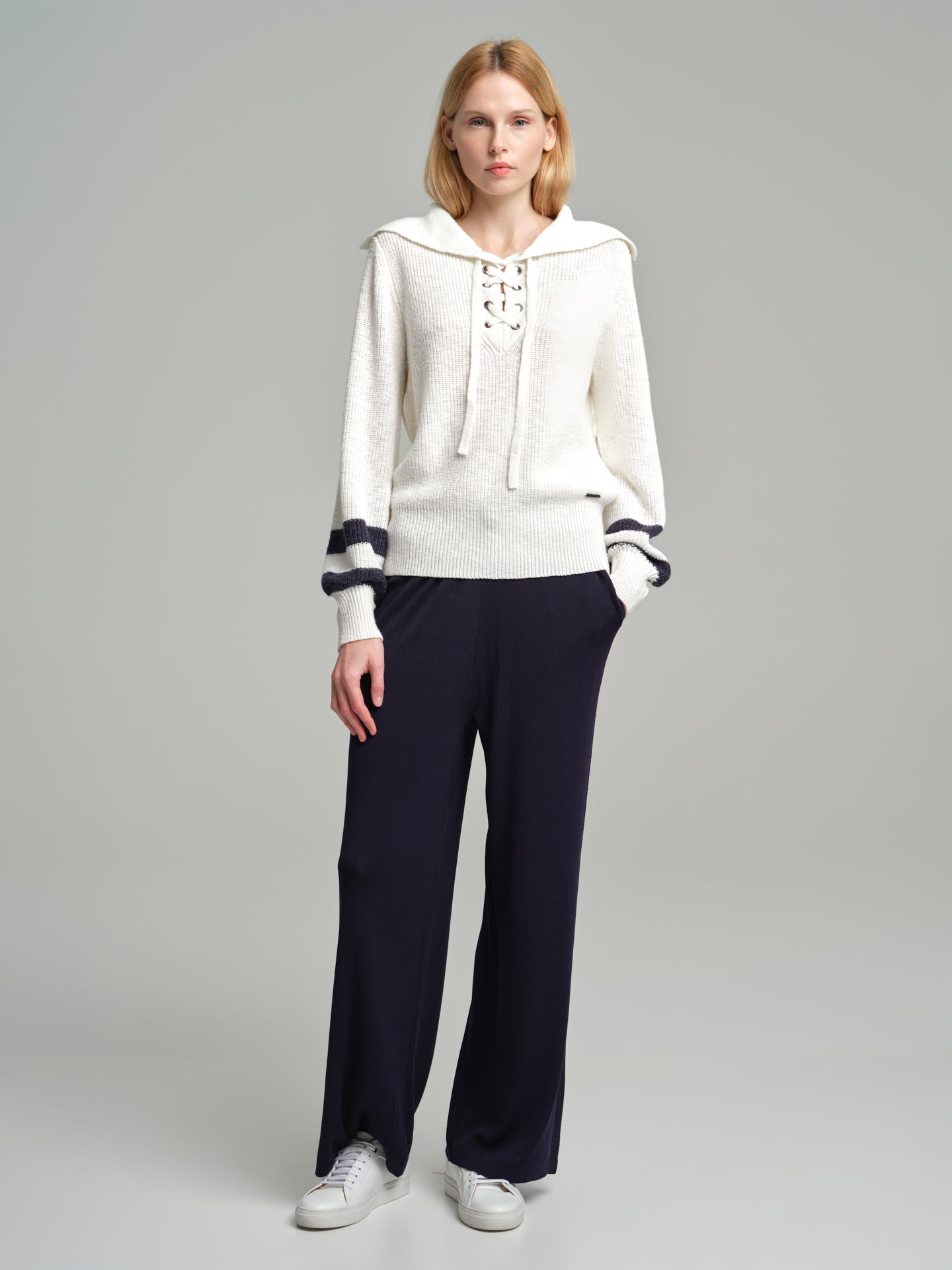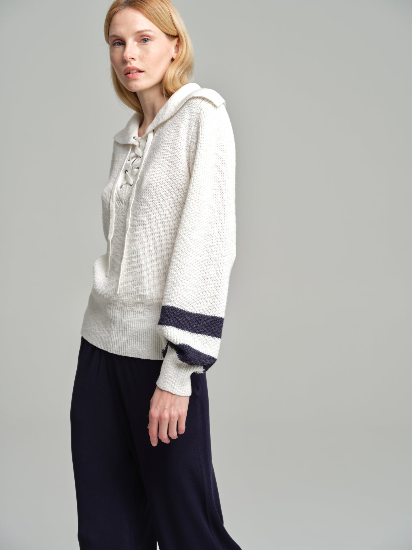 Navy sweater with tie neckline