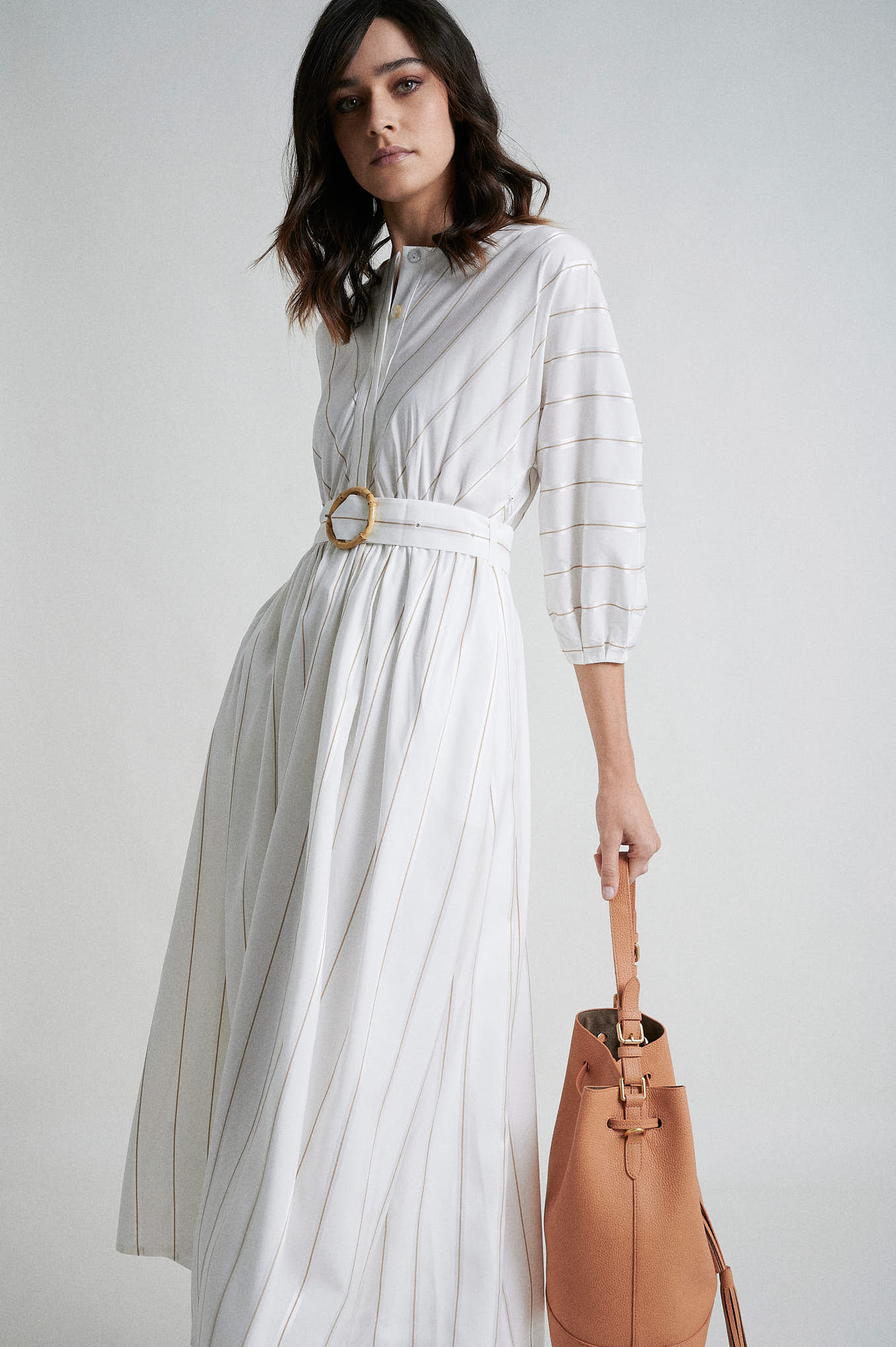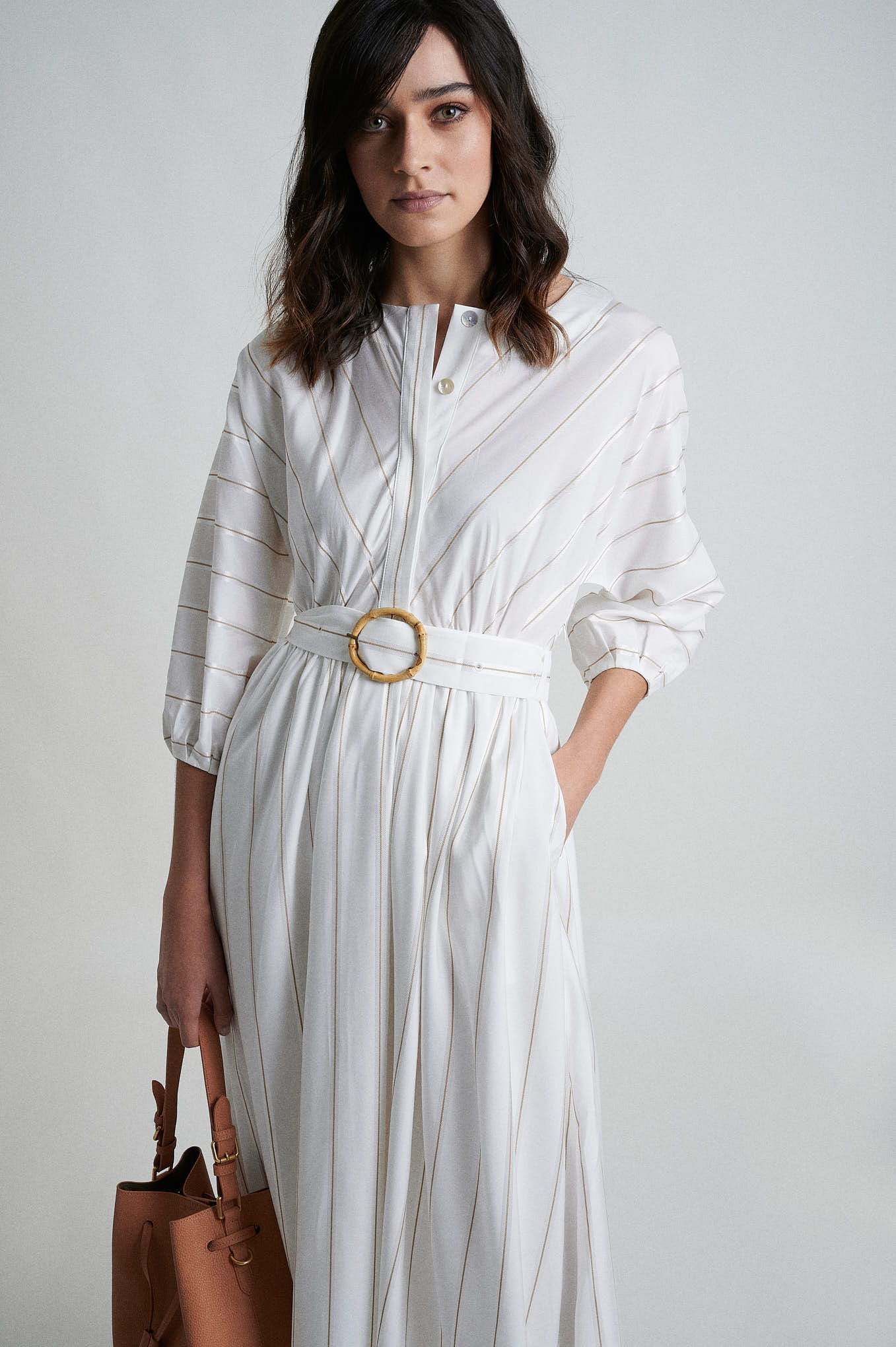 Dress with rounded neckline, front hidden placket buttons. A-line shape with 3/4 lenght ballon sleeve. Real Bamboo buckle at belt..Fabric with jacquard stripes..Matching items available.