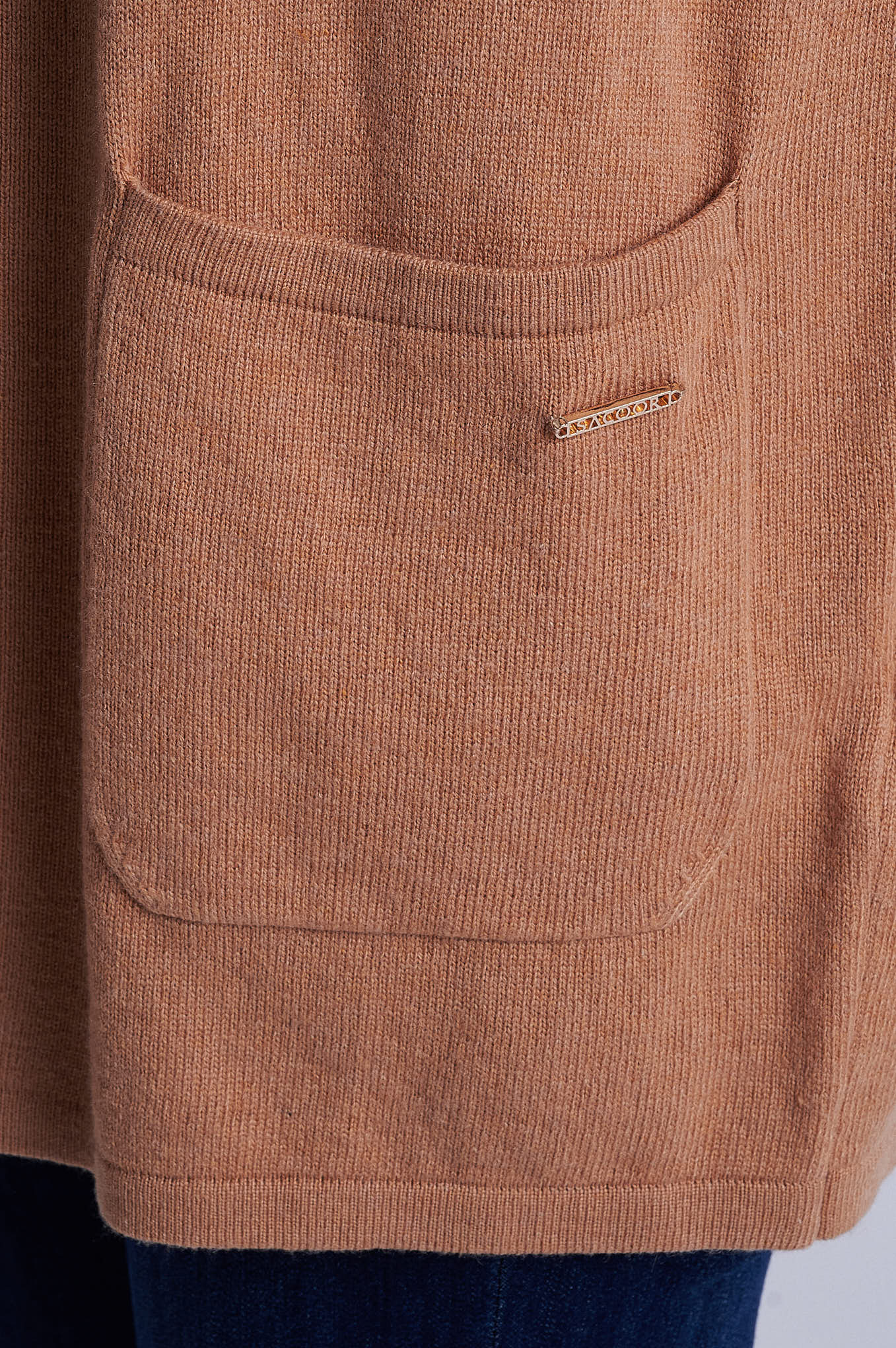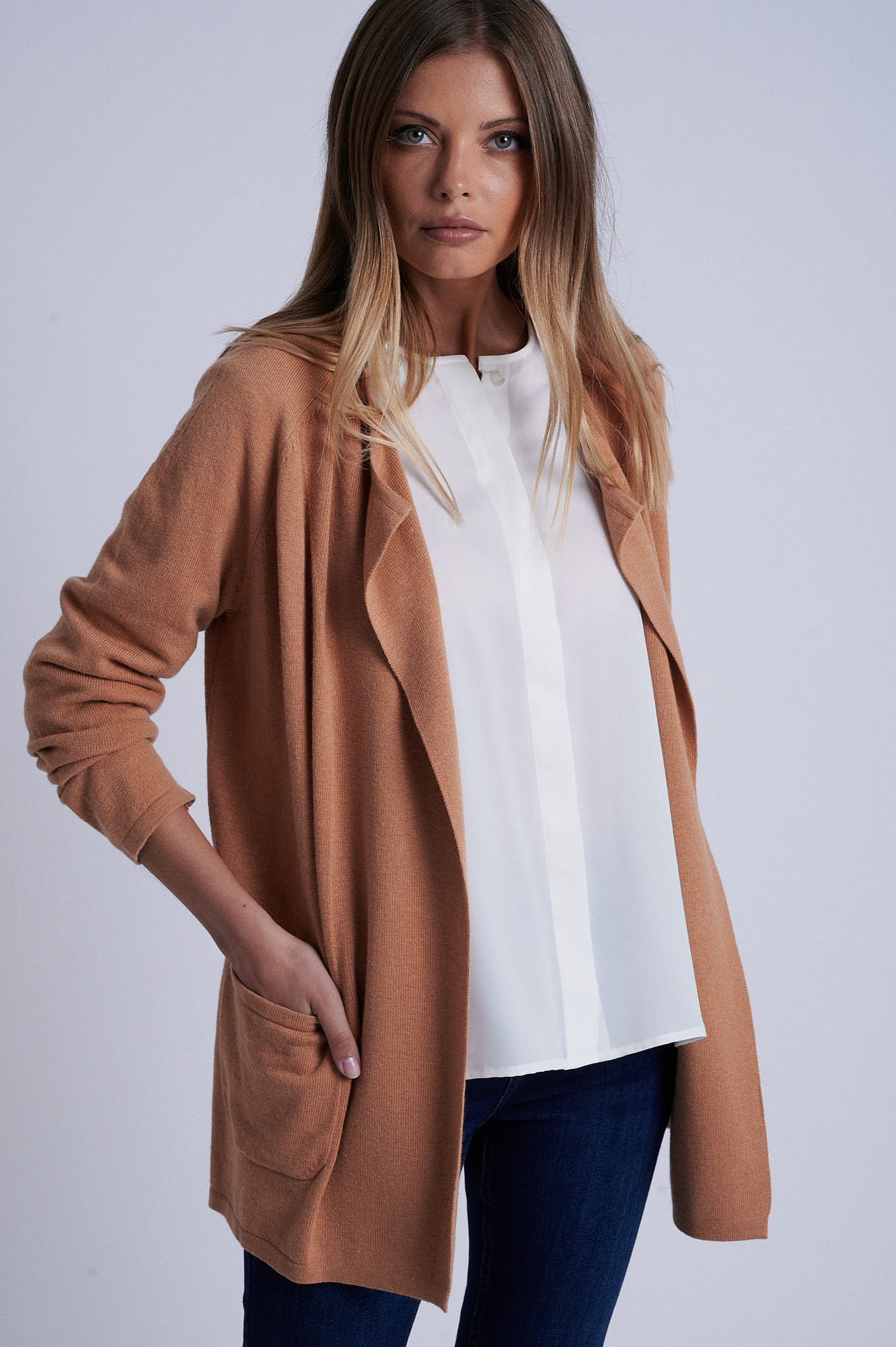 Long sleeve knitted coatigan in blended viscose, wool and cashmere. Brand's personalized metal plate.