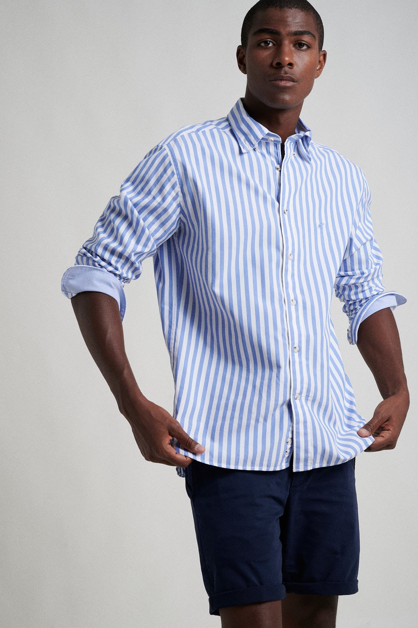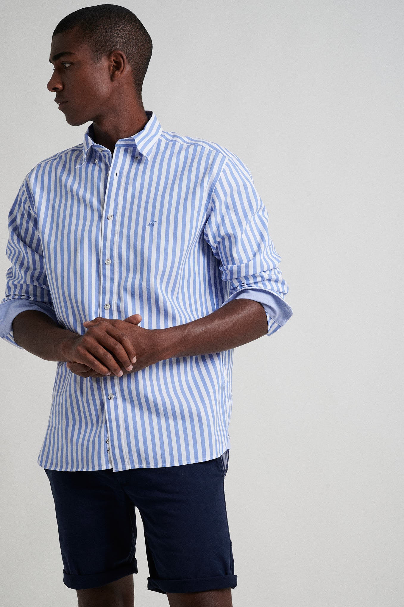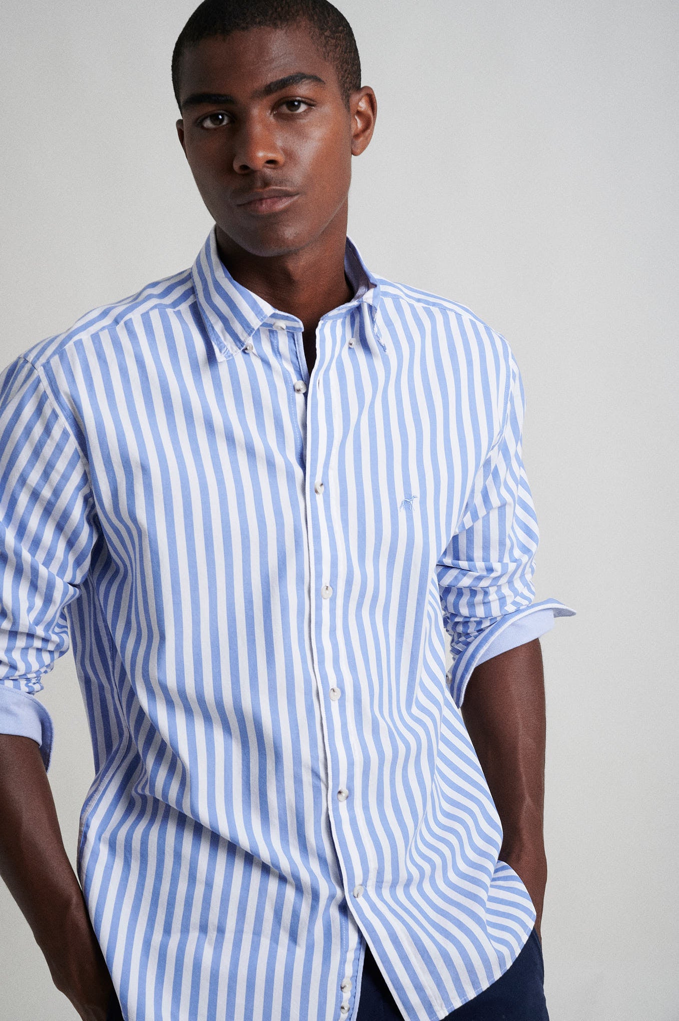 Striped shirt made of 100% cotton. Features a regular fit with Button down collar. Long sleeves with rounded cuffs with 1 button. Contrast fabric inside collar stand and cuffs. Side gussets in contrast fabric with personalized '1989' embroidery. Chest embroidery in contrast color.