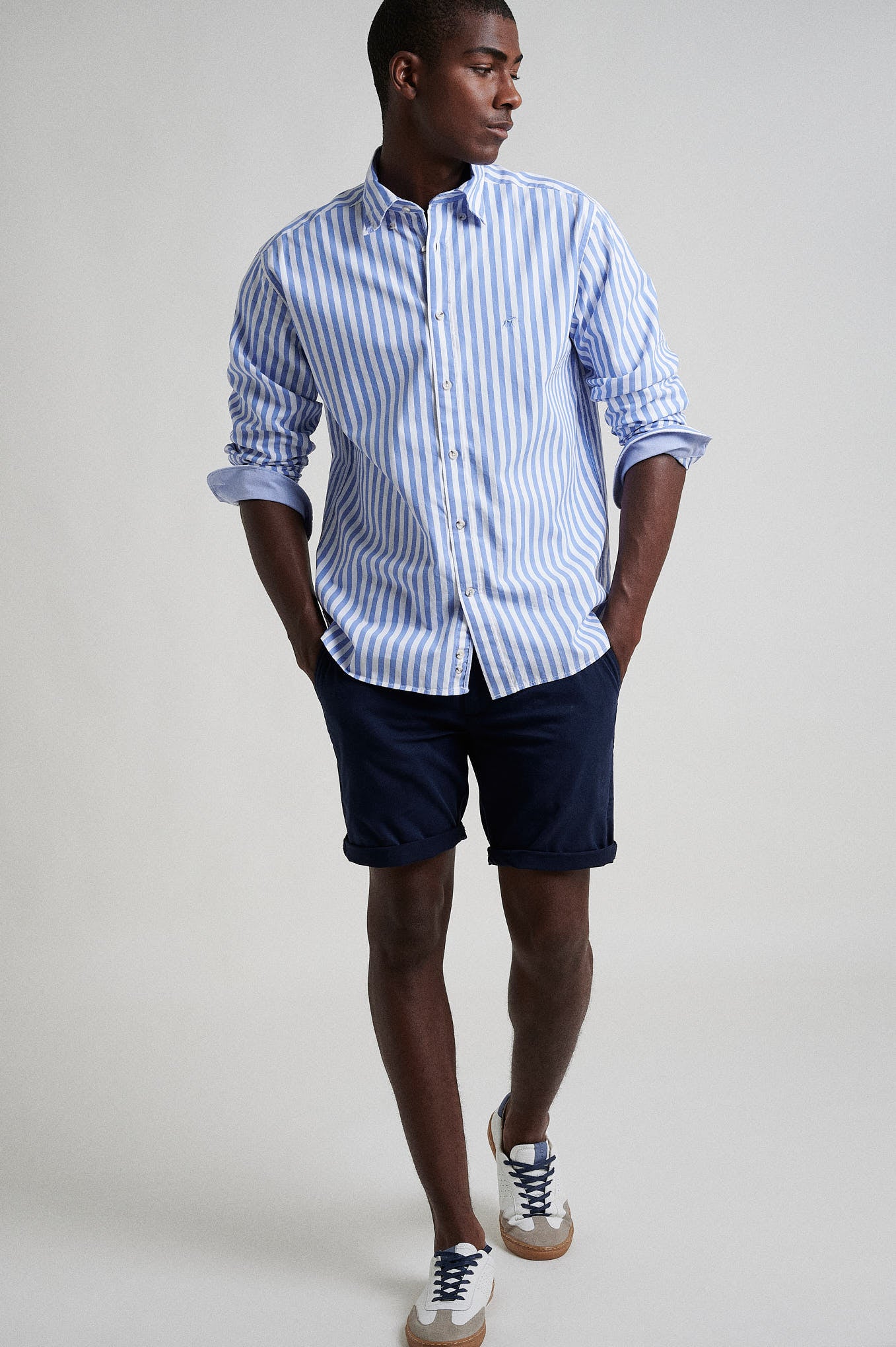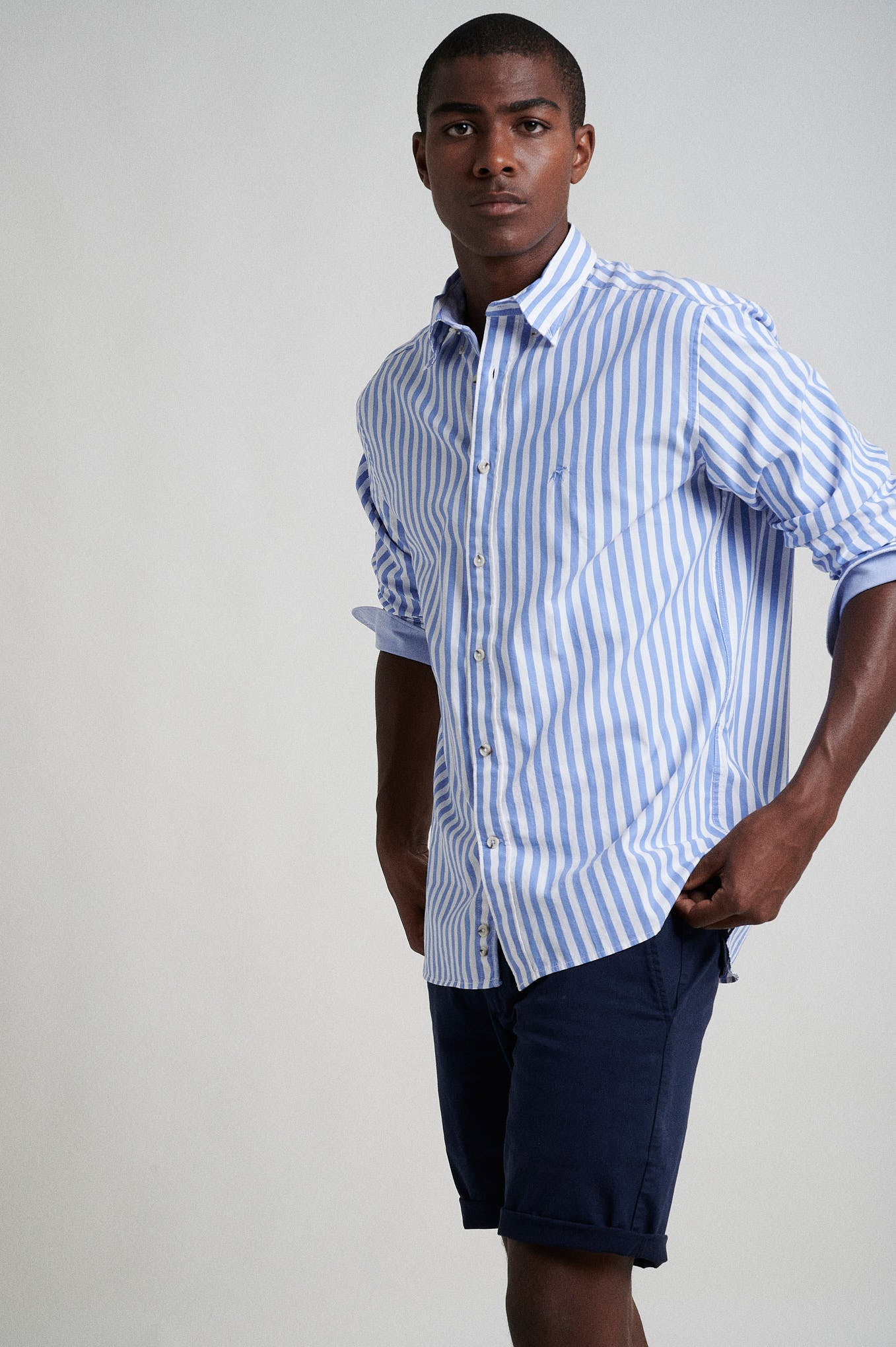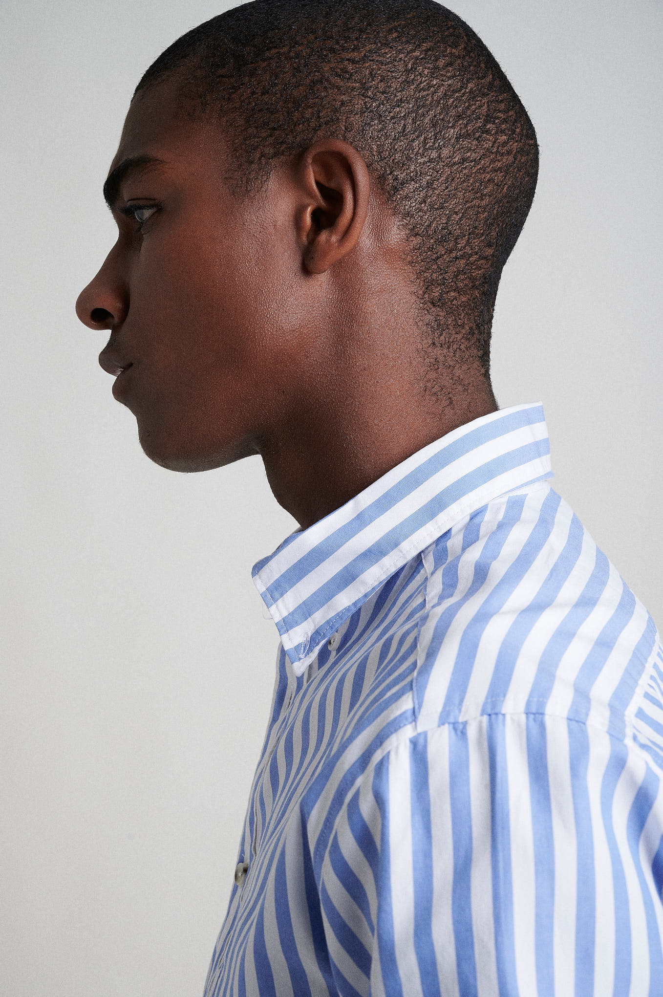 Striped shirt made of 100% cotton. Features a regular fit with Button down collar. Long sleeves with rounded cuffs with 1 button. Contrast fabric inside collar stand and cuffs. Side gussets in contrast fabric with personalized '1989' embroidery. Chest embroidery in contrast color.