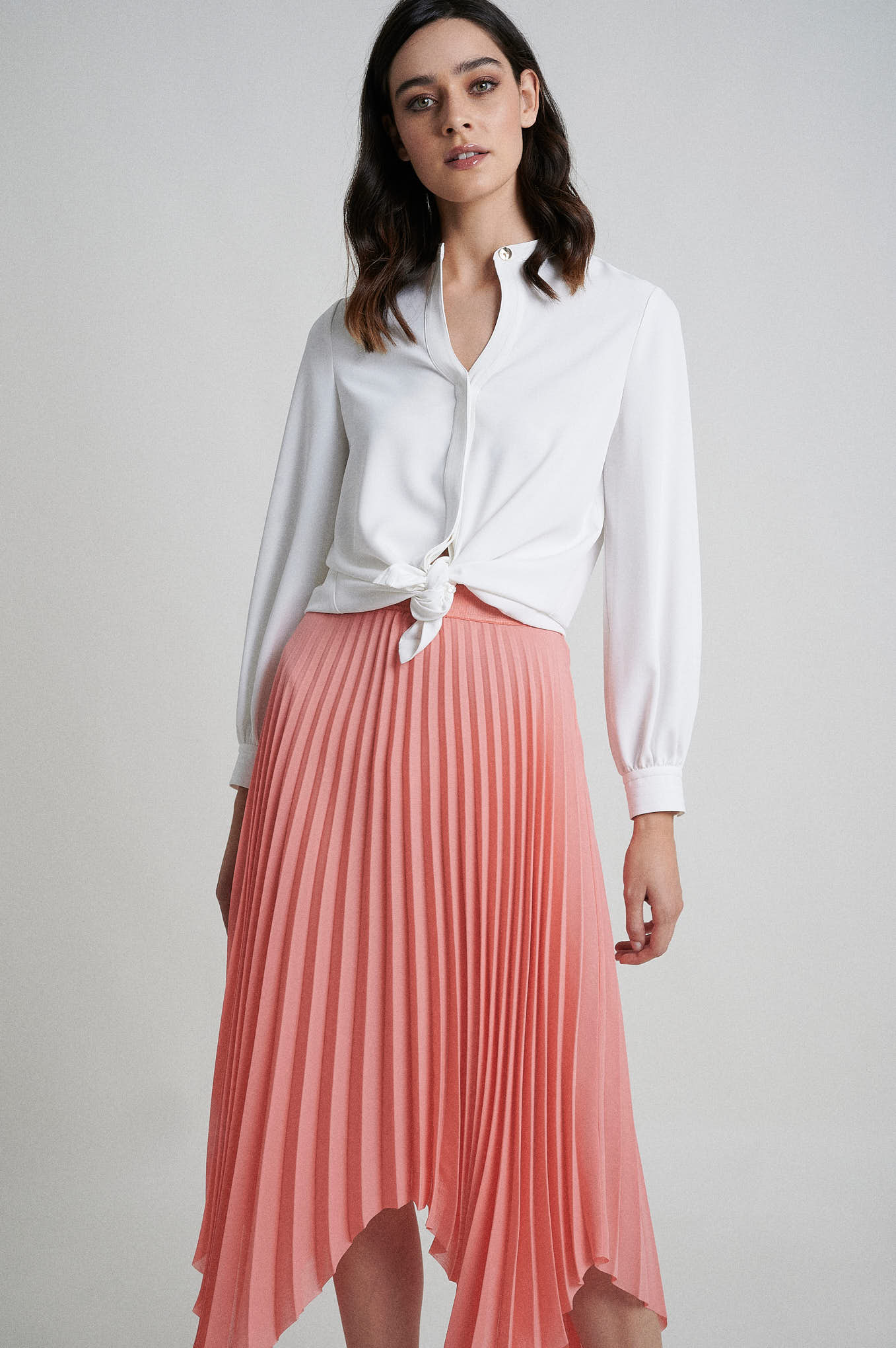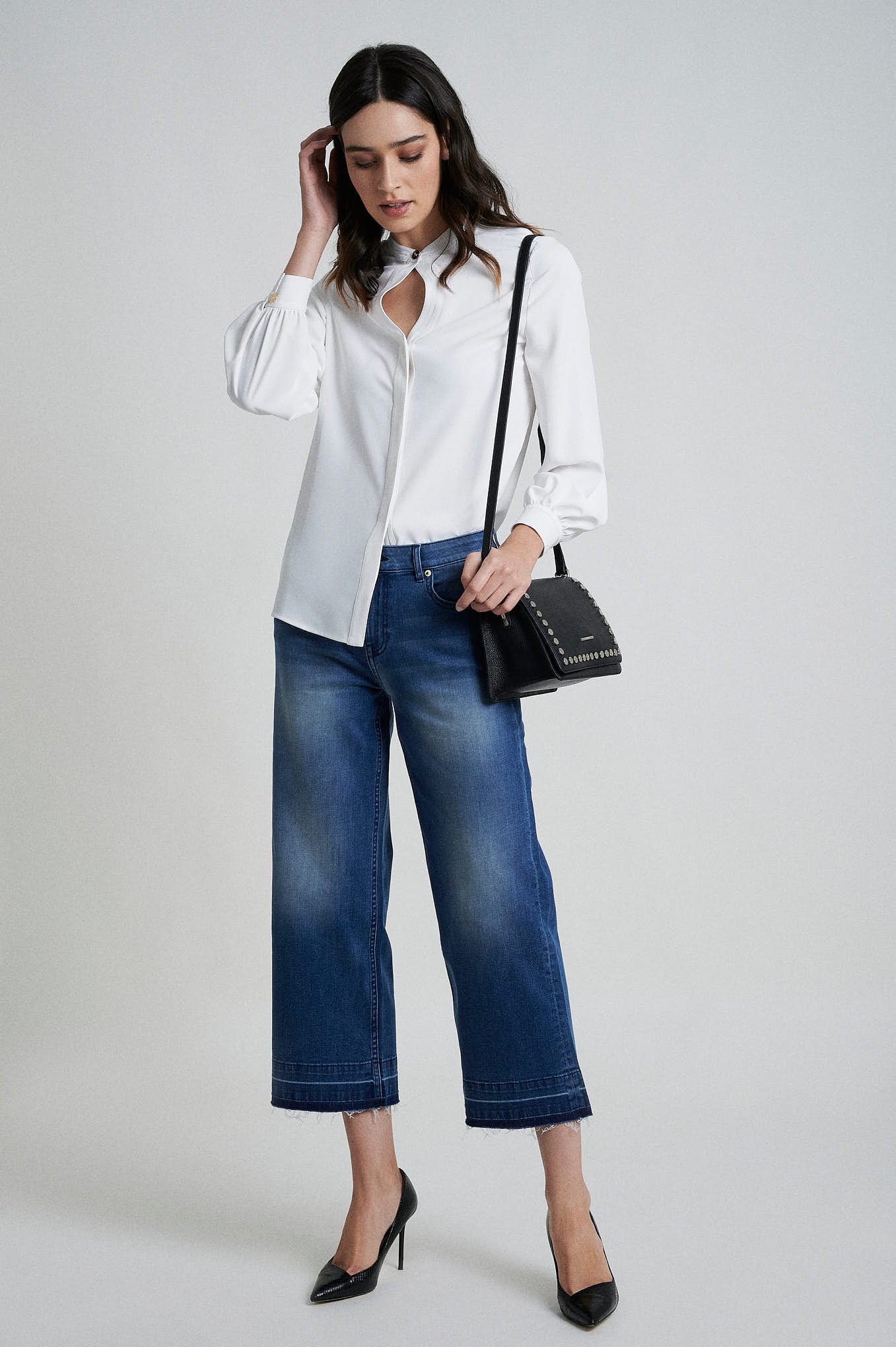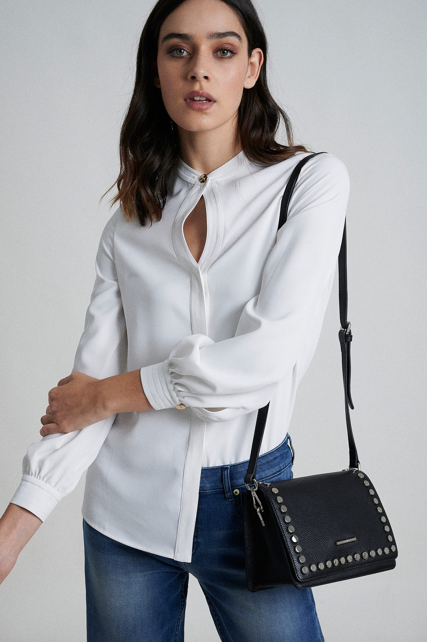 Straight fit blouse. Features a rounded collar with a front opening. Concealed placket with buttons fastening. Long bishop sleeve. Personalized metal plate at front.