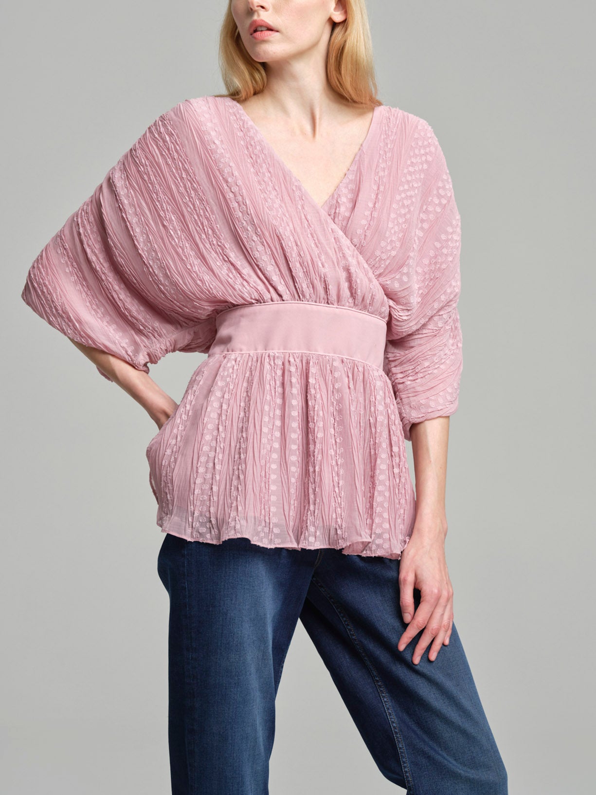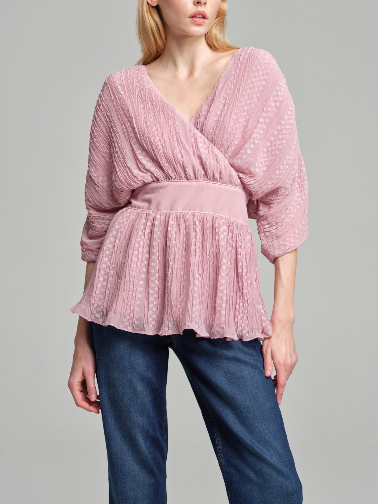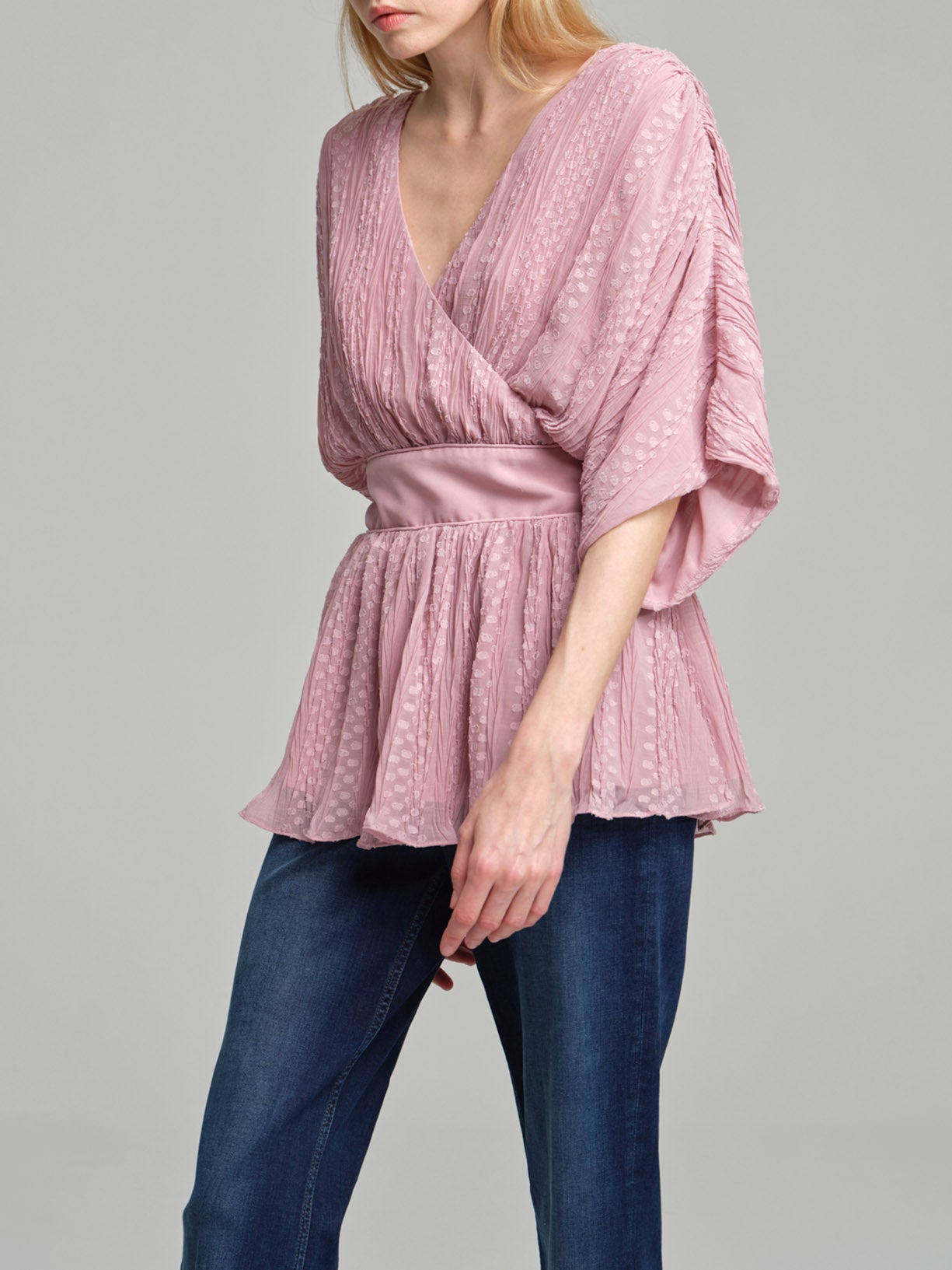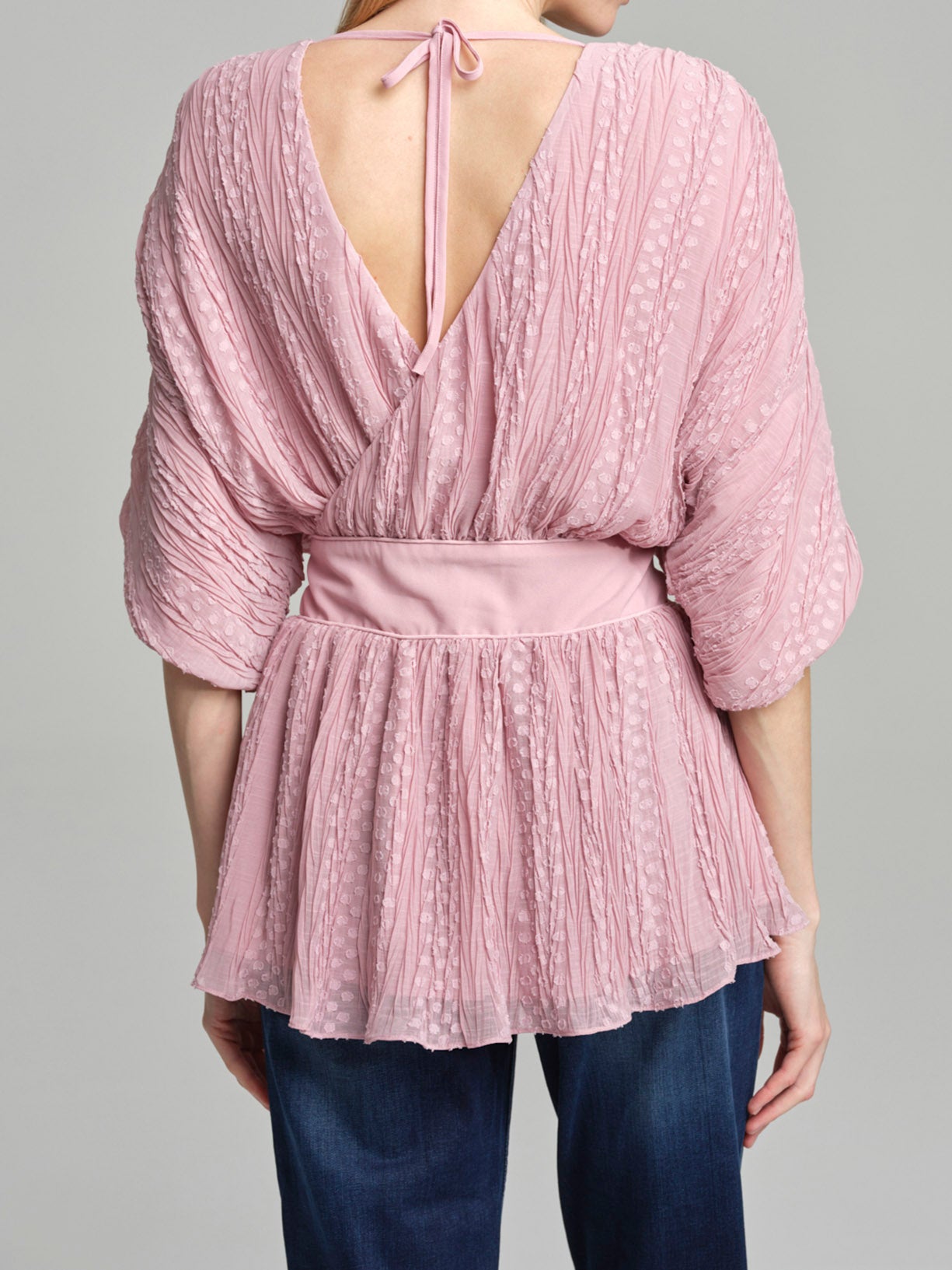 Fancy loose pleated top with wrap effect for a relaxed, trendy look. Elastic on waistband giving it shape and back bow tie.