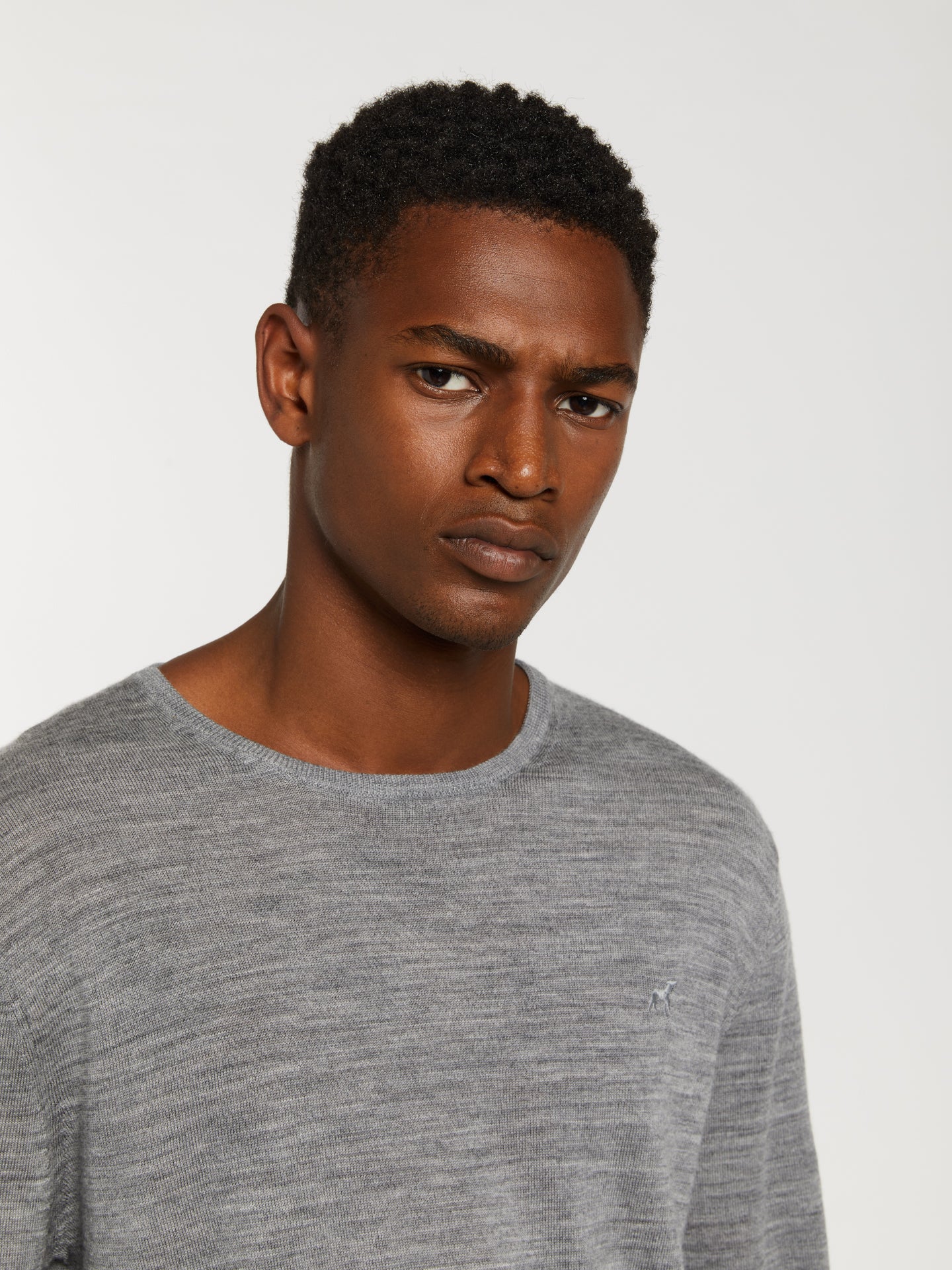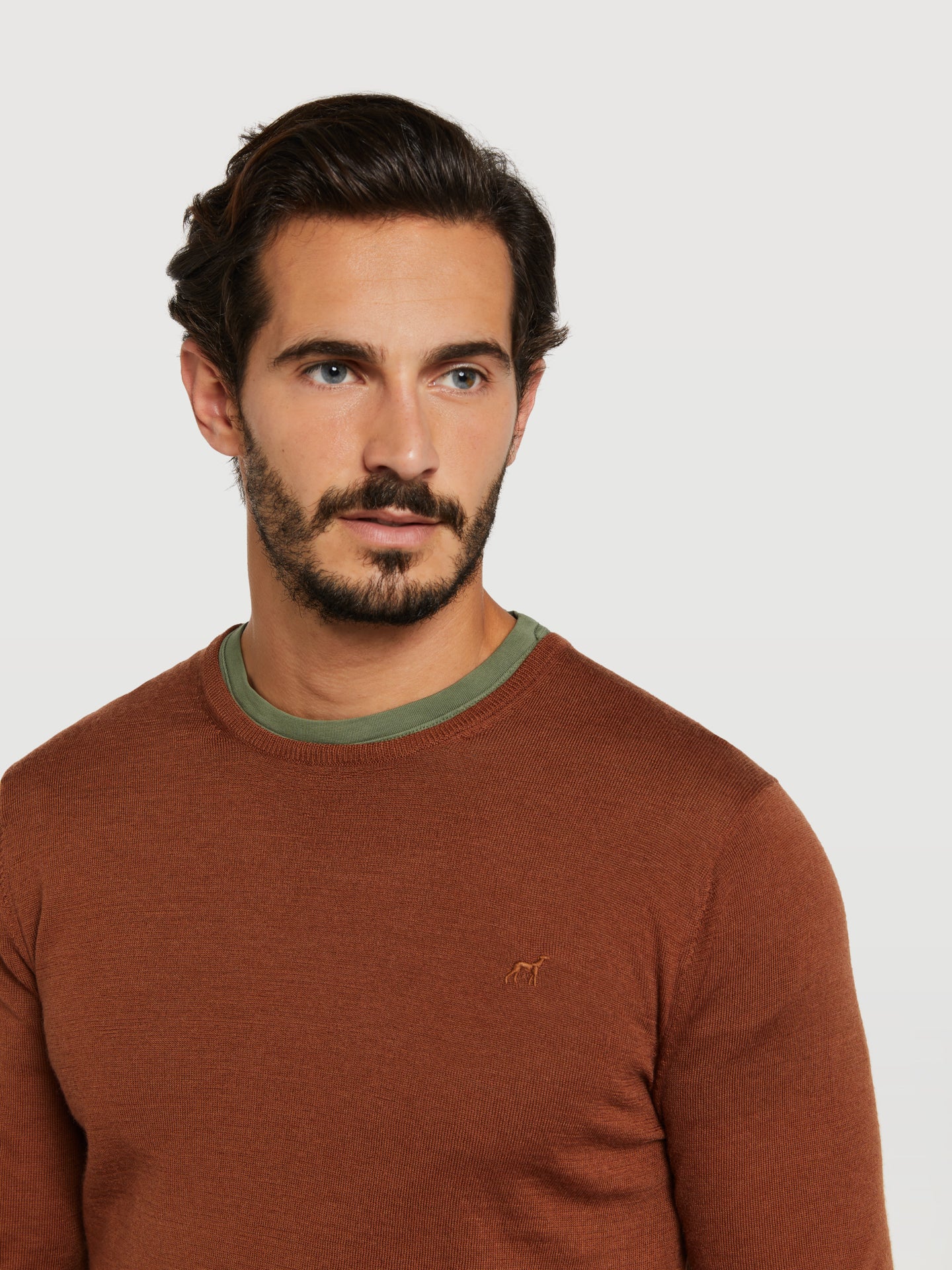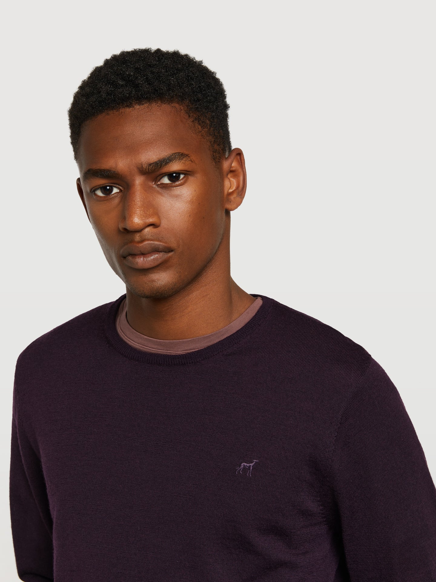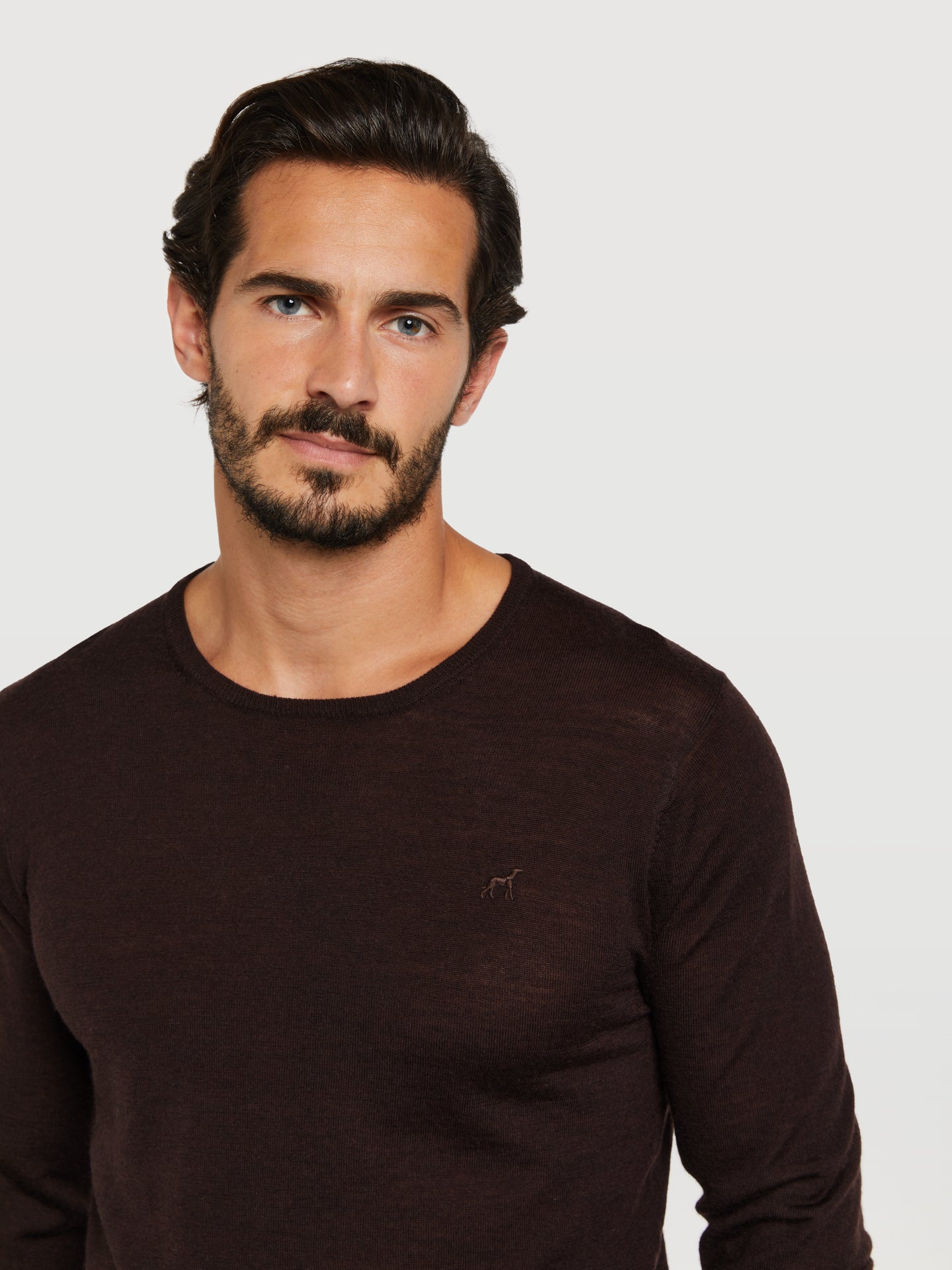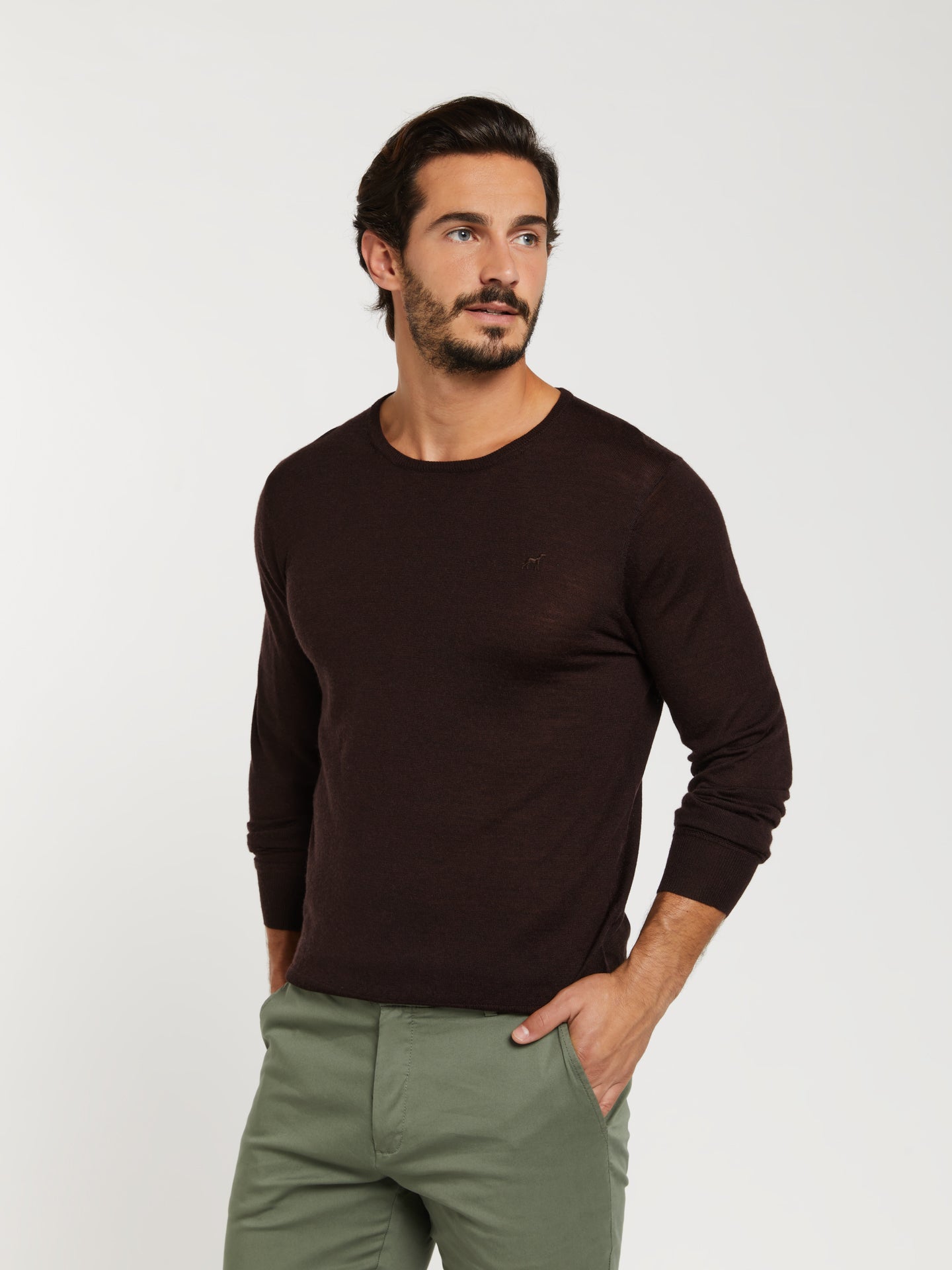 Long sleeve crew neck sweater with chest logo embroidery. This garment is made with 100% Extra Fine Merino Wool.