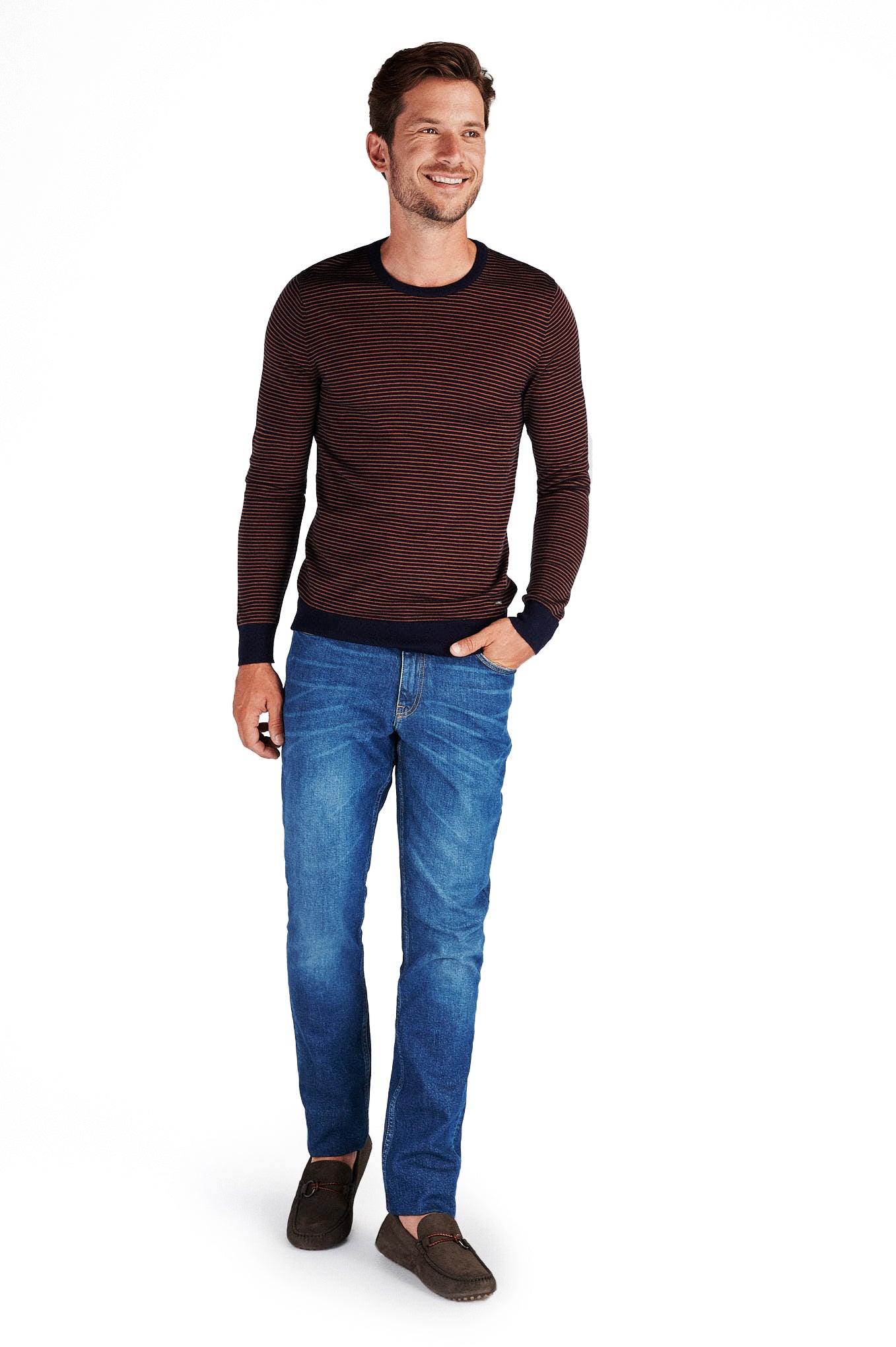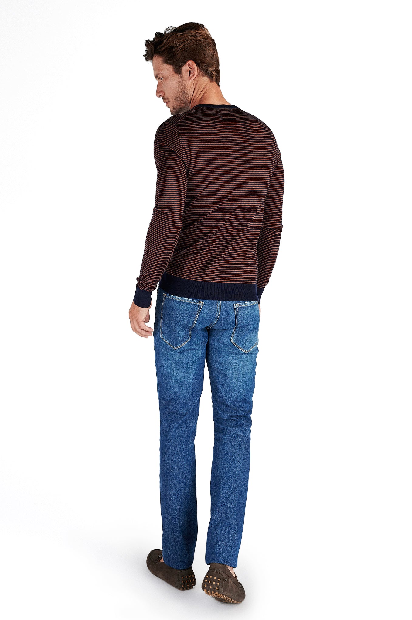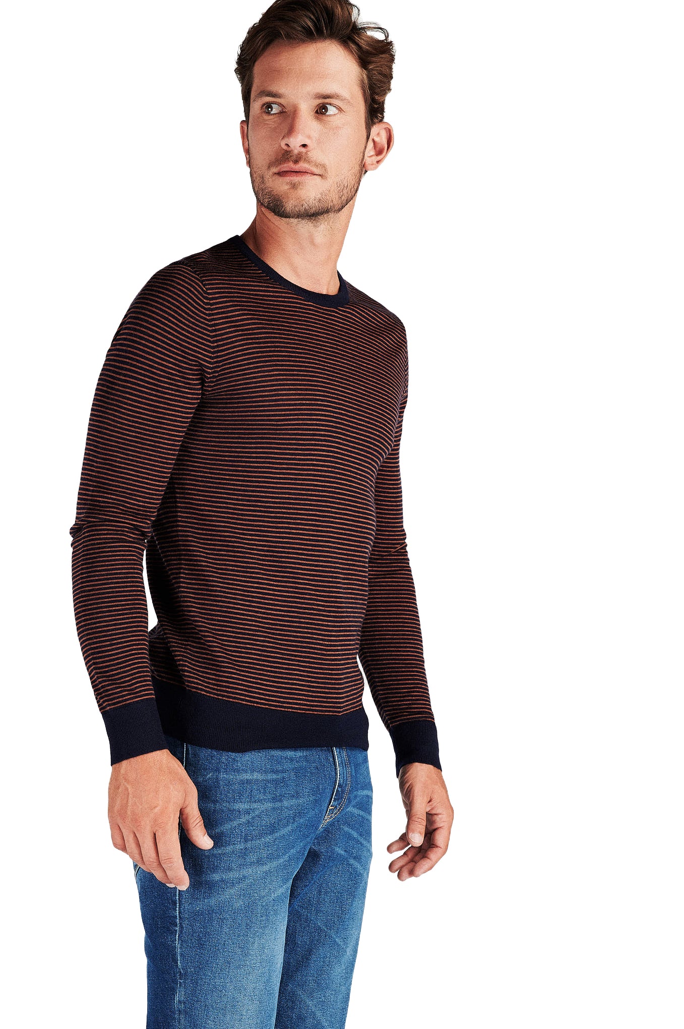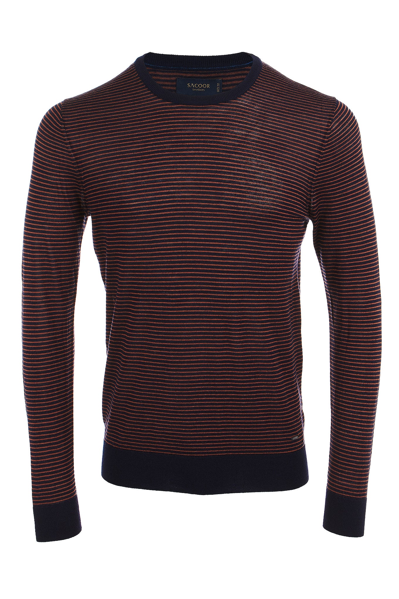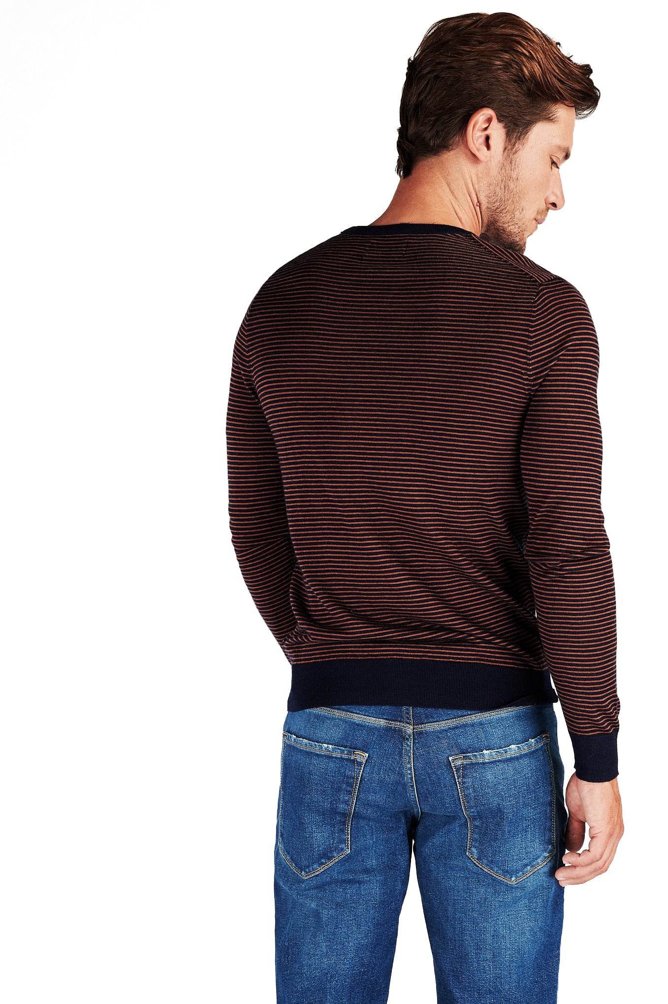 Knitted sweater for men, with reliefed texture, with a striped pattern. Regular cut, wider silhouette. Rounded neckline and ribbed finishes. Set fine mesh 12-14, very soft, in 100% mercerized merino wool. Small plate with brand customization, mother-of-pearl effect, at the base of the piece.A merino is able to keep the ideal body temperature constant. When used in situations of cold or heat, the thermal index in the body remains stable. The mercerized finish gives it a touch of brightness and greater resistance.