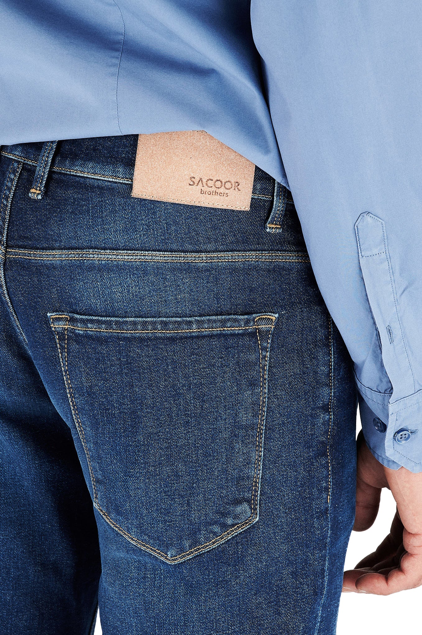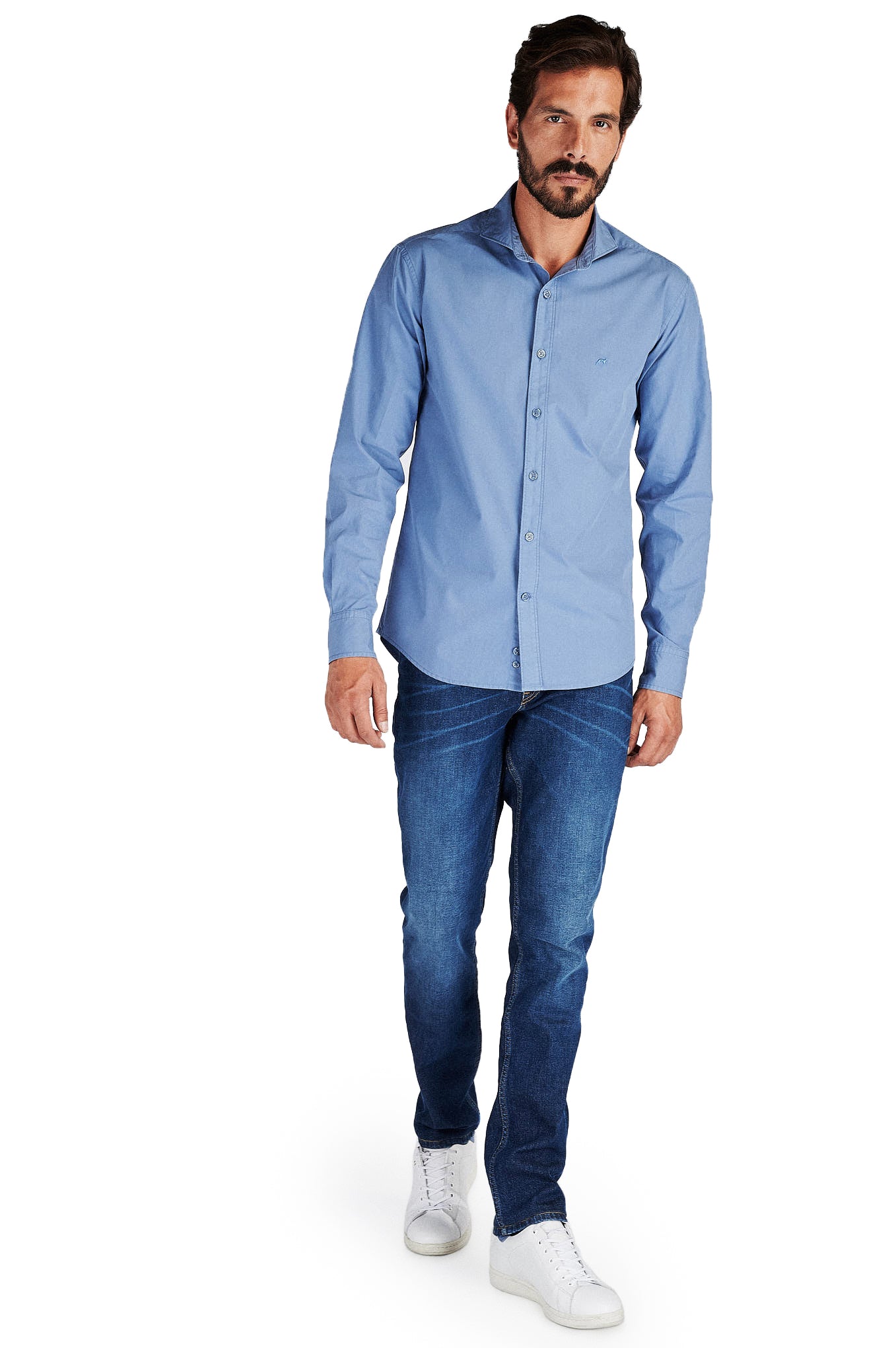 Men's jeans in cotton and elastane for more confort and elasticity.Low waist.A daily versatile piece with the prestige of manufacture in Portugal.Two side pockets and small one for coins.Two pockets in the back part.With zip and button.They are part of the Respekt Line,made with eco-friendly processes and raw materials. Available at Sacoor Brothers online store.