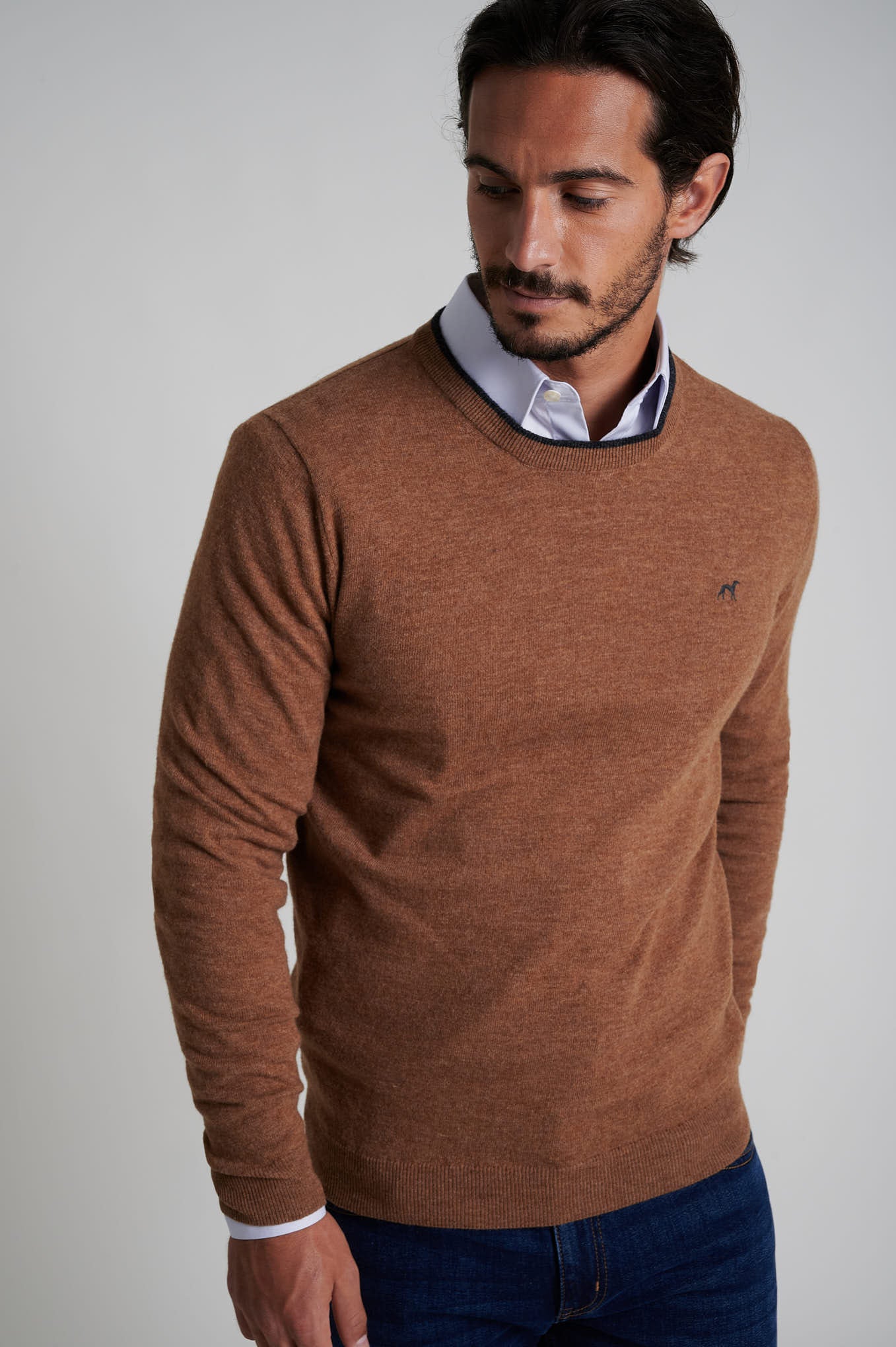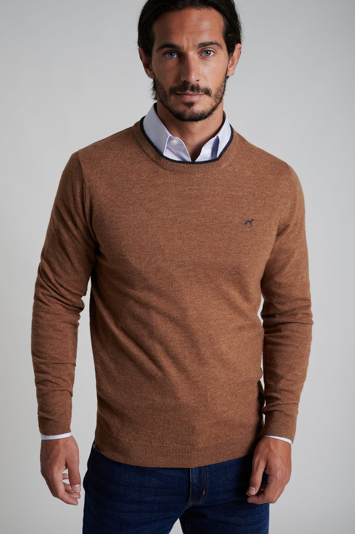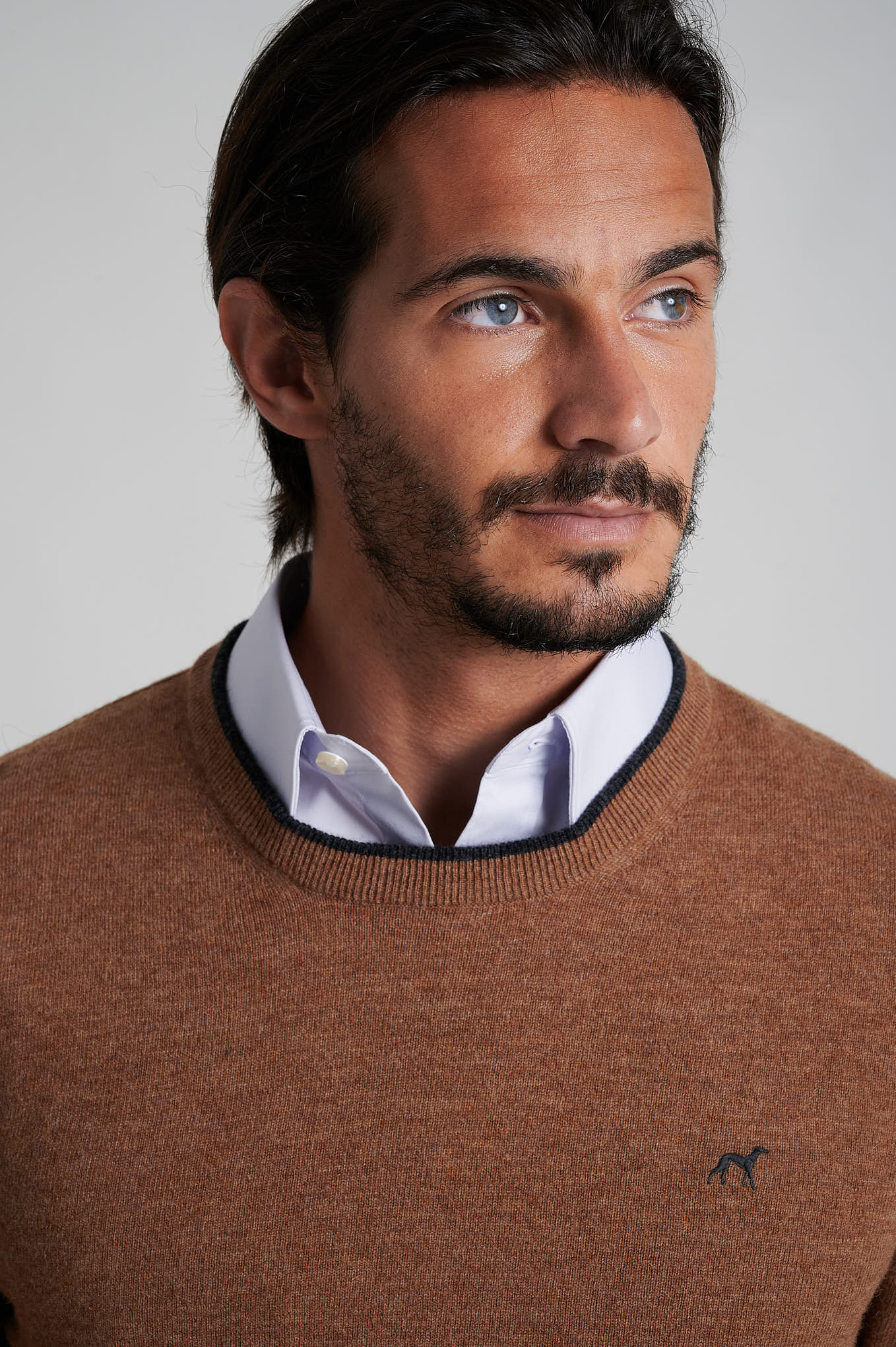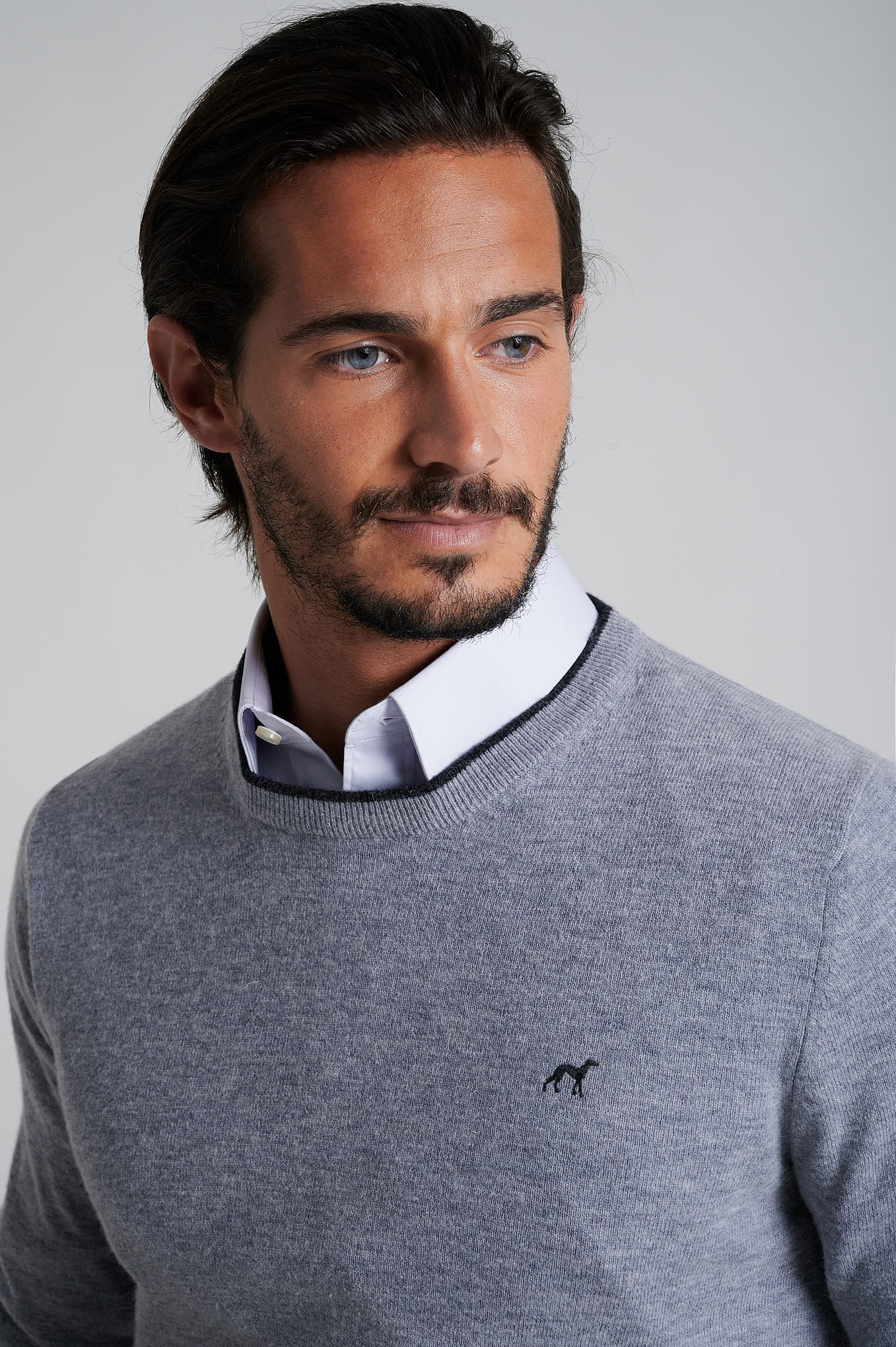 Long sleeve round neck sweater in blended lambswool/nylon. Features contrast color on collar matching with personalized chest embroidery.