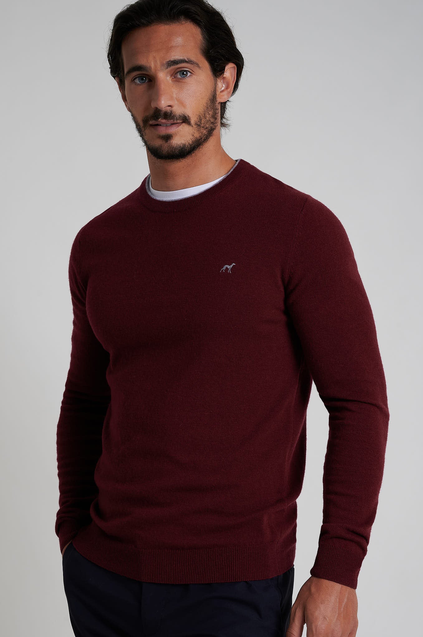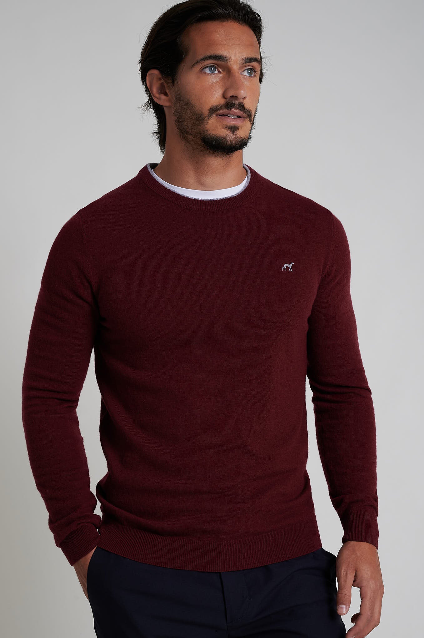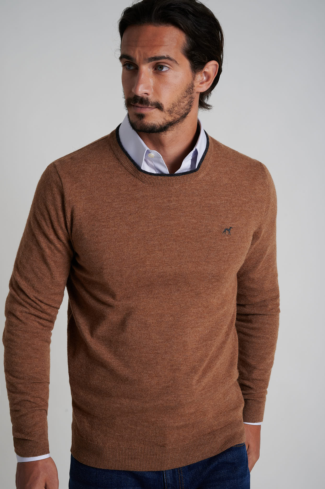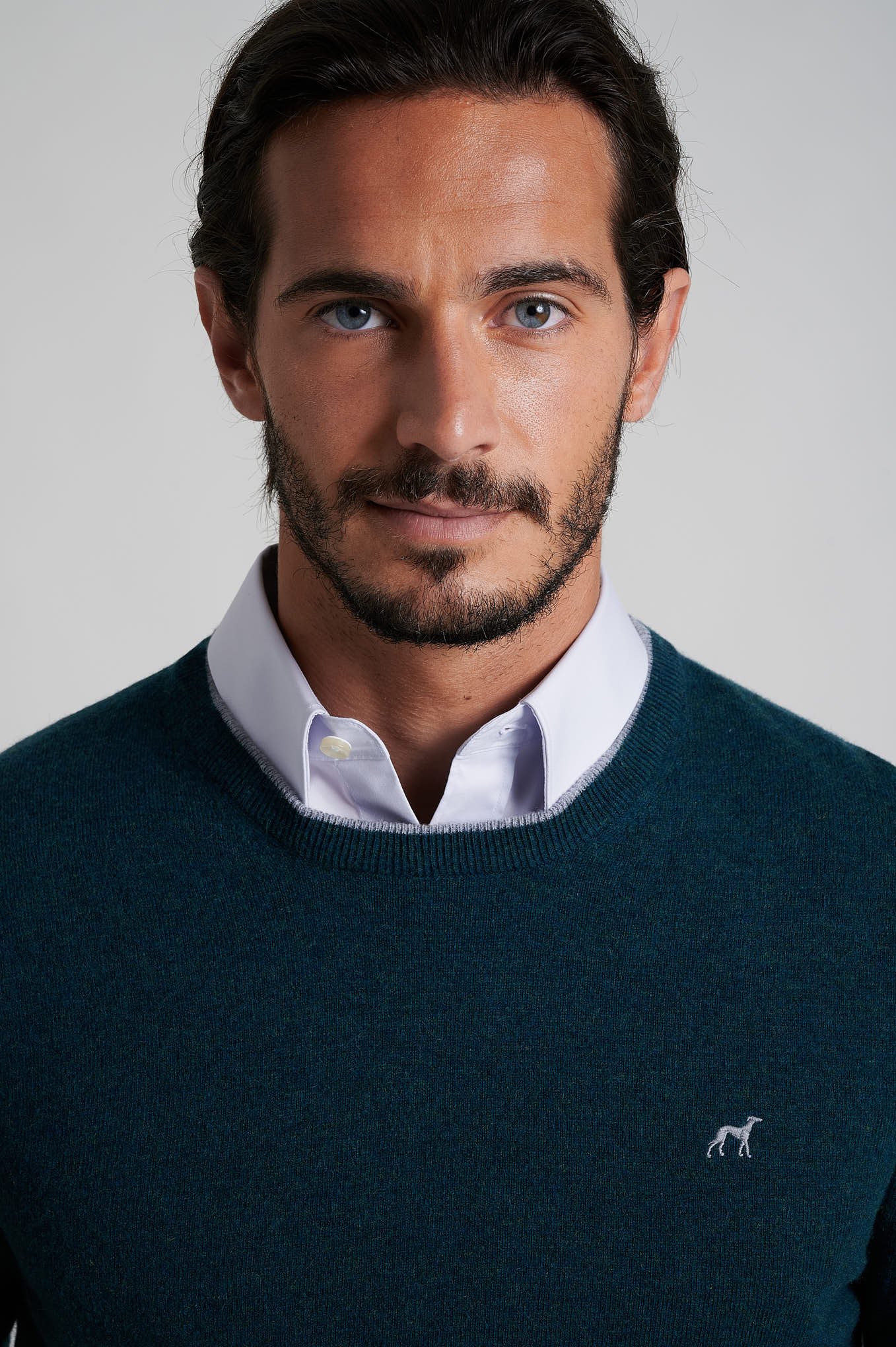 Long sleeve round neck sweater in blended lambswool/nylon. Features contrast color on collar matching with personalized chest embroidery.