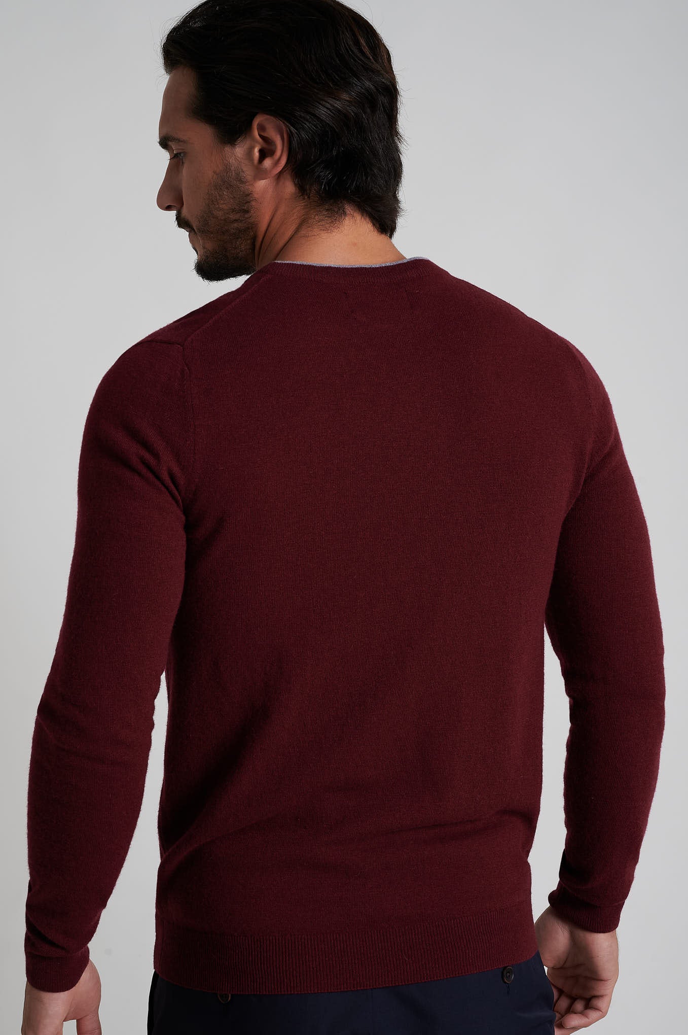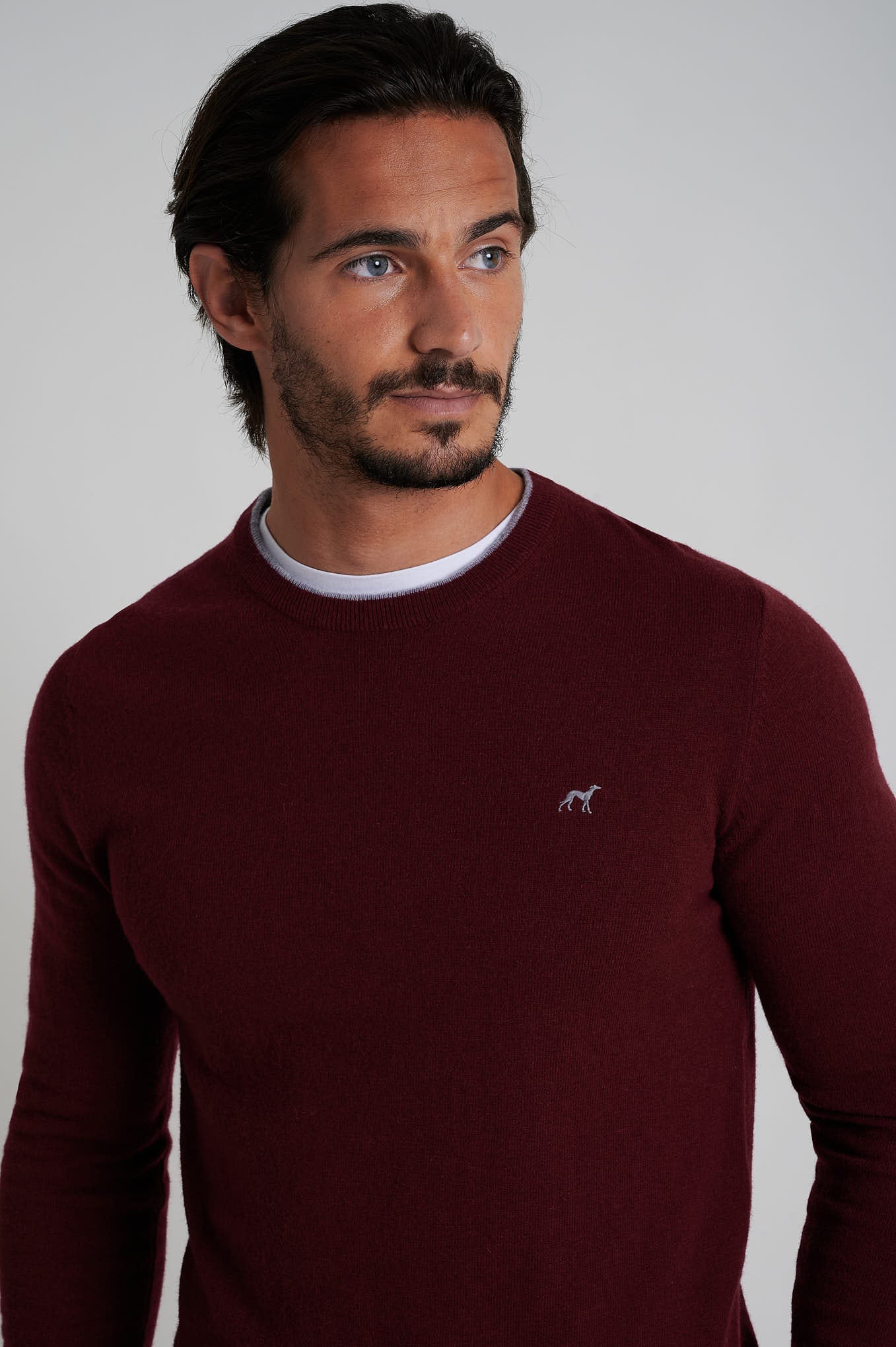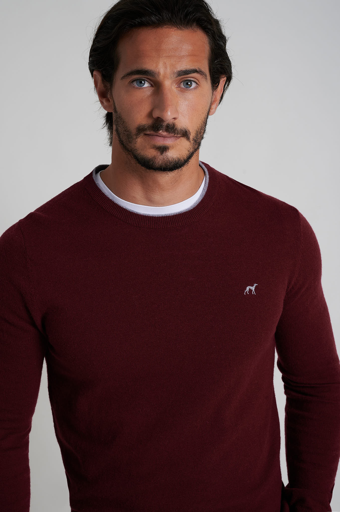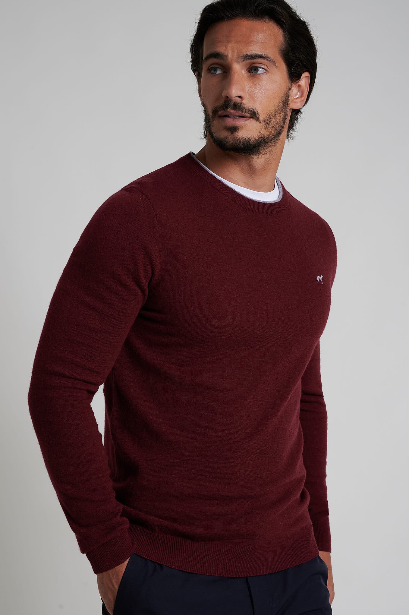 Long sleeve round neck sweater in blended lambswool/nylon. Features contrast color on collar matching with personalized chest embroidery.
