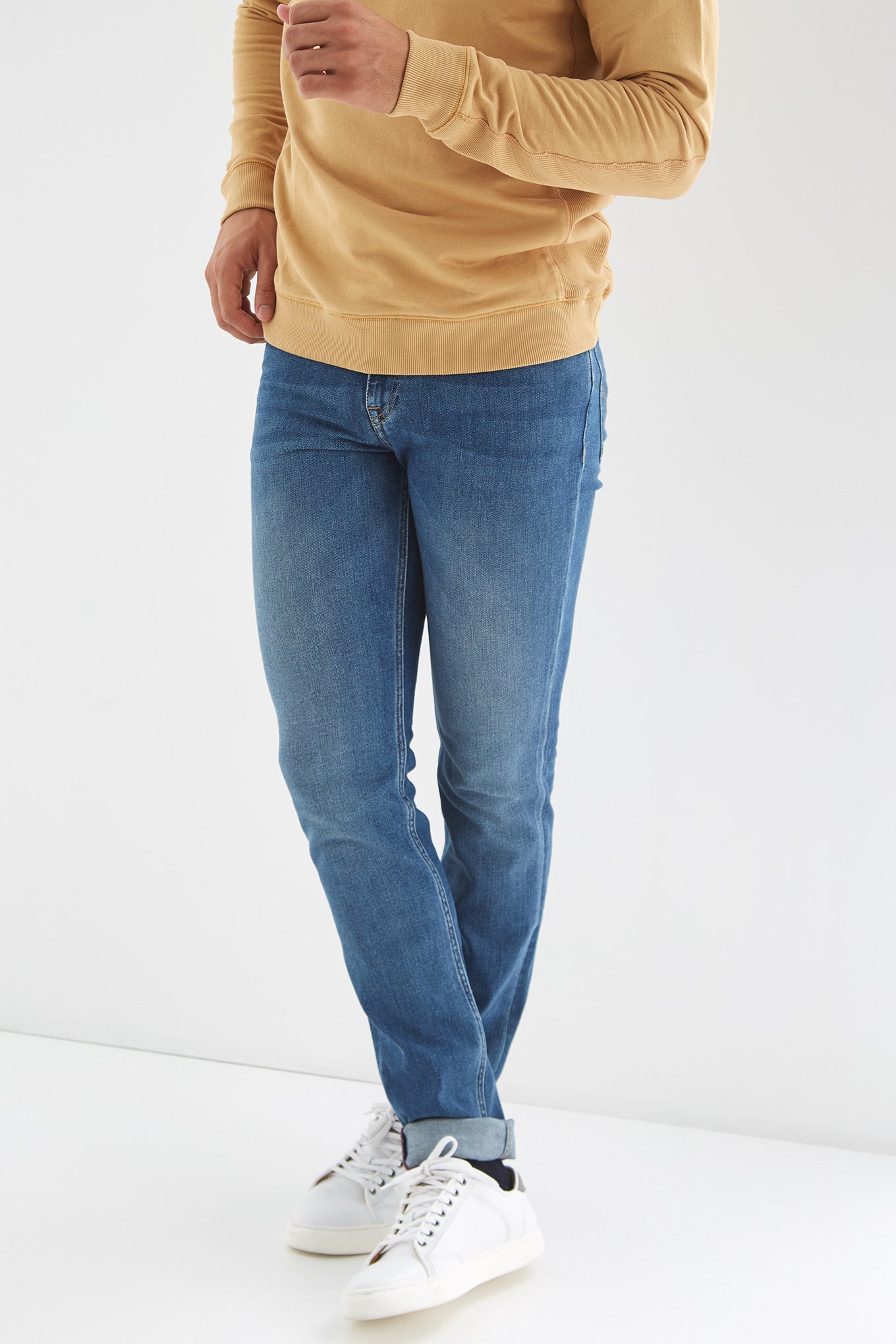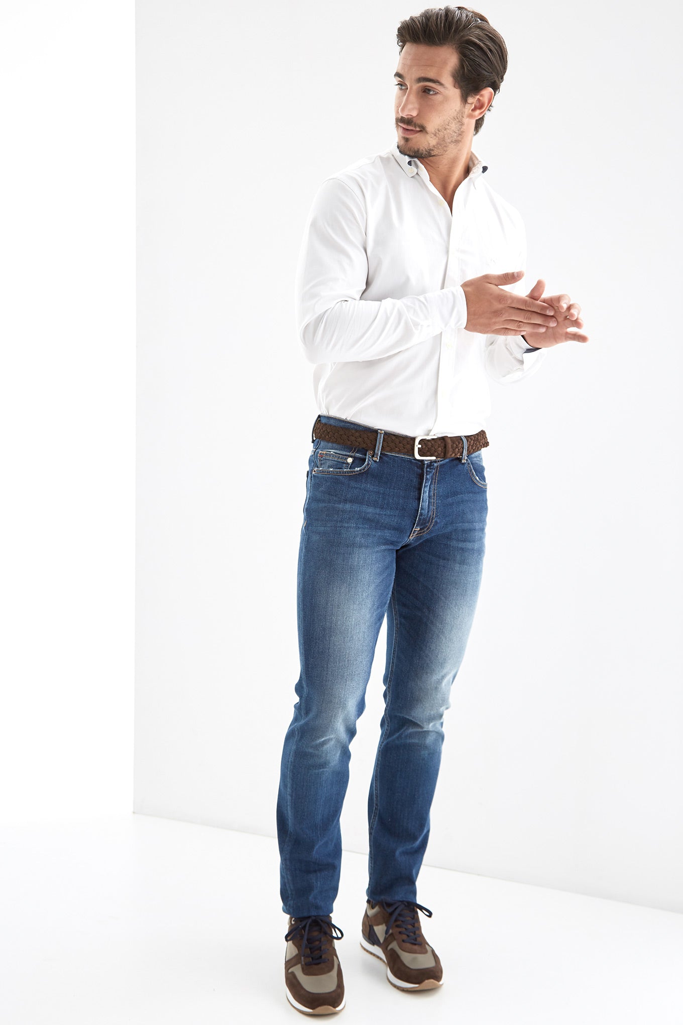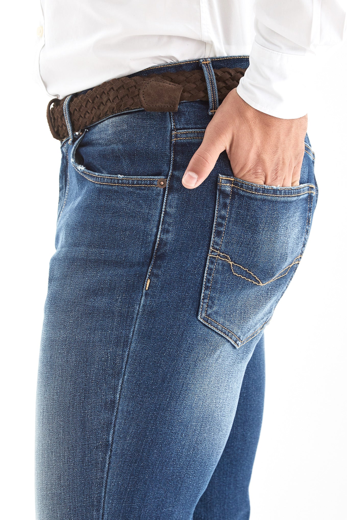 Men's Casual jeans with elasticity, the perfect choice for a relaxed and comfortable look. Features low-rise waist with belt loops, two buttons and zip fastening. Two side pockets and two back pockets.