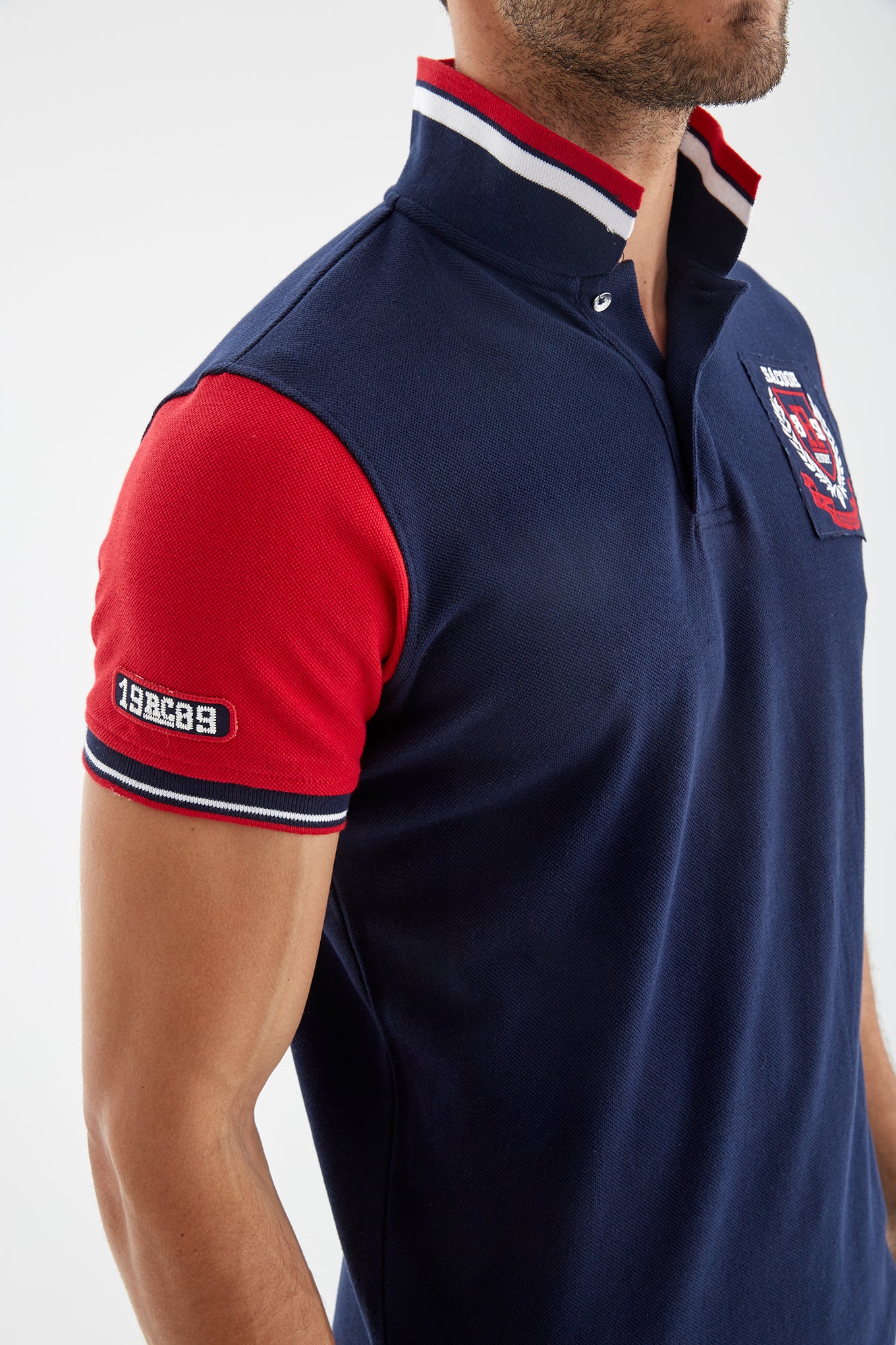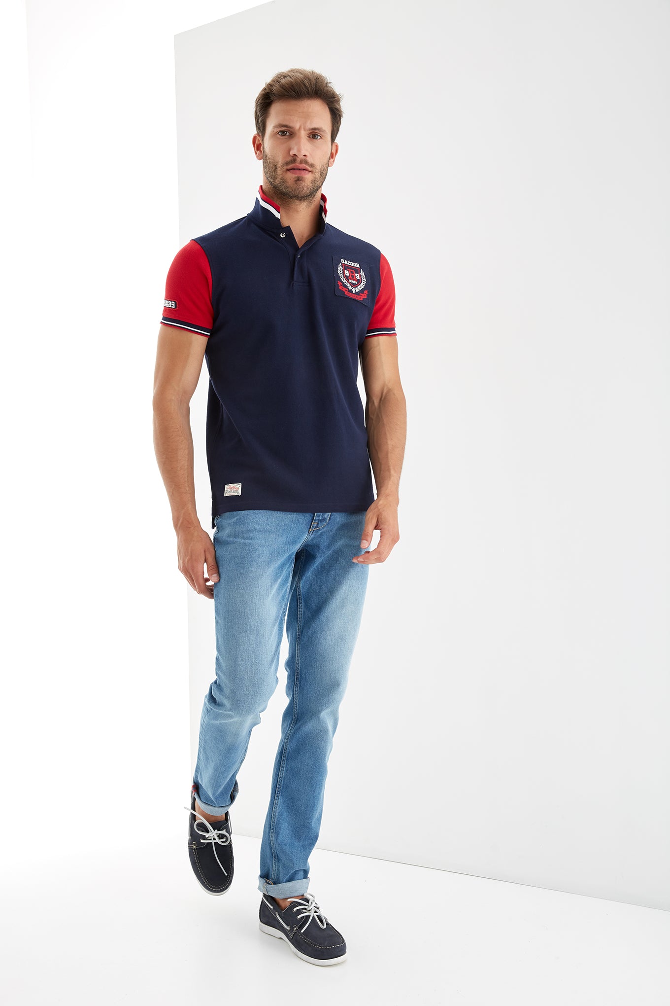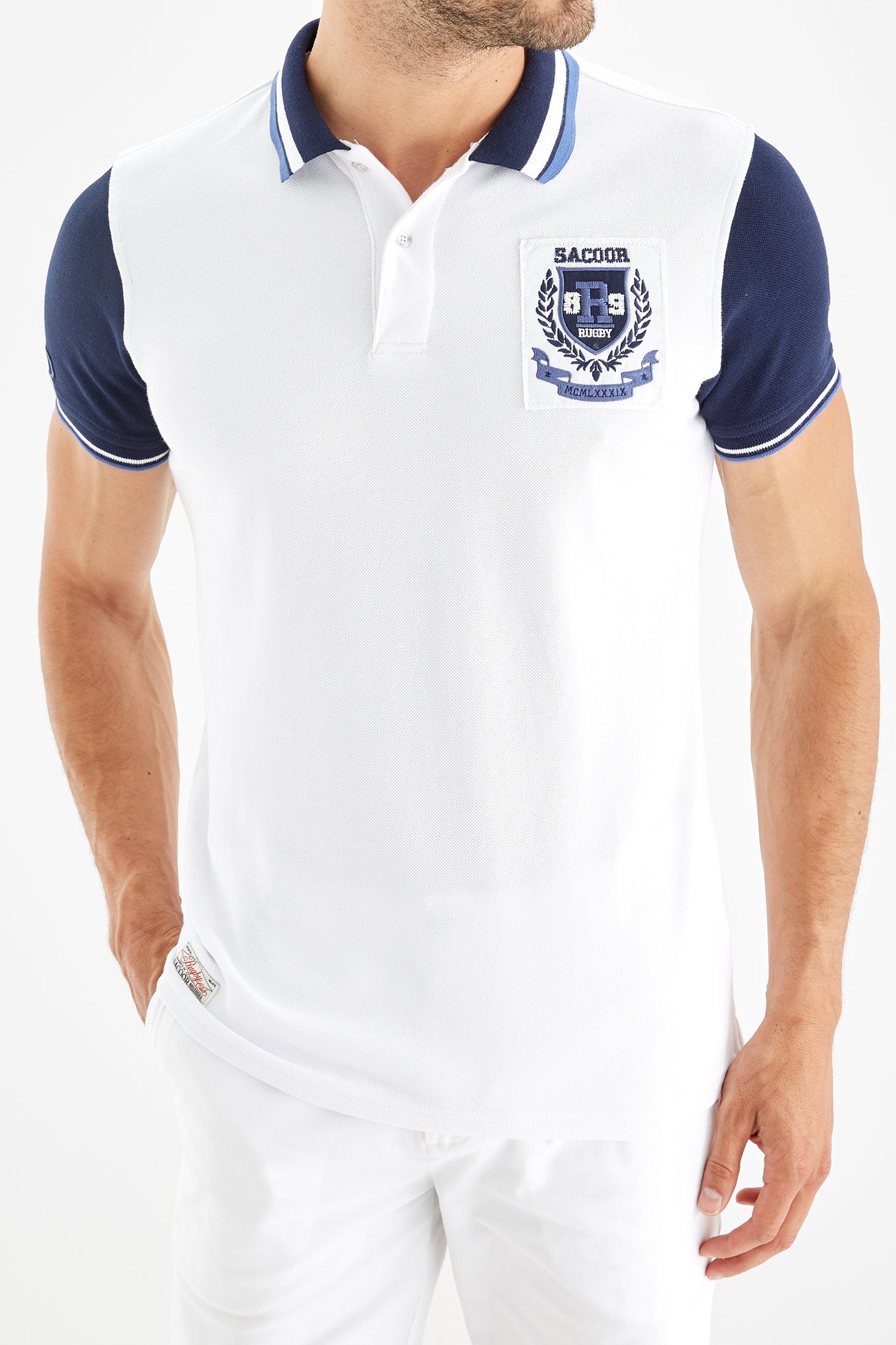 Men's slim fit knitted sports polo. Classic neckline, short sleeves with logo detail on the chest. Made of 100% cotton. Available at Sacoor Brothers' online store.