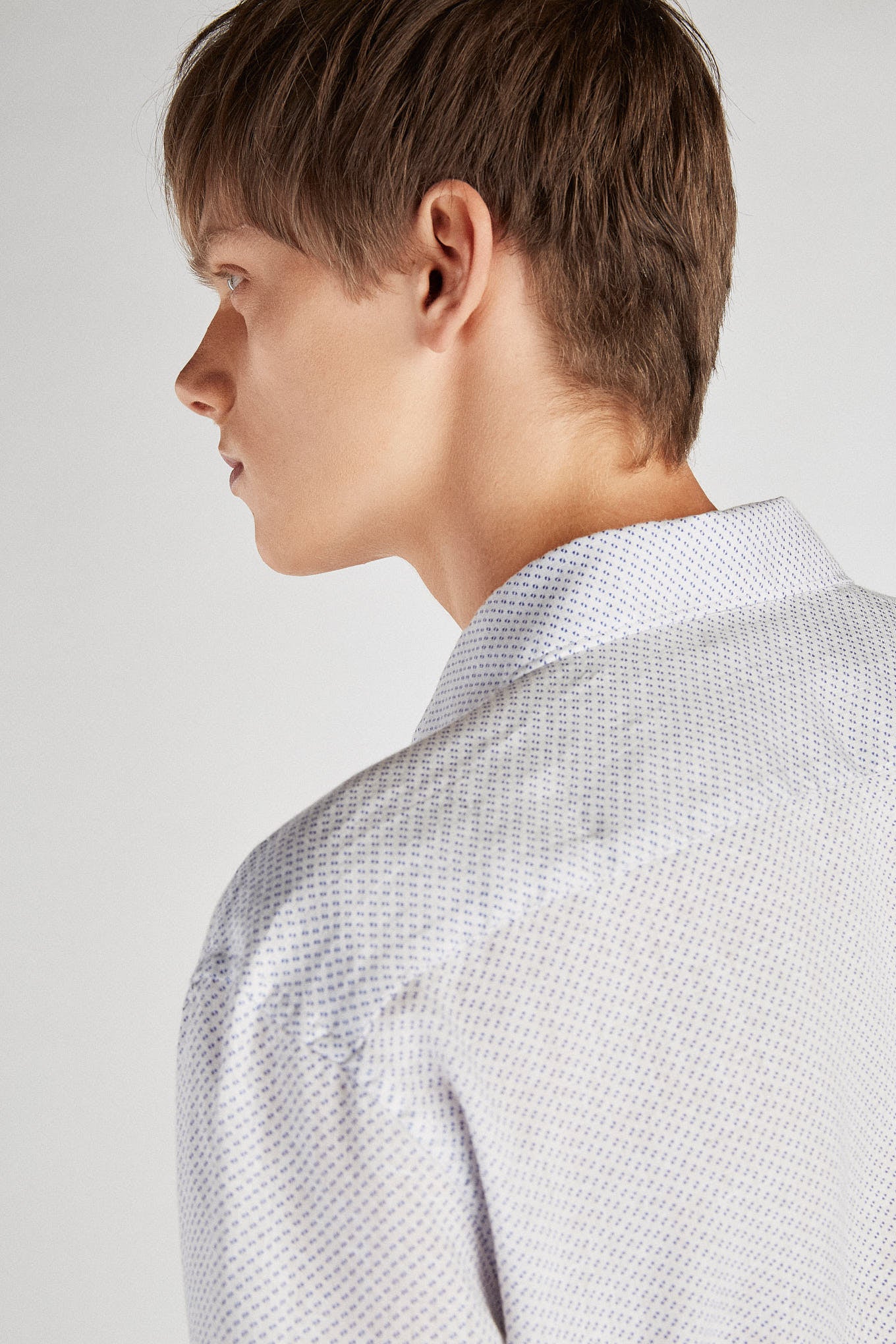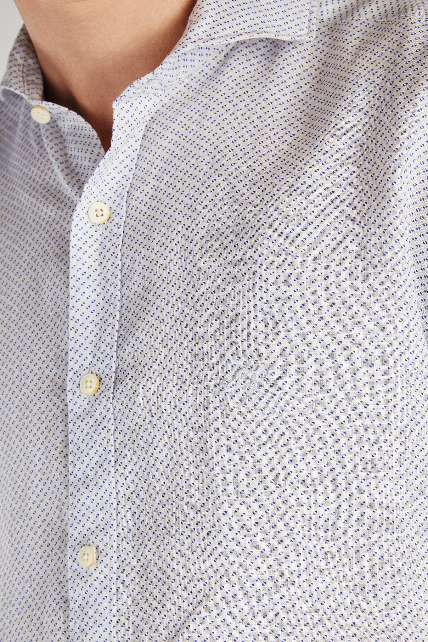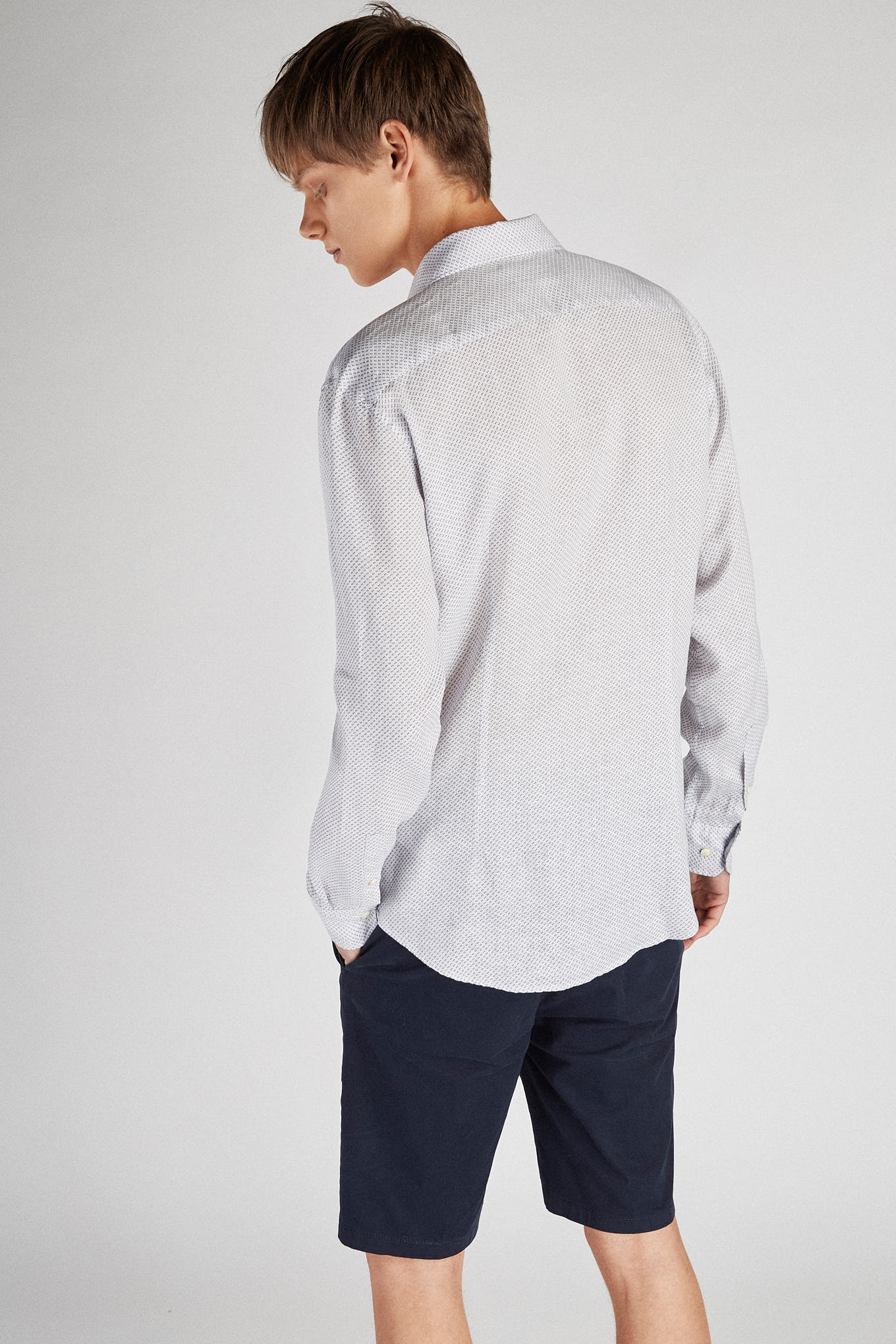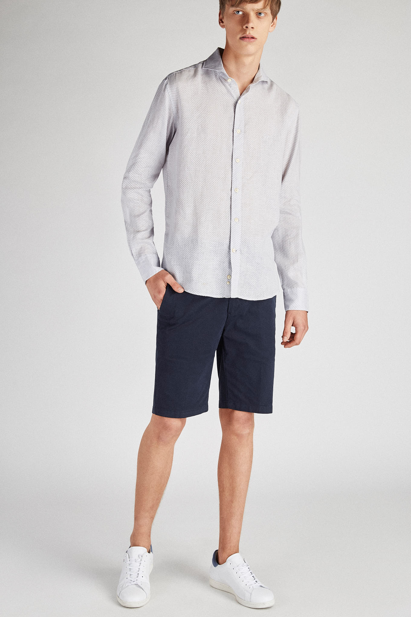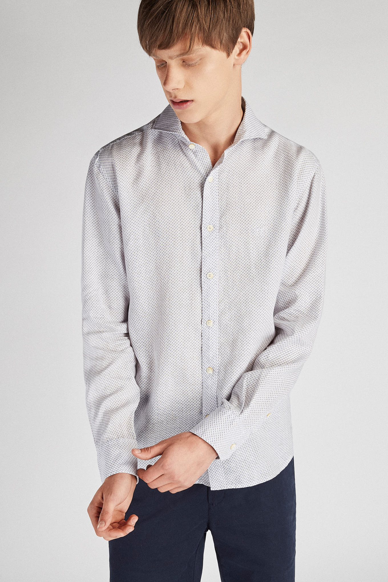 Men's shirt, very light and cool, in 100% linen. Small dotted pattern. Open collar, with stretchers included. English stitching, more comfortable with a quality finish. Ideal for combining with a variety of other Sacoor pieces on warmer days. Available at Sacoor Brothers online store.