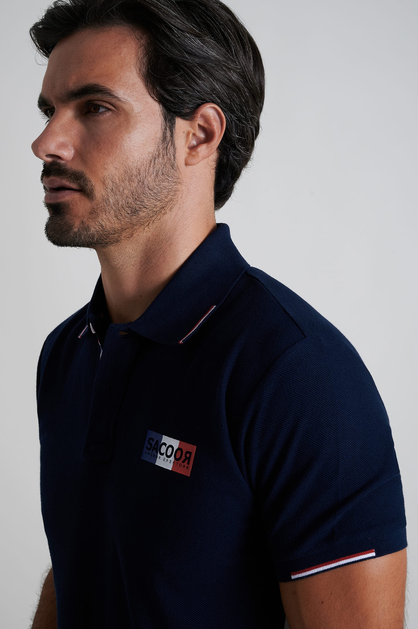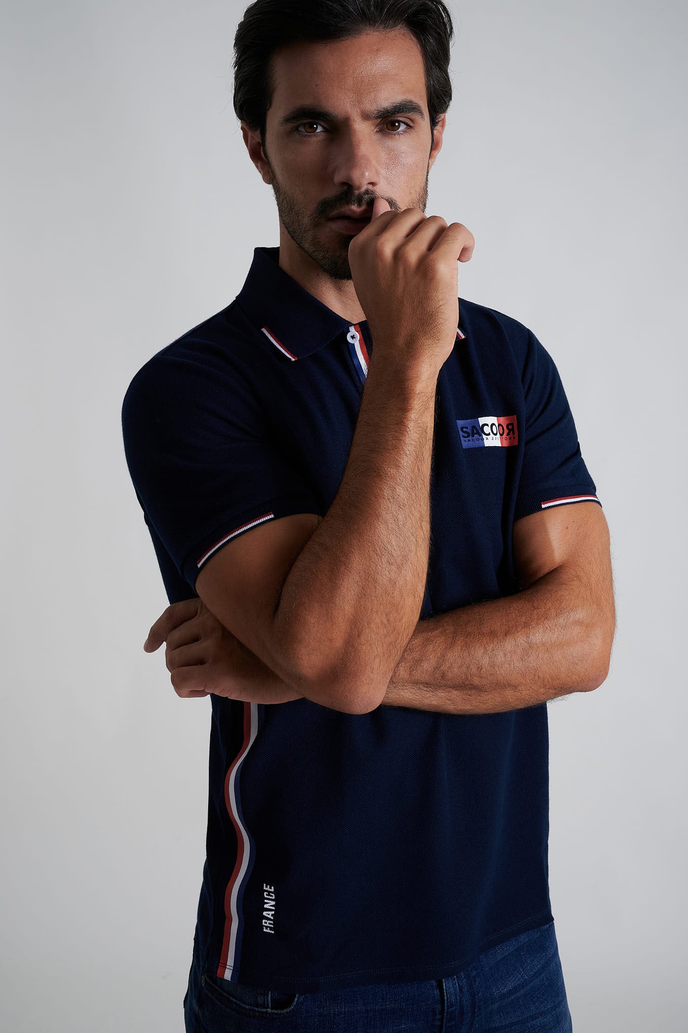Polo-shirt made of 100% cotton piquet. Featuring a slim fit, ribbed collar and ribbed cuffs with small details with thin stripes in contrast color, two buttons, placket fastening - inside inferior with striped print , short sleeves. .Neck seam cover tape and slits oppening with striped tape in contrast colors..Logo print at back in contrast color. Undercollar with country name print.. Chest printed with name of brand with colors of country..Country name near to bottom and print at sides with stripes in contrast color. .The contrast color details have the same colors of FRANCE Flag