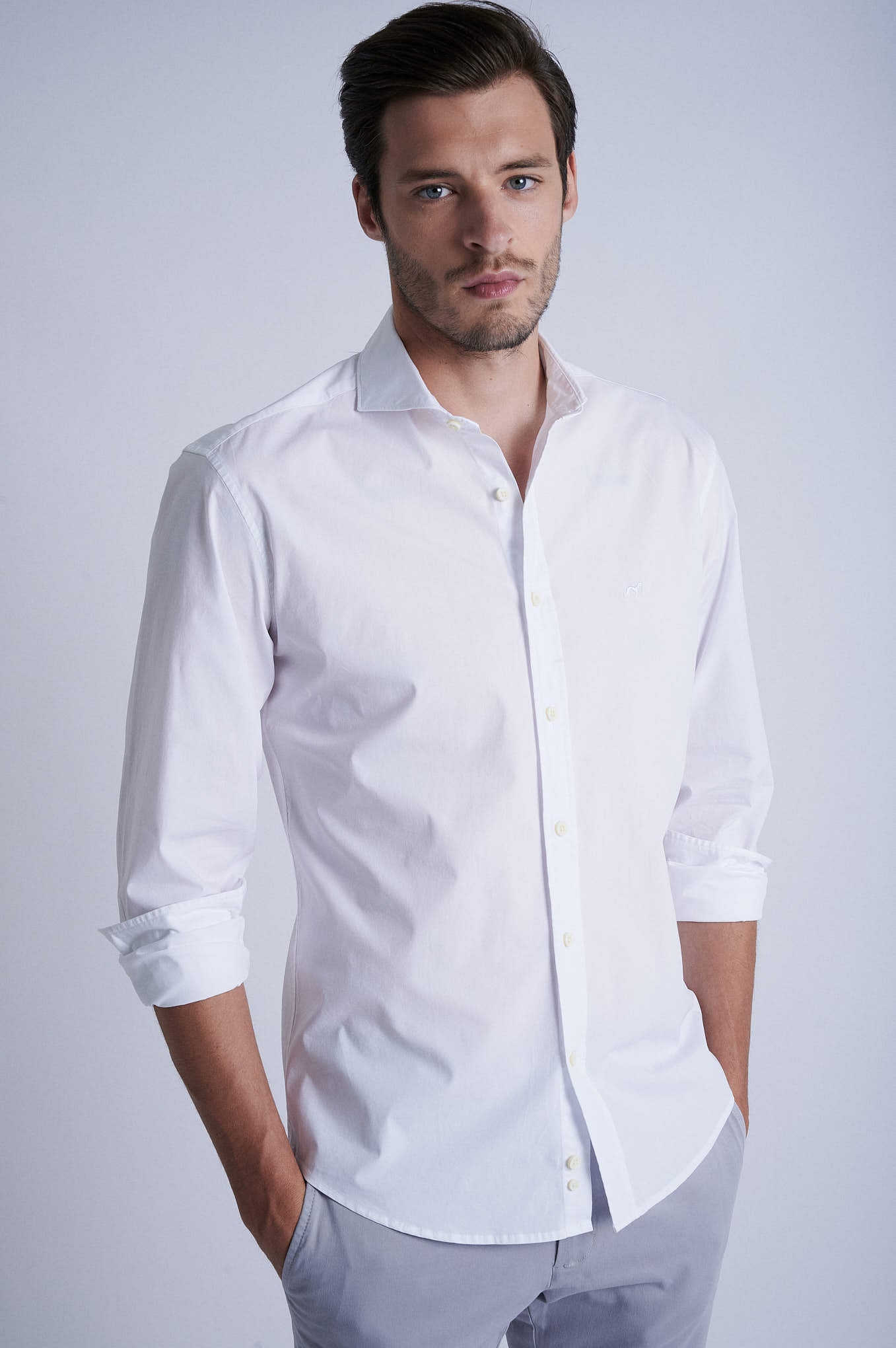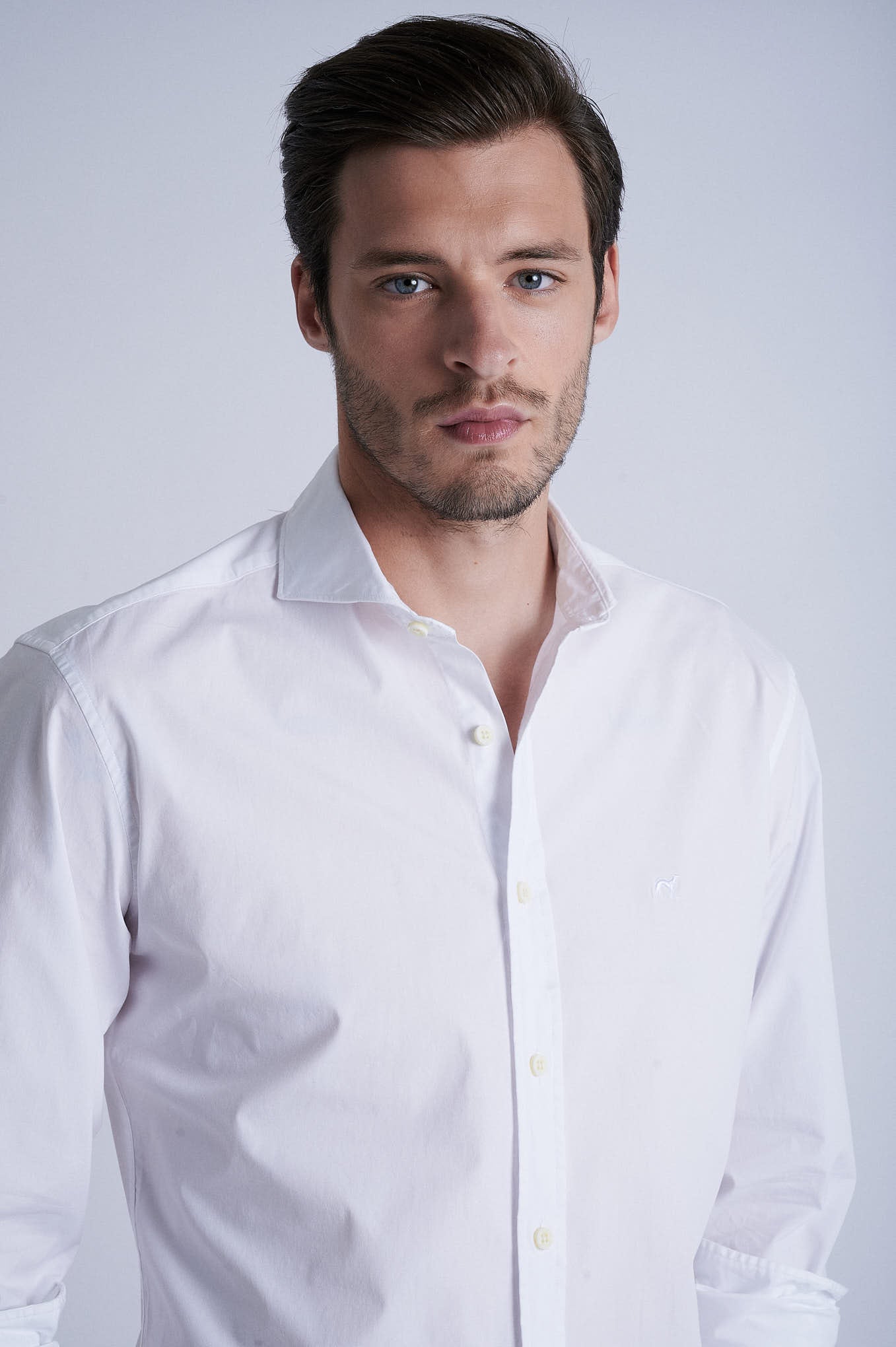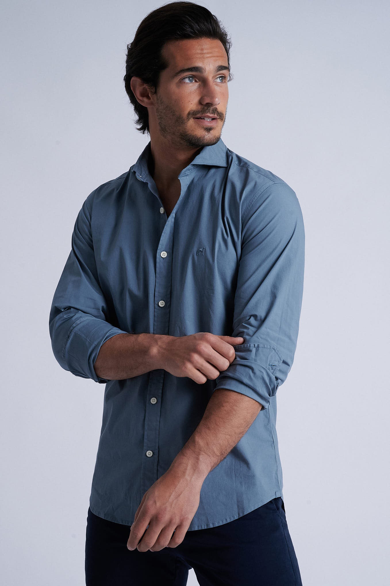 Plain shirt made of blended organic cotton and spandex, garment dye. Features a slim fit with open collar and double placket at front. Long sleeves with rectangle cuffs with 1 button. Side rectangle gussets and chest embroidery in matching body color.