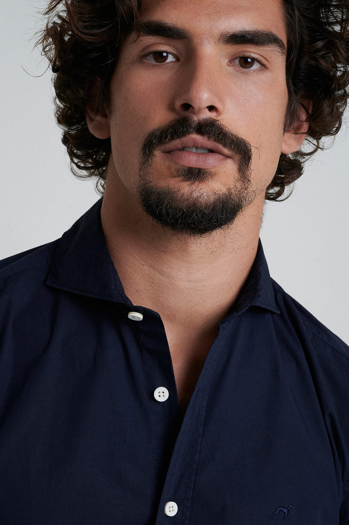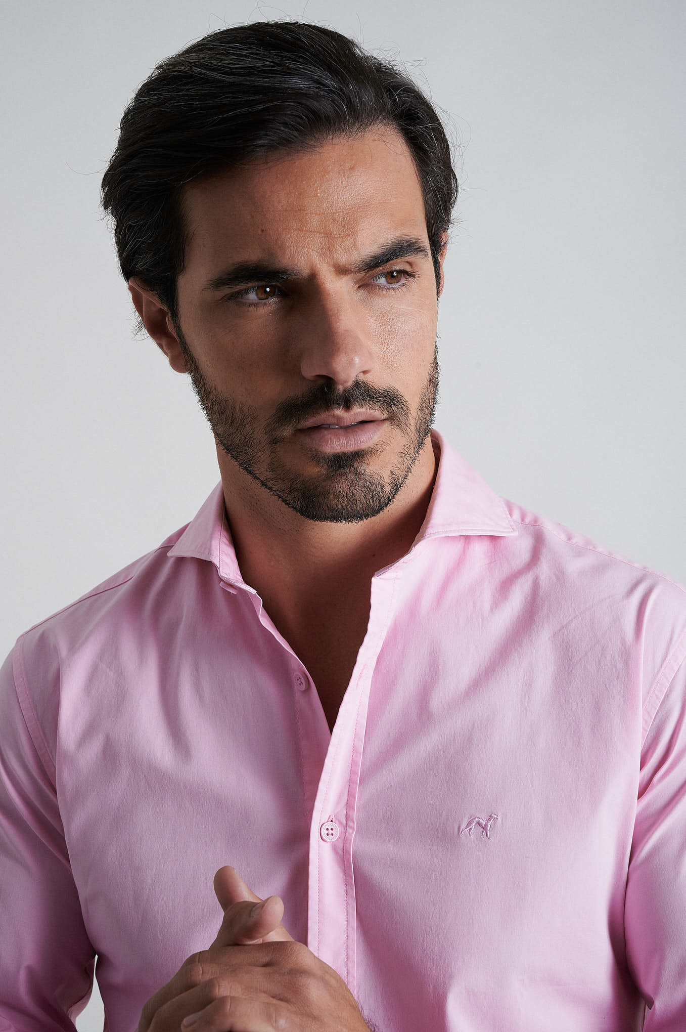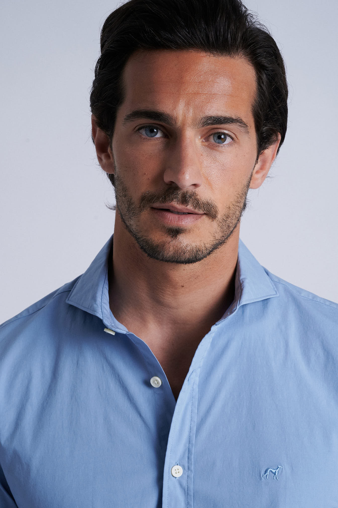 Plain shirt made of blended organic cotton and spandex, garment dye. Features a slim fit with open collar and double placket at front. Long sleeves with rectangle cuffs with 1 button. Side rectangle gussets and chest embroidery in matching body color.