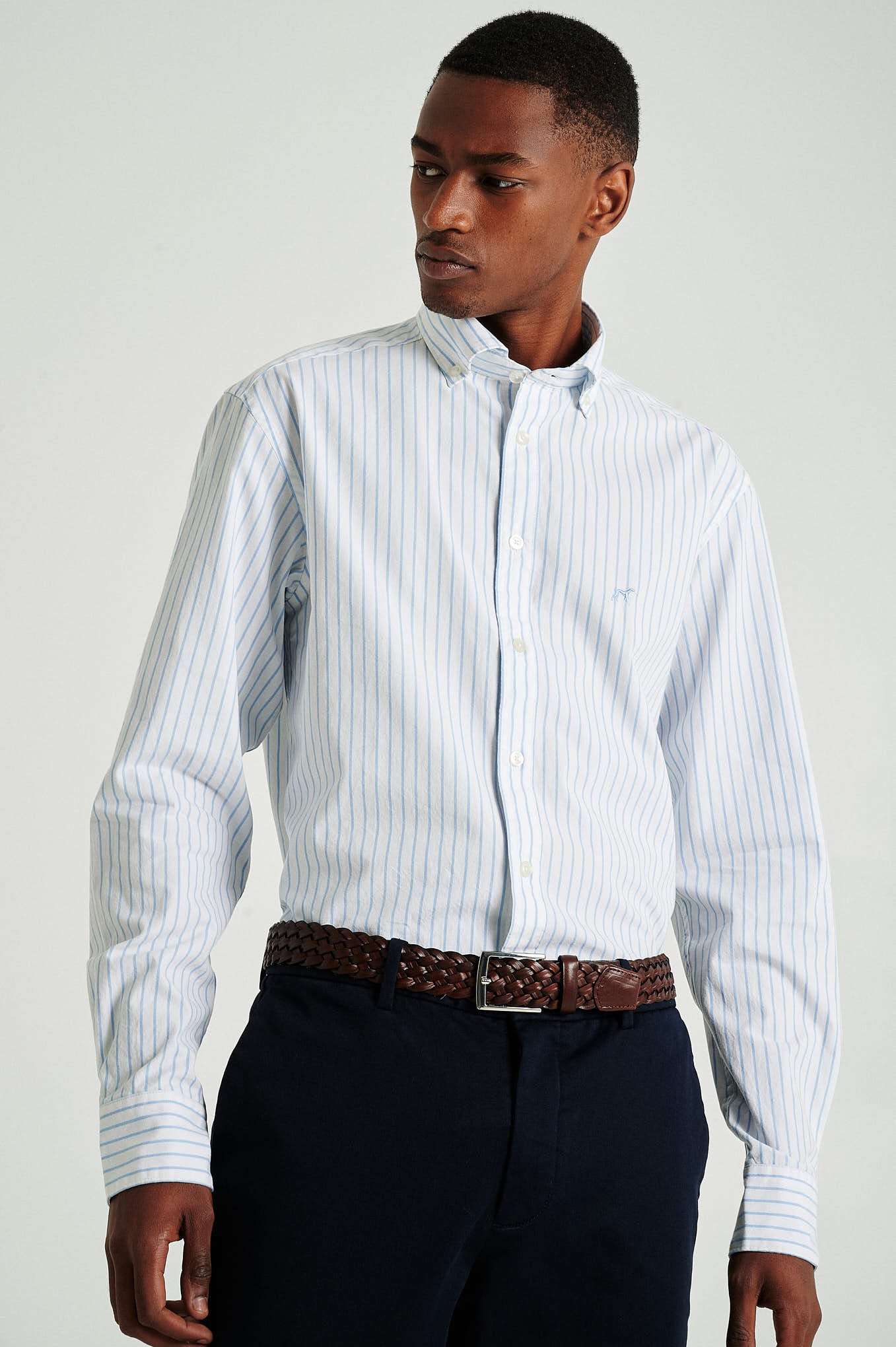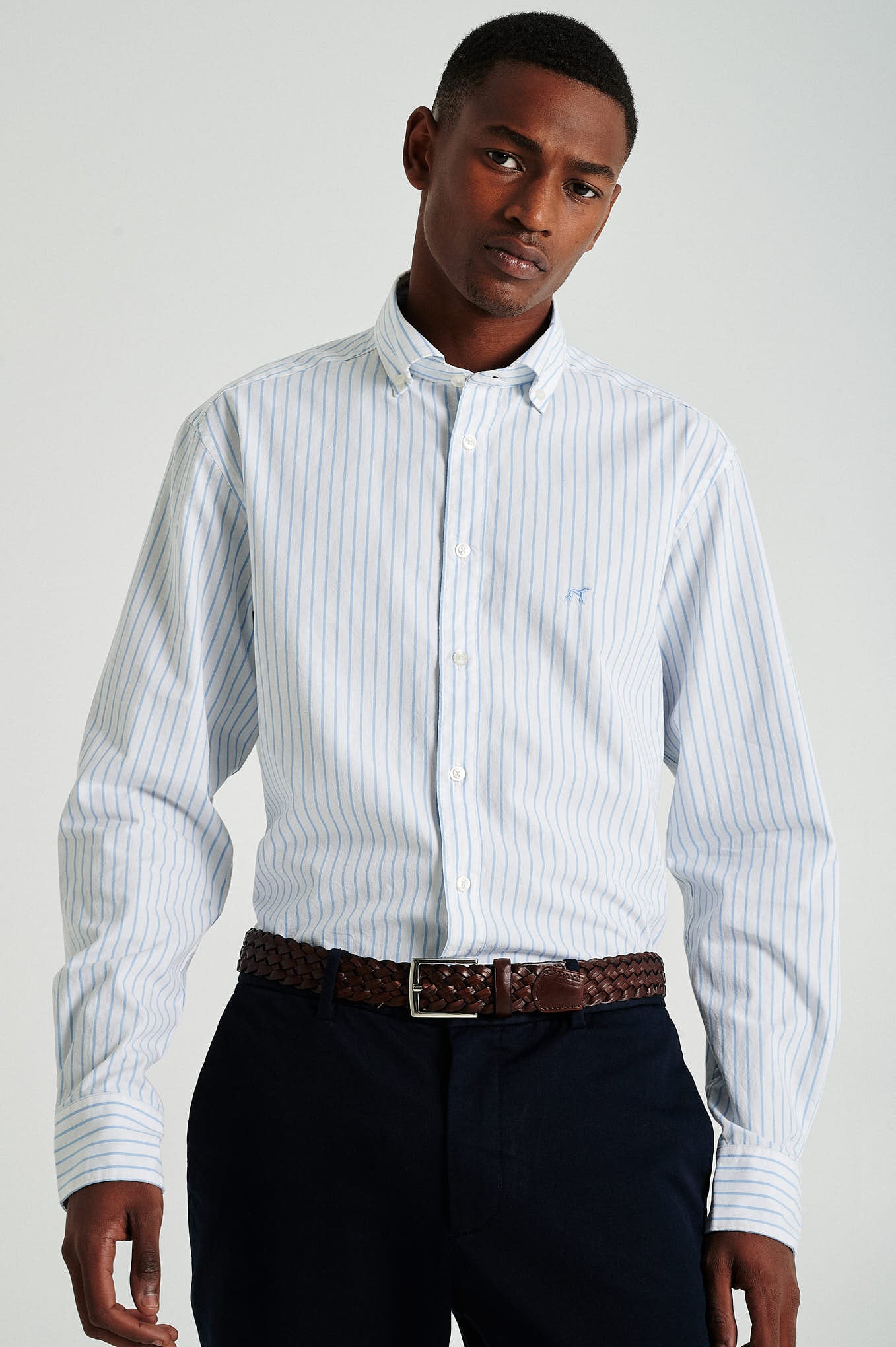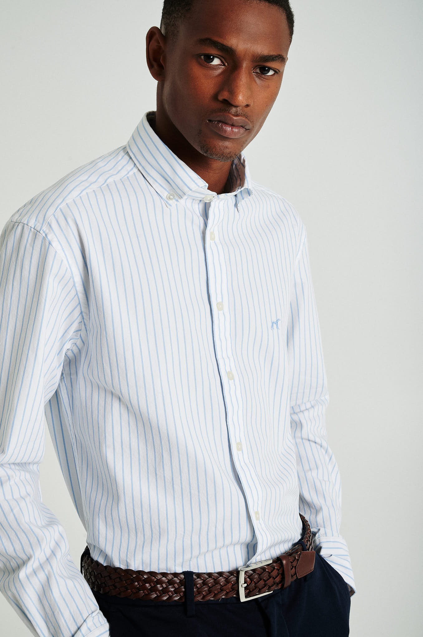 Striped sport shirt, fabric made of 120's double luxury cotton. Features a slim fit. Button-down collar with button-up fastening through engraved buttons. Long sleeves with single cuffs with 2 buttons.