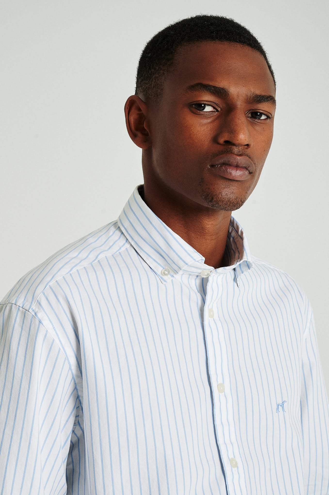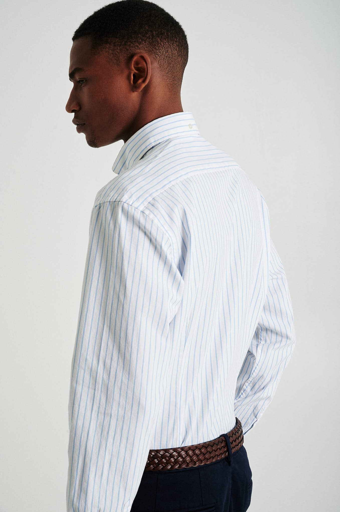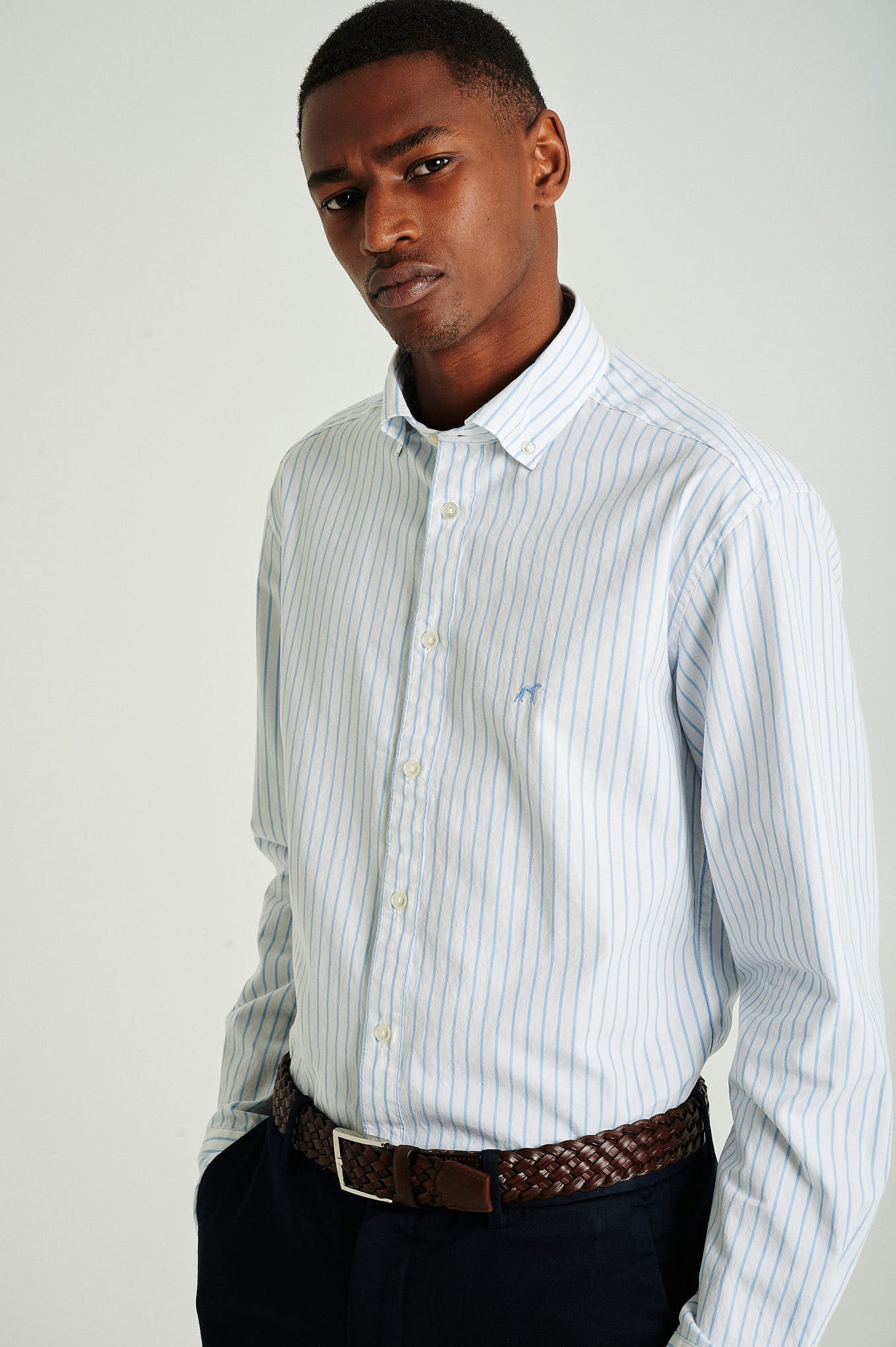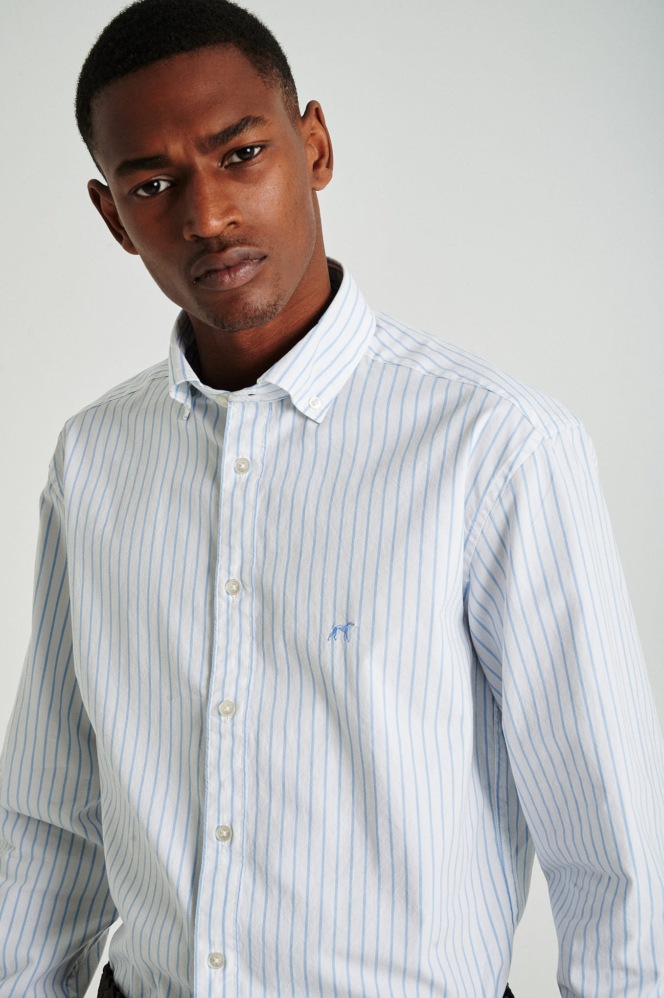 Striped sport shirt, fabric made of 120's double luxury cotton. Features a slim fit. Button-down collar with button-up fastening through engraved buttons. Long sleeves with single cuffs with 2 buttons.