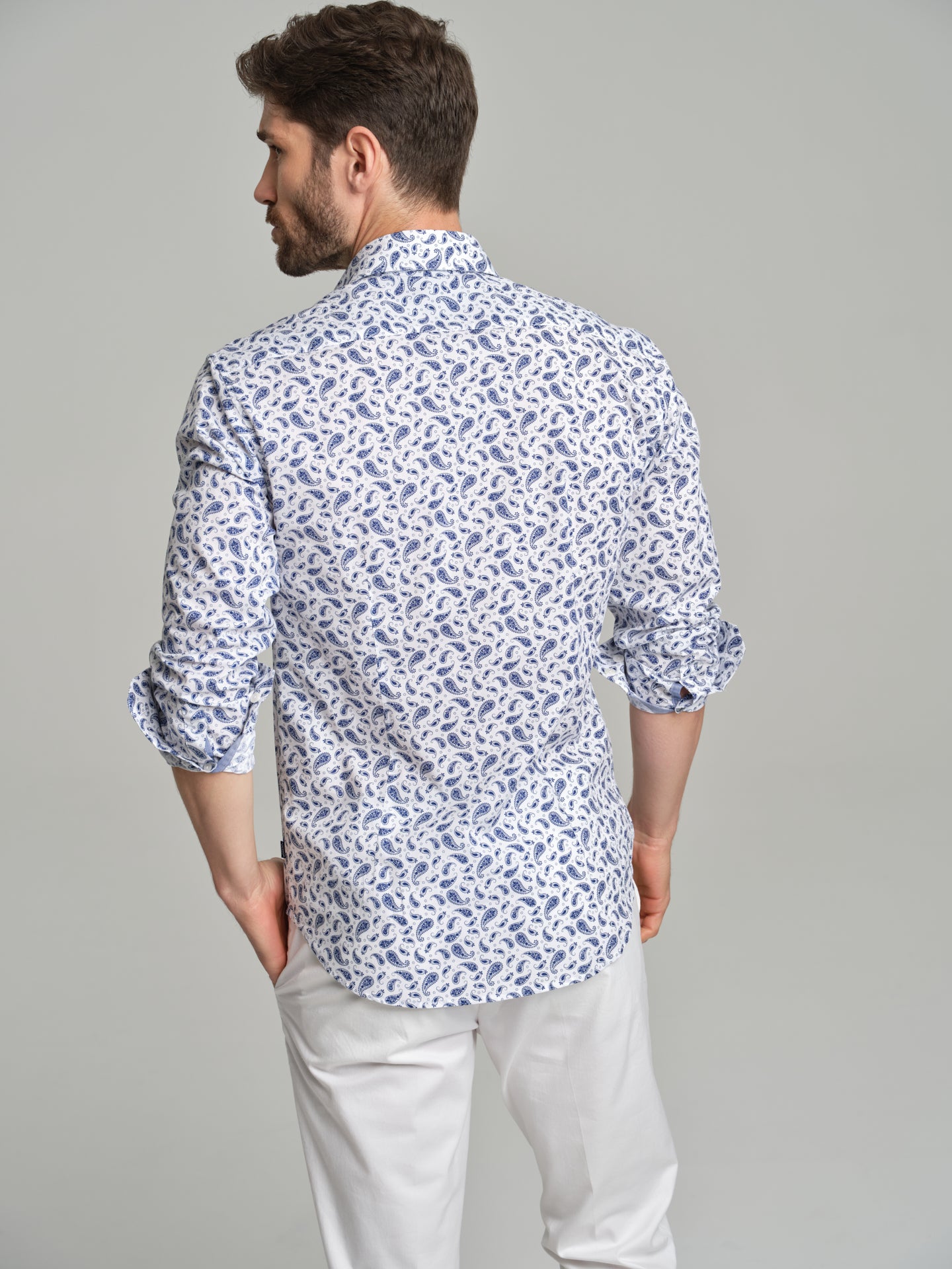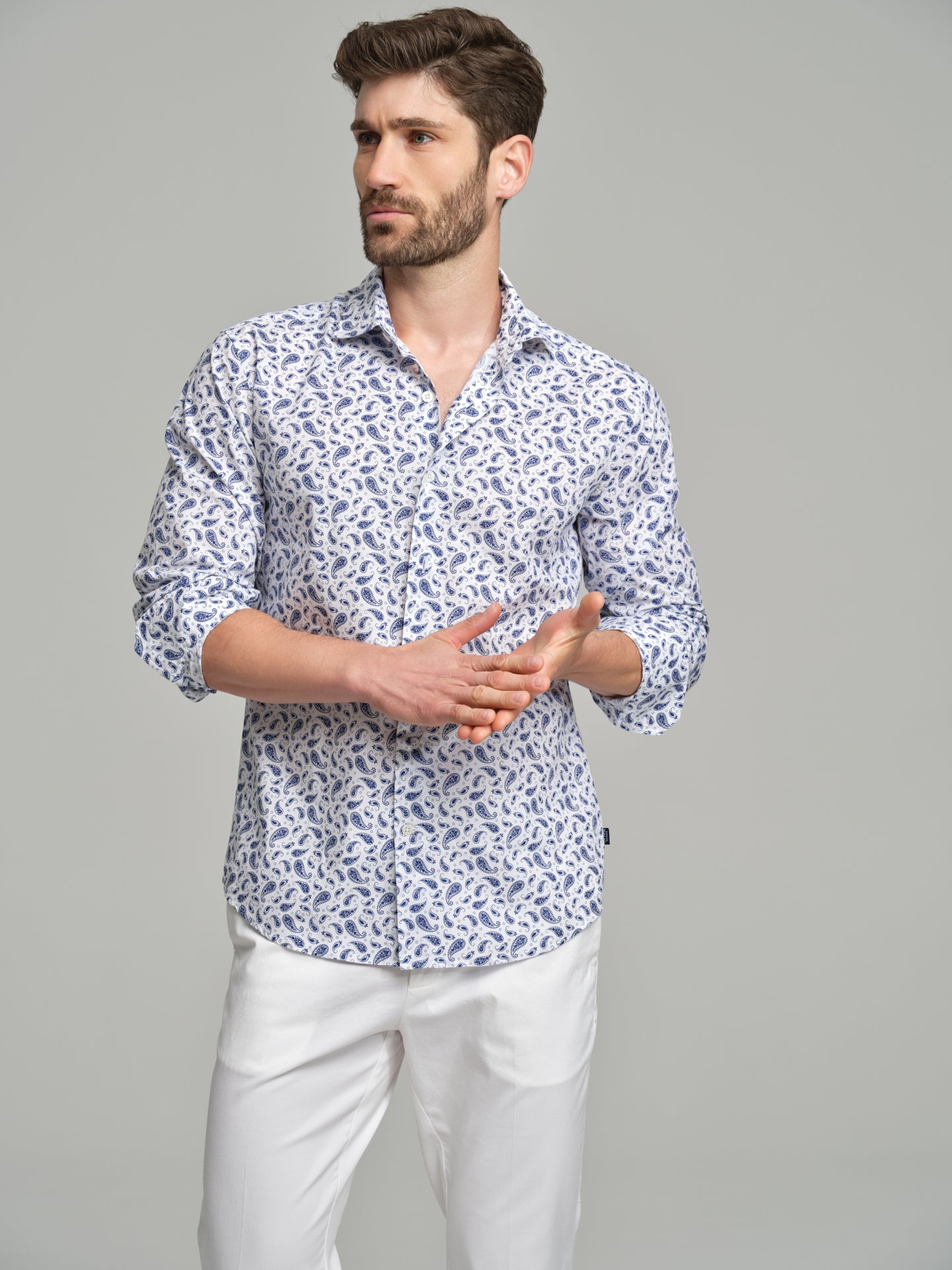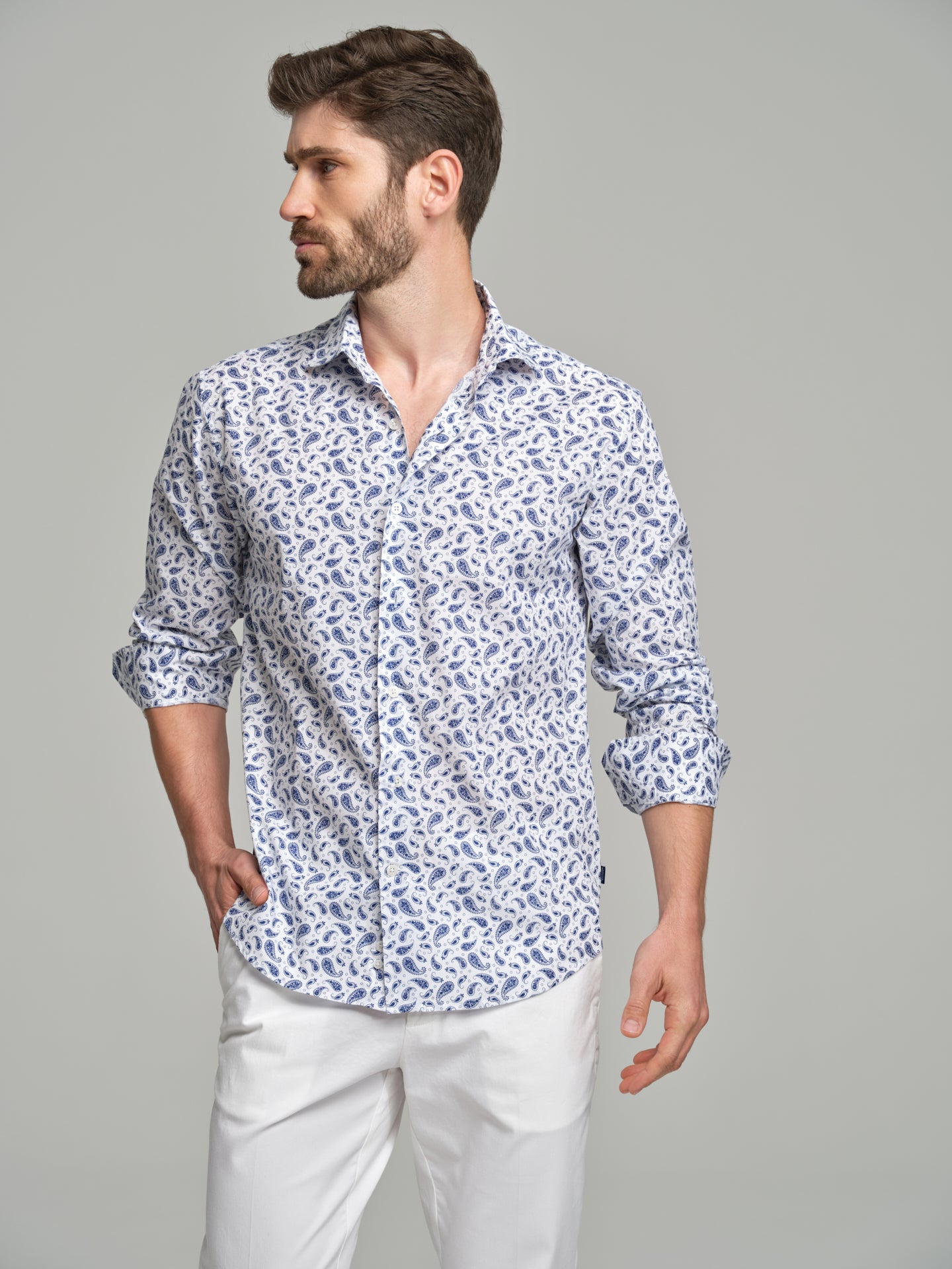 Printed casual shirt with paisley allover print. Fabric made of 100% cotton. Spread open collar with button-up fastening. Long sleeves with single cuffs with 2 buttons.