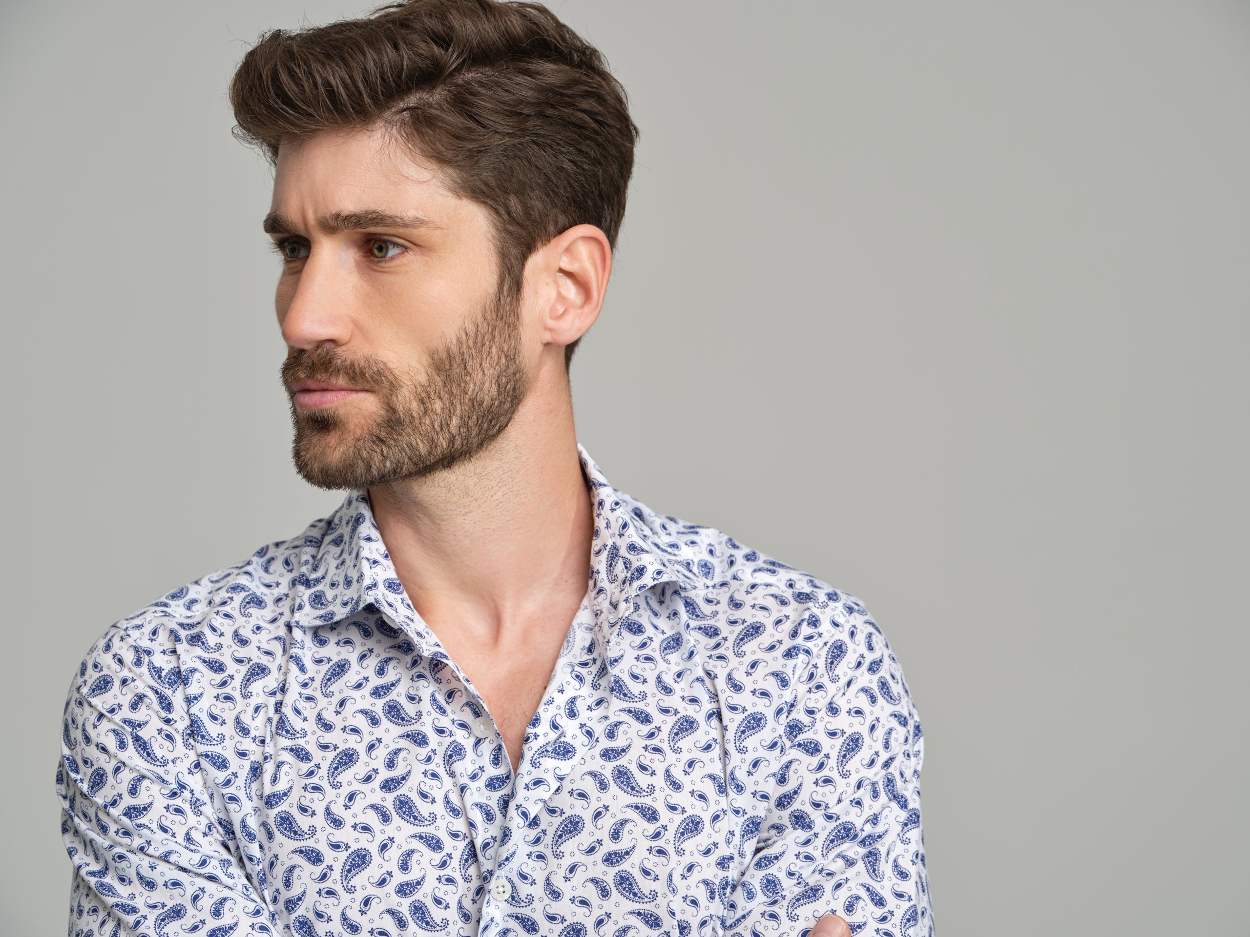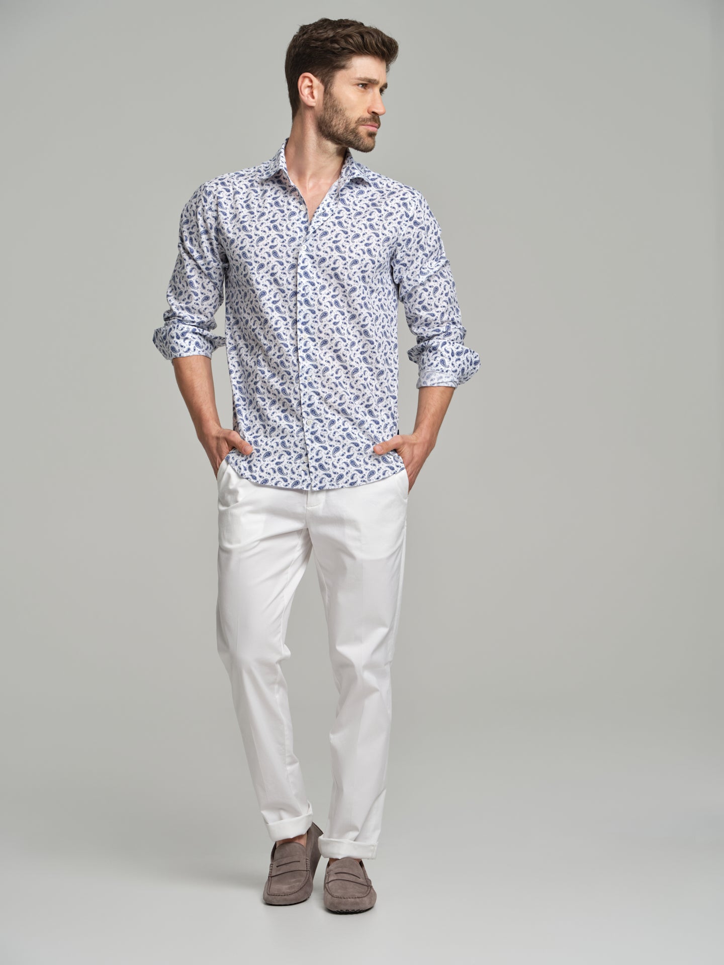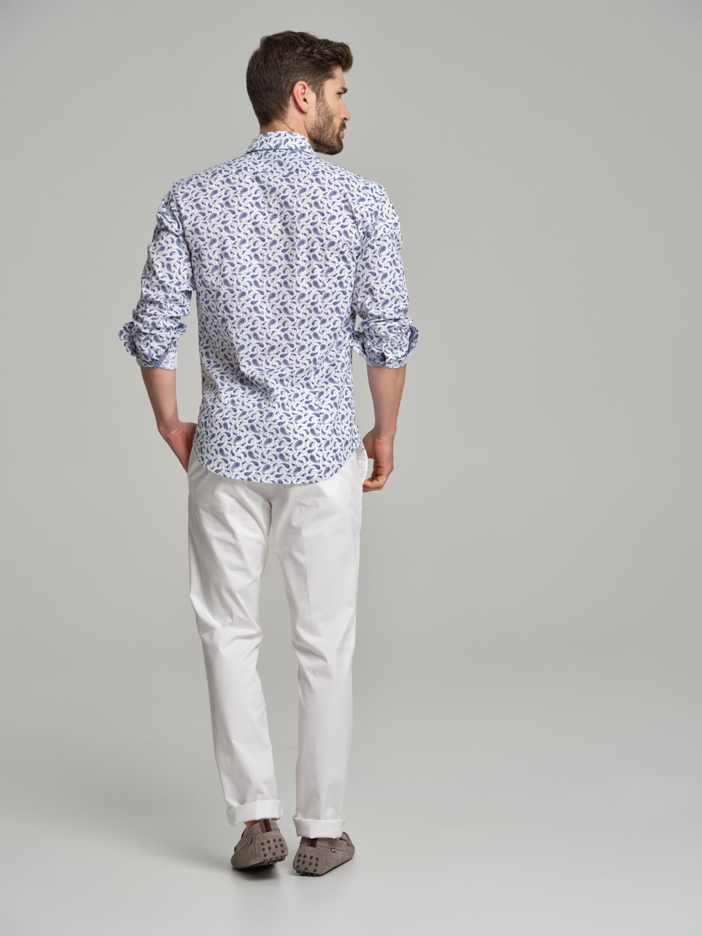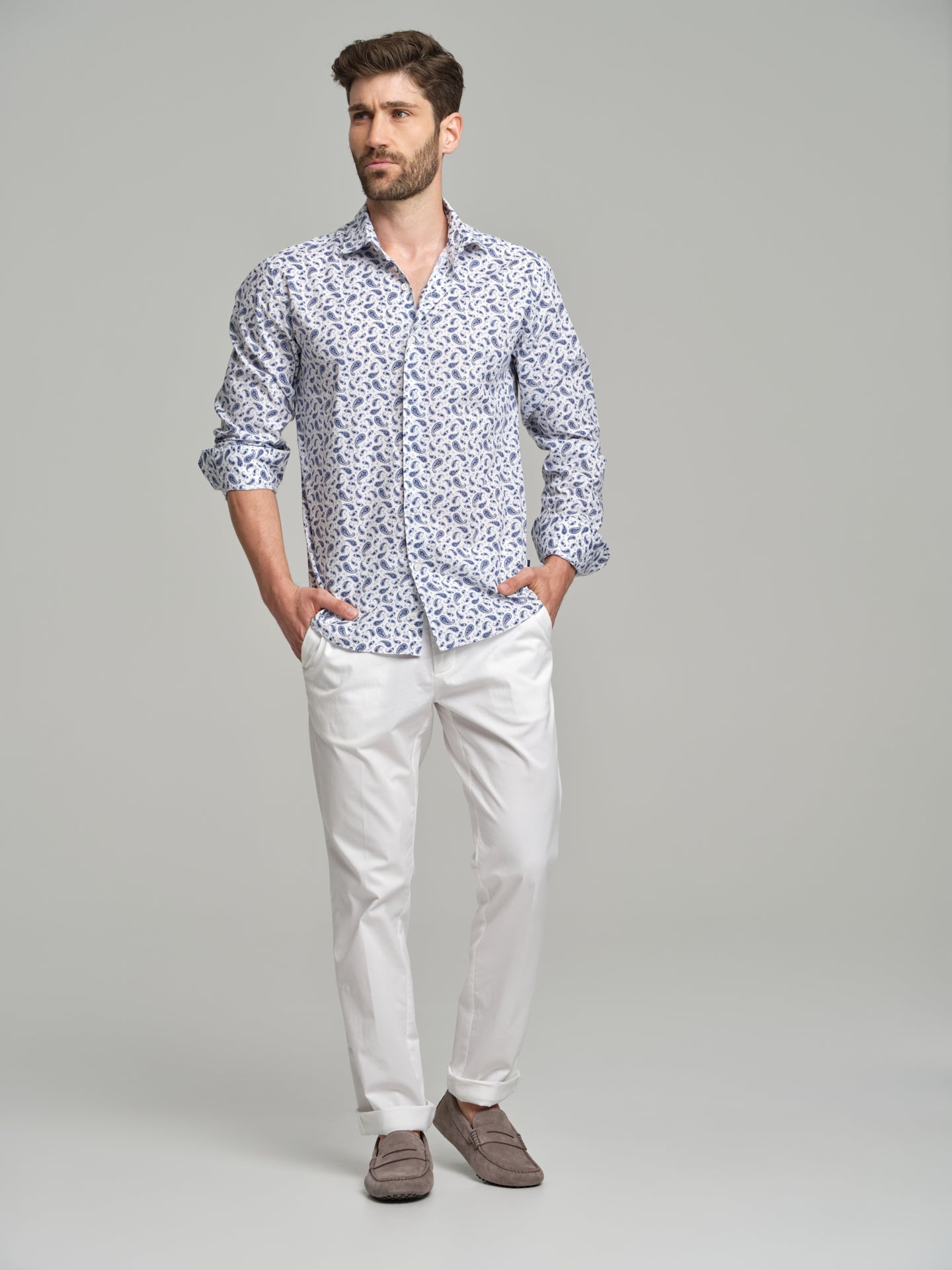 Printed casual shirt with paisley allover print. Fabric made of 100% cotton. Spread open collar with button-up fastening. Long sleeves with single cuffs with 2 buttons.