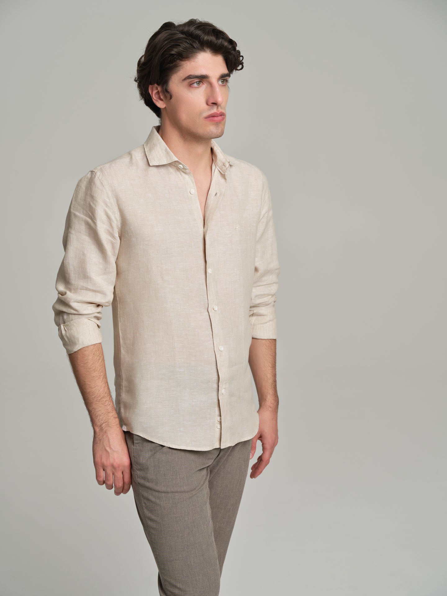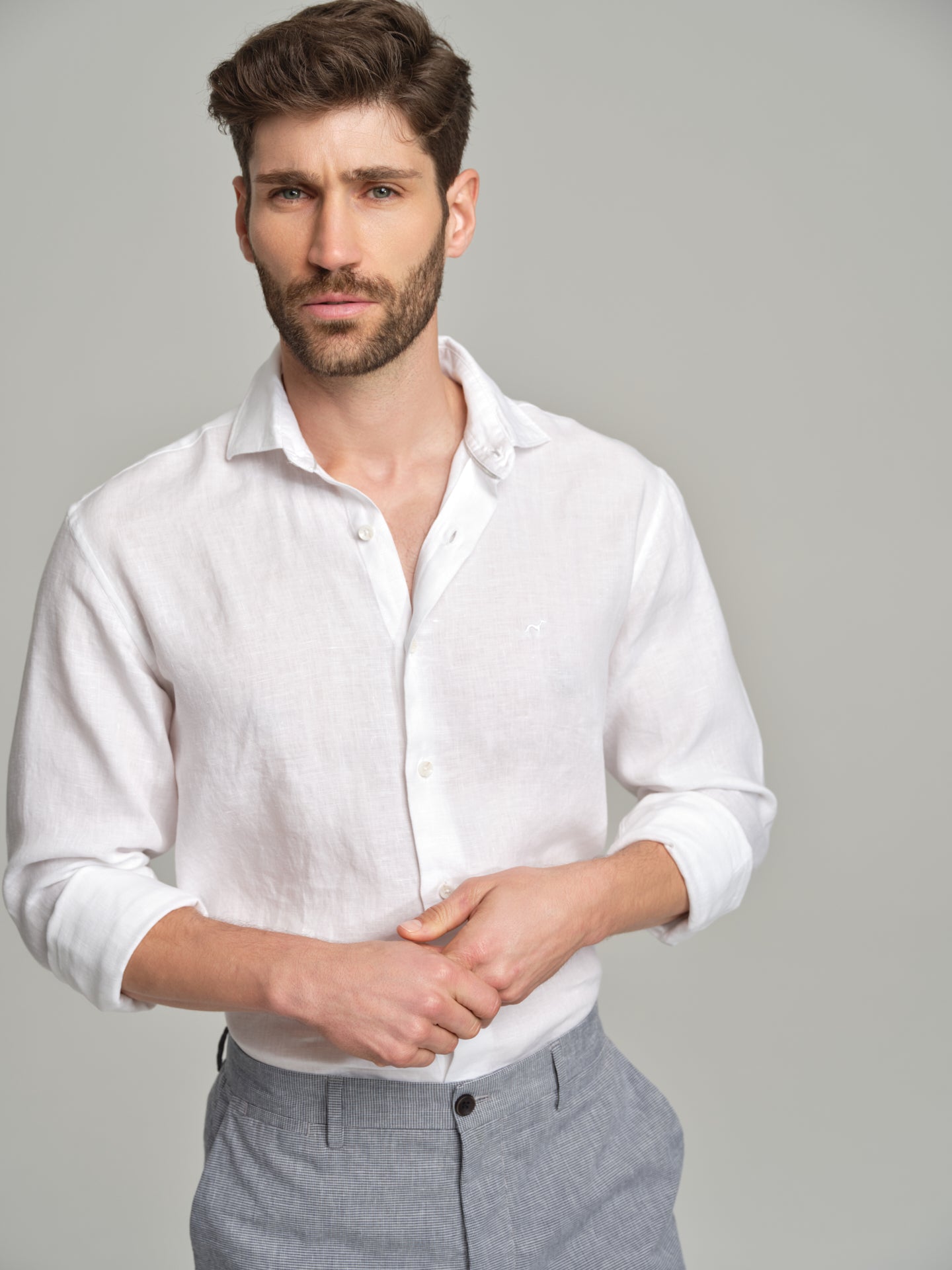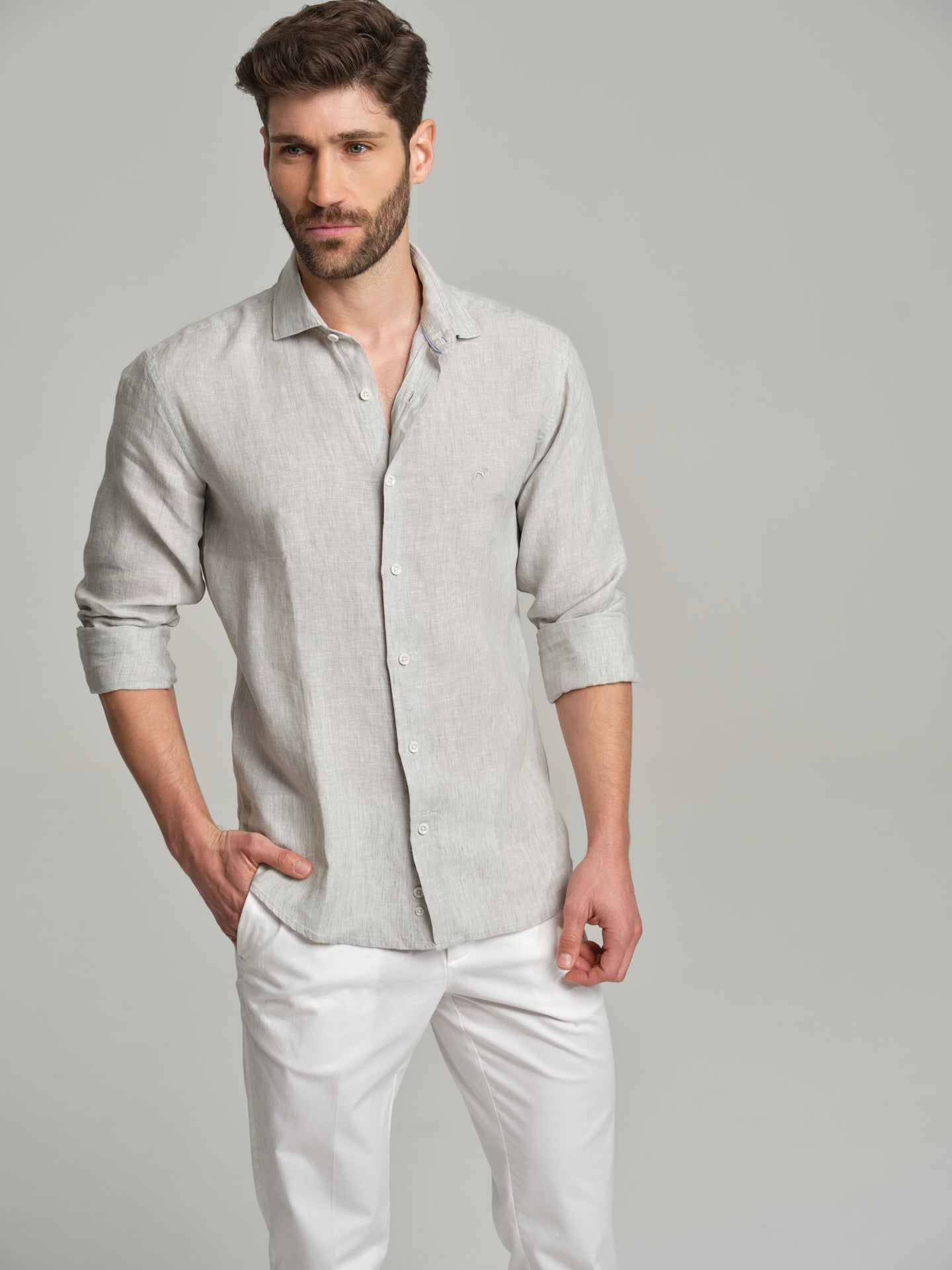 Sport shirt in plain linen quality. Fabric made of 100% linen. Featuring an open spread collar and button-up fastening. Long sleeves with single cuffs with 2 buttons. Chest logo embroidery. Color contrasting details on interior yoke piping and side gussets.