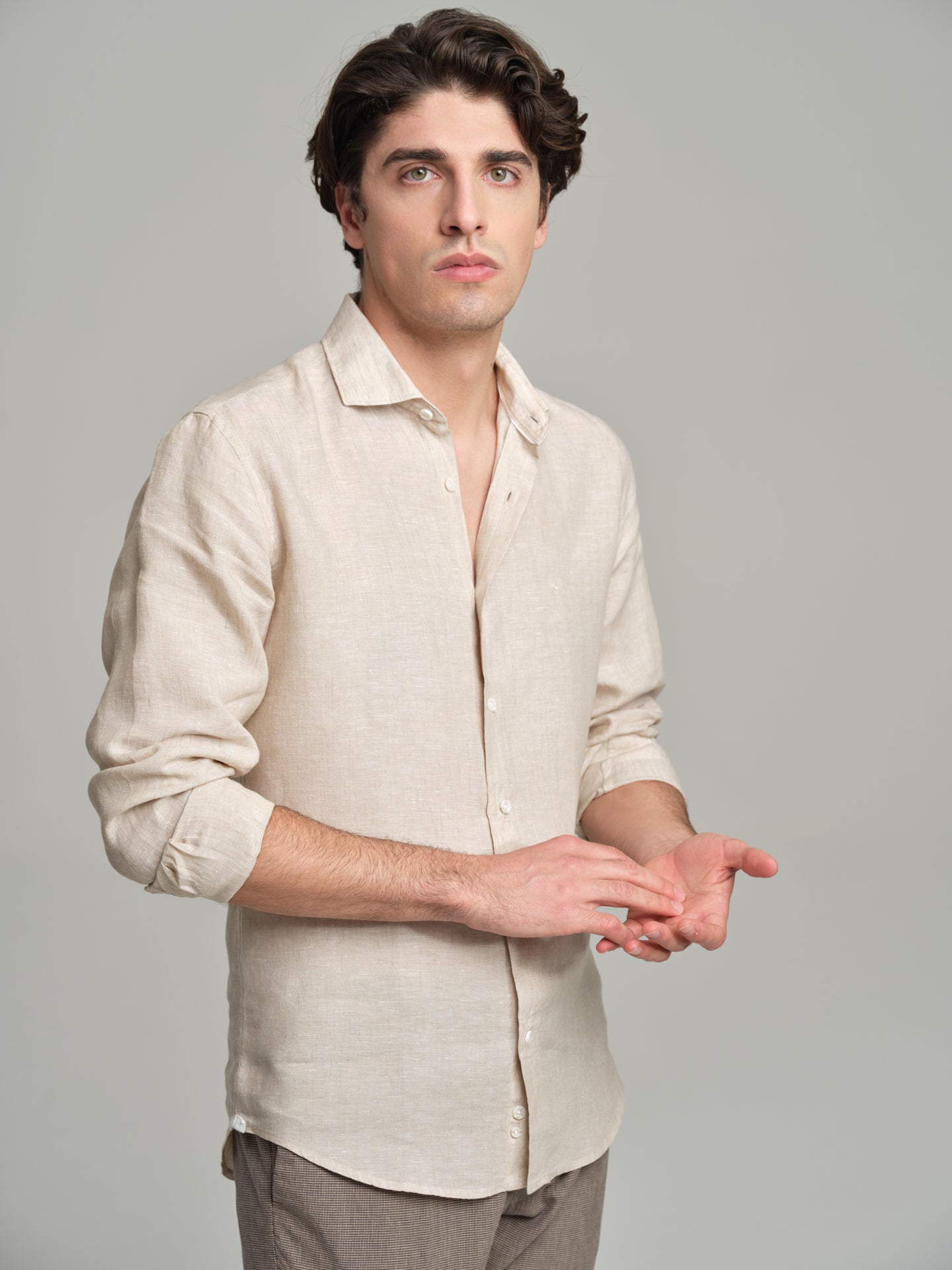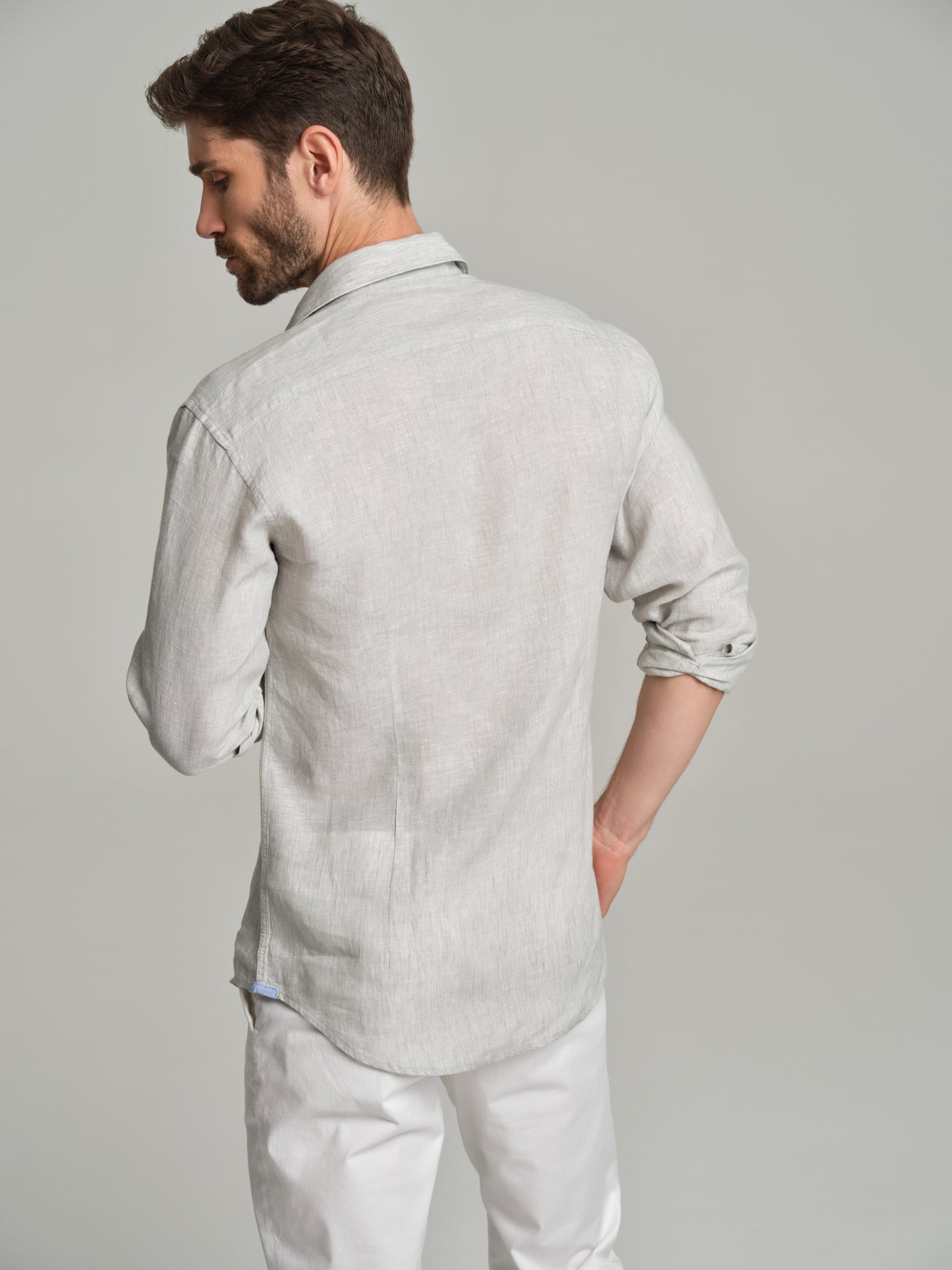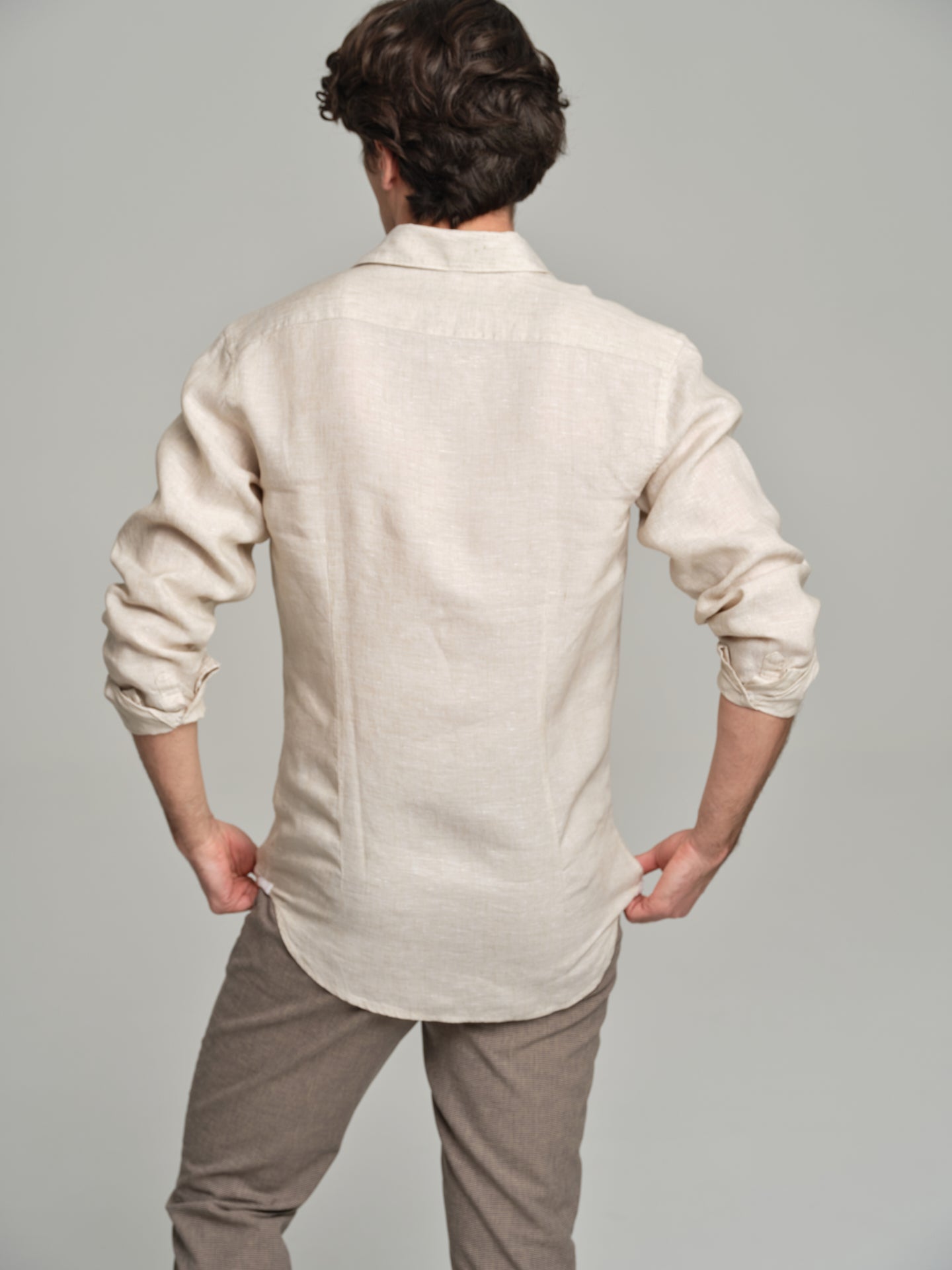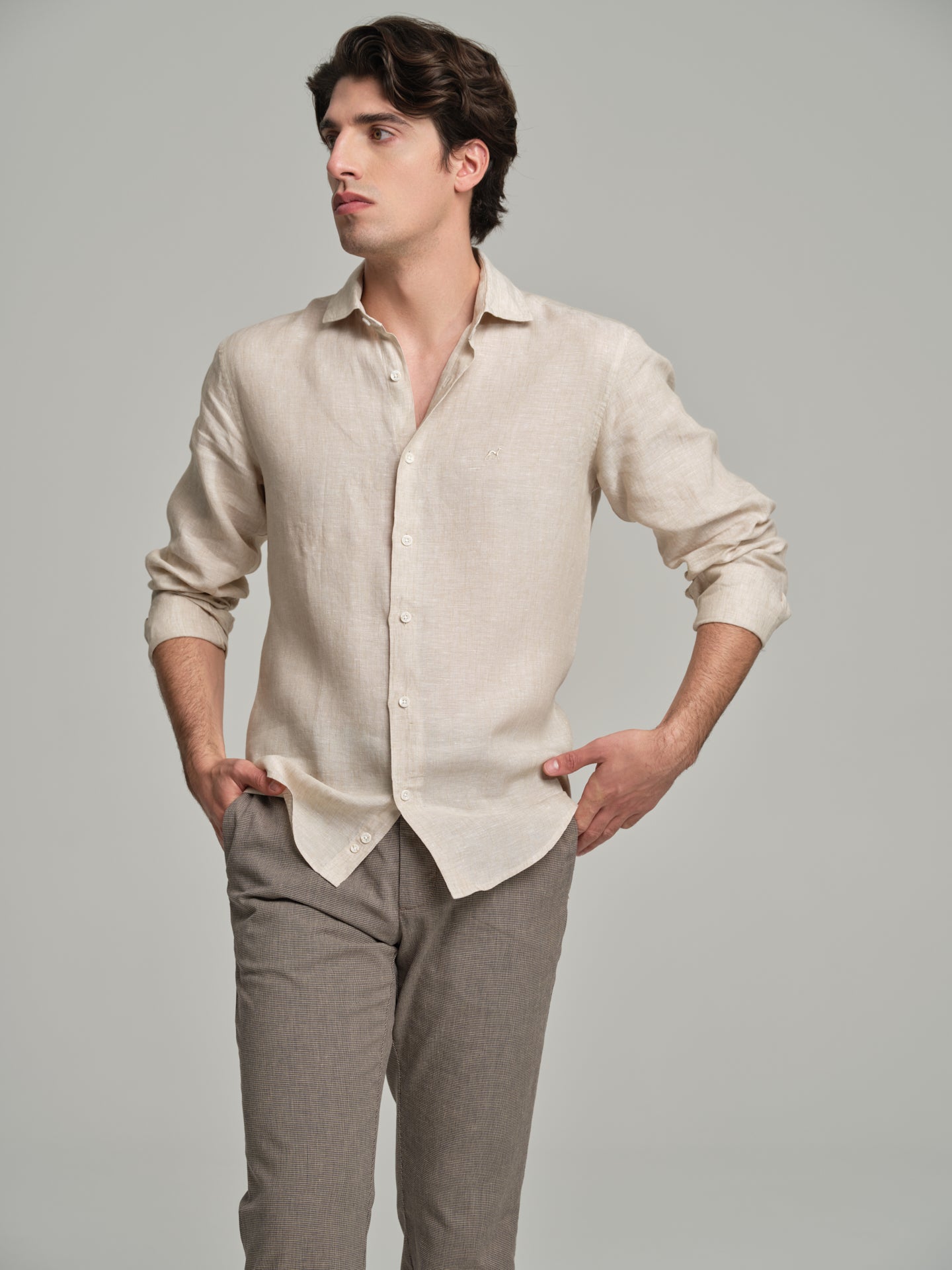 Sport shirt in plain linen quality. Fabric made of 100% linen. Featuring an open spread collar and button-up fastening. Long sleeves with single cuffs with 2 buttons. Chest logo embroidery. Color contrasting details on interior yoke piping and side gussets.