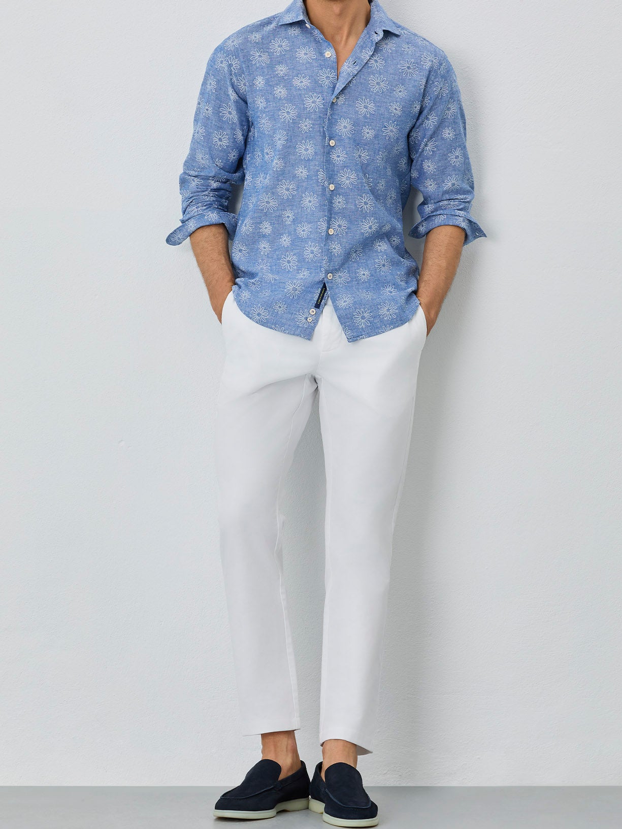 Slim Fit Shirt With Open Collar In Cotton-linen Blend With Print