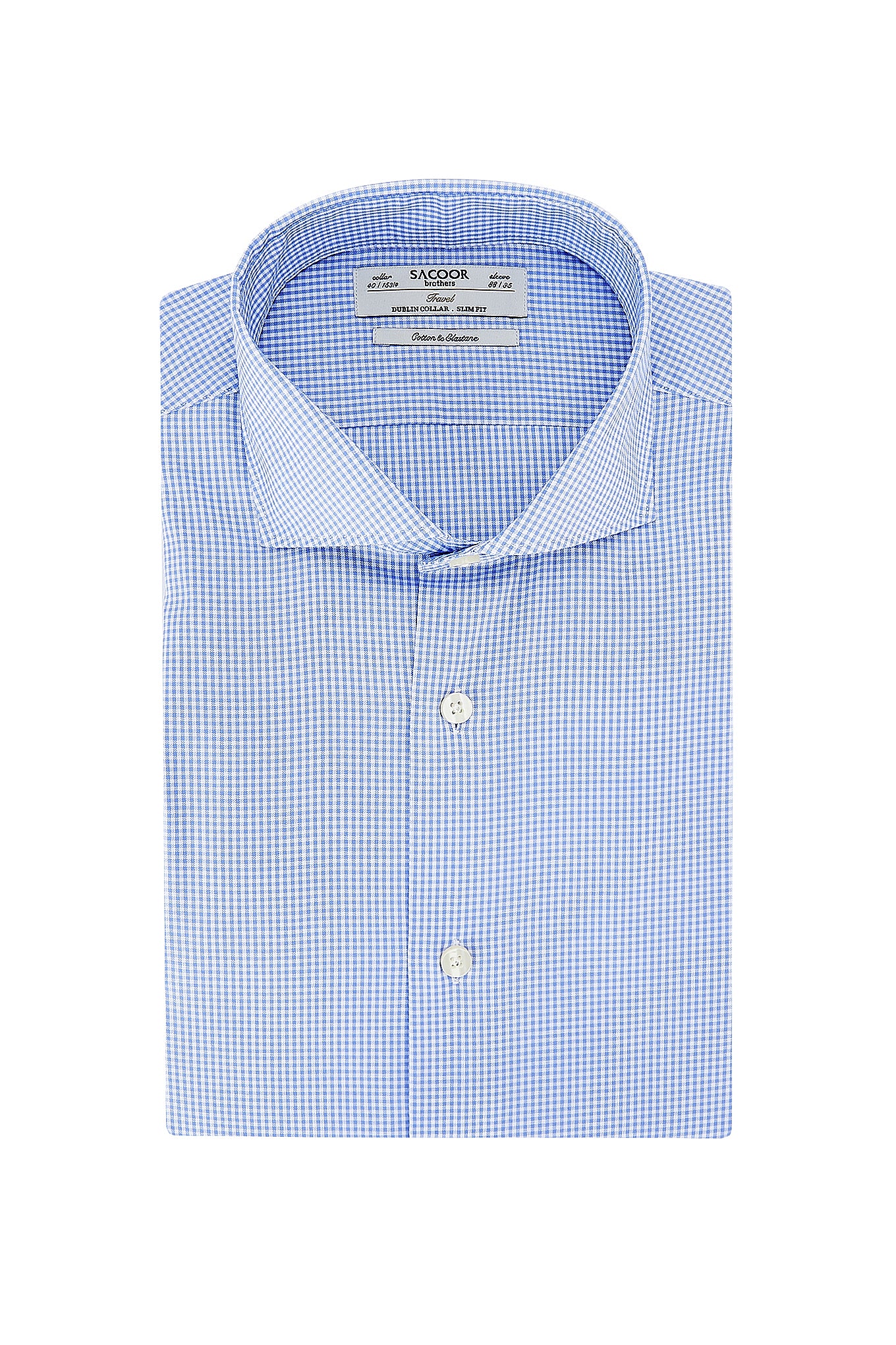 Men's shirt, classic cut, checked pattern. Open collar, with stays included. English stitching, more comfortable with a quality finish. Side support from triangular seams. Cotton and elastane fabric for greater comfort and flexibility. Travel edition shirt, designed for businessmen on the go. We want our Travel collection to offer freedom of movement, comfort and easy maintenance. The size 40 back length is 78 cm and the sleeve length is 63 cm. See our Size Guide.