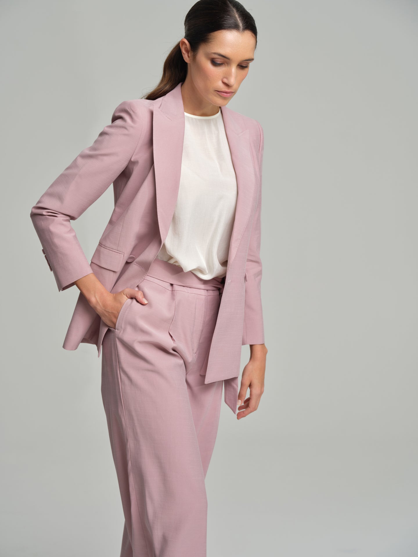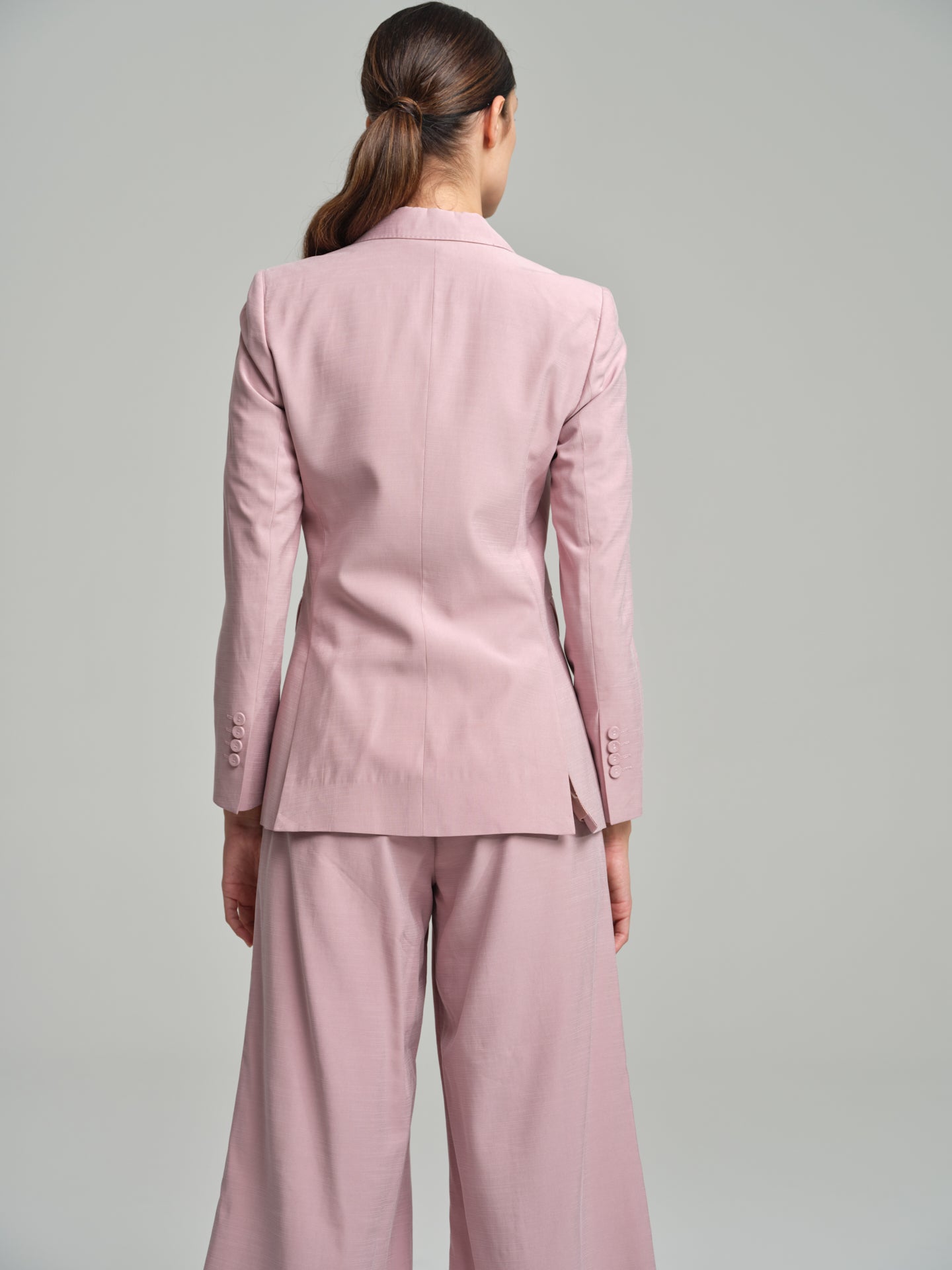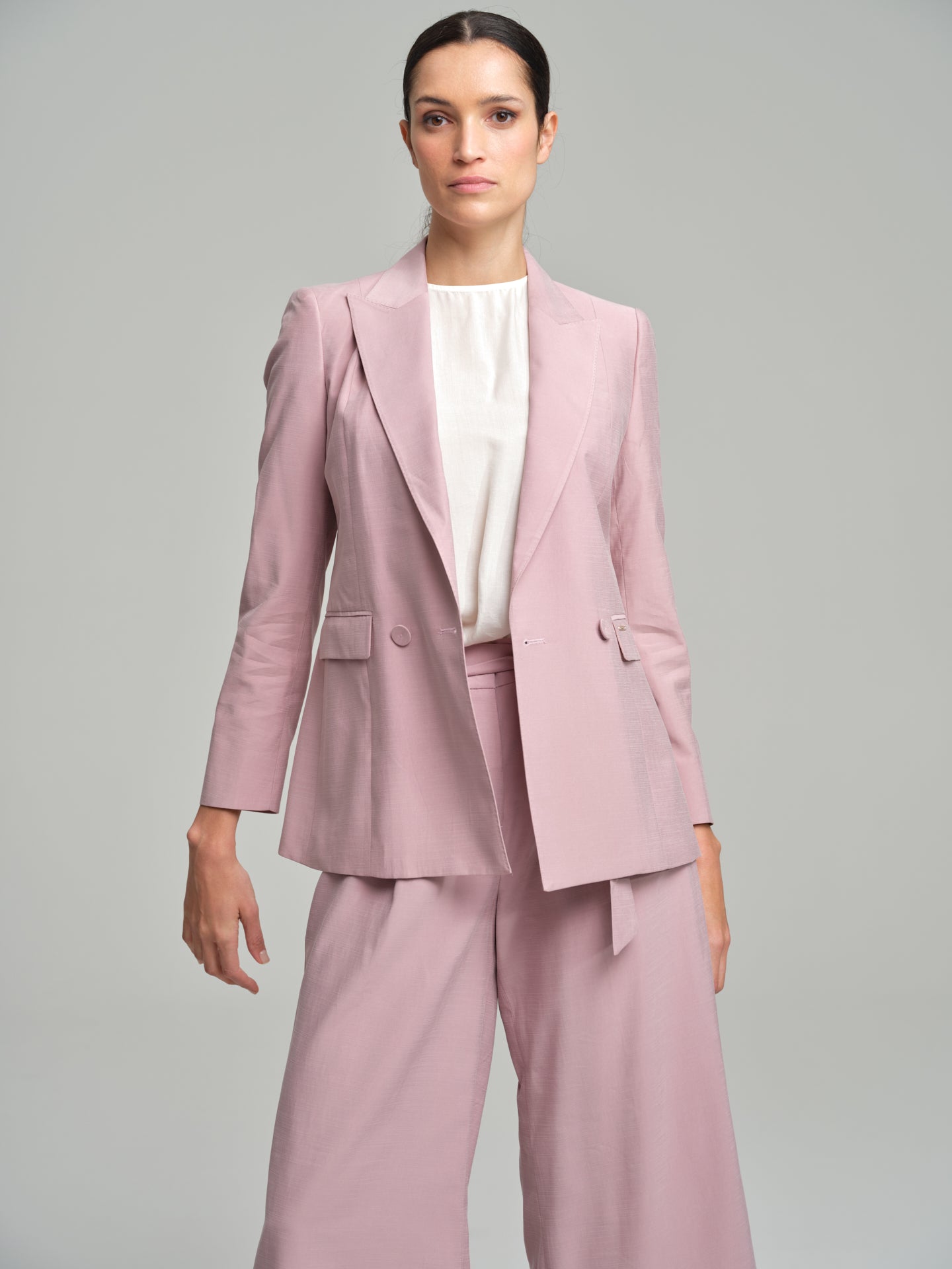 Double-breasted plain blazer constructed in a soft fabric for maximum comfort. With peak lapels, long sleeves with four-button cuffs and two back slits. Featuring front flap pockets and interior pocket. The loose fit is an updated and trendy version of the classic blazer. Fully lined with branded lace and brand metal plate at the front.