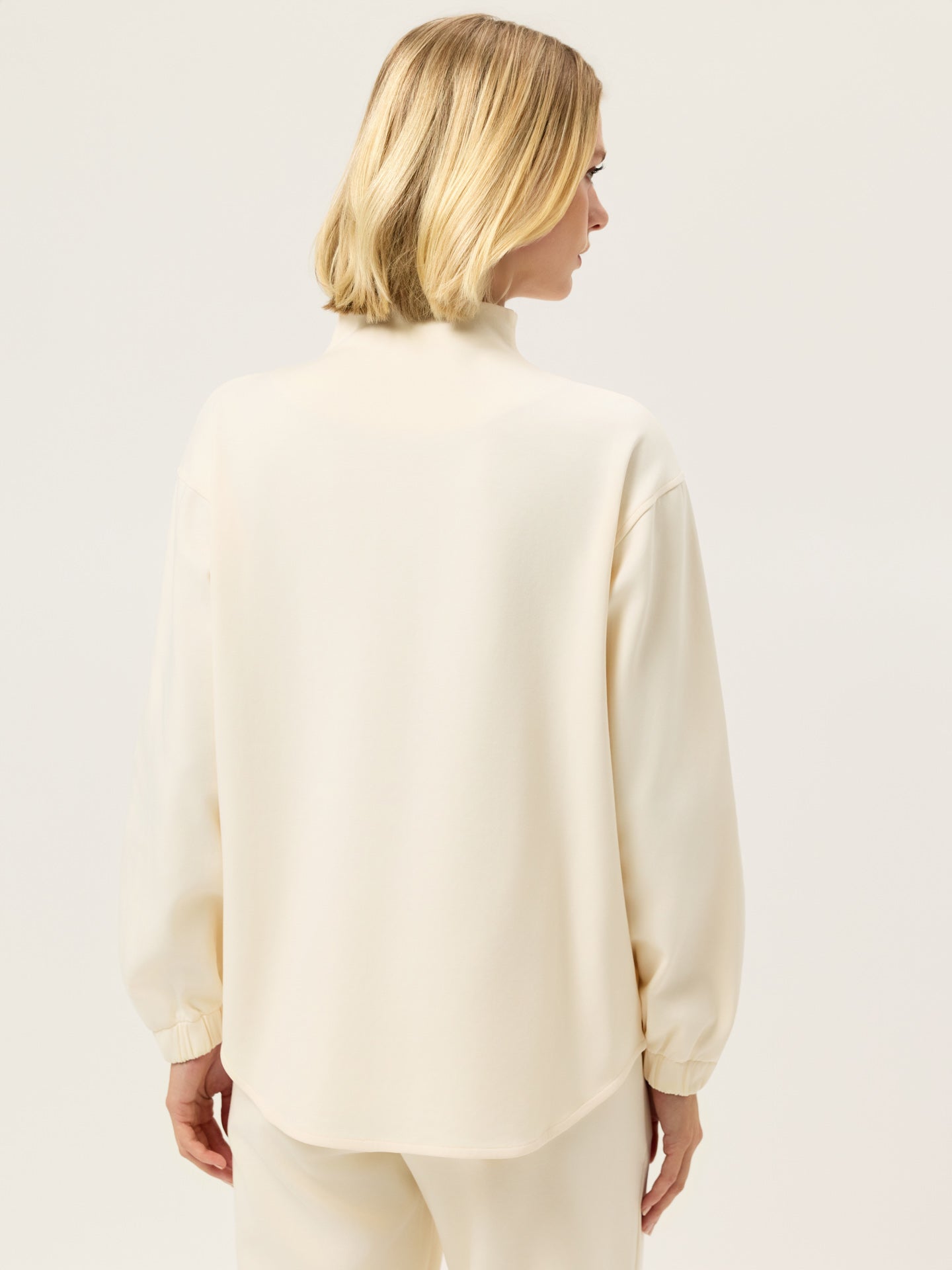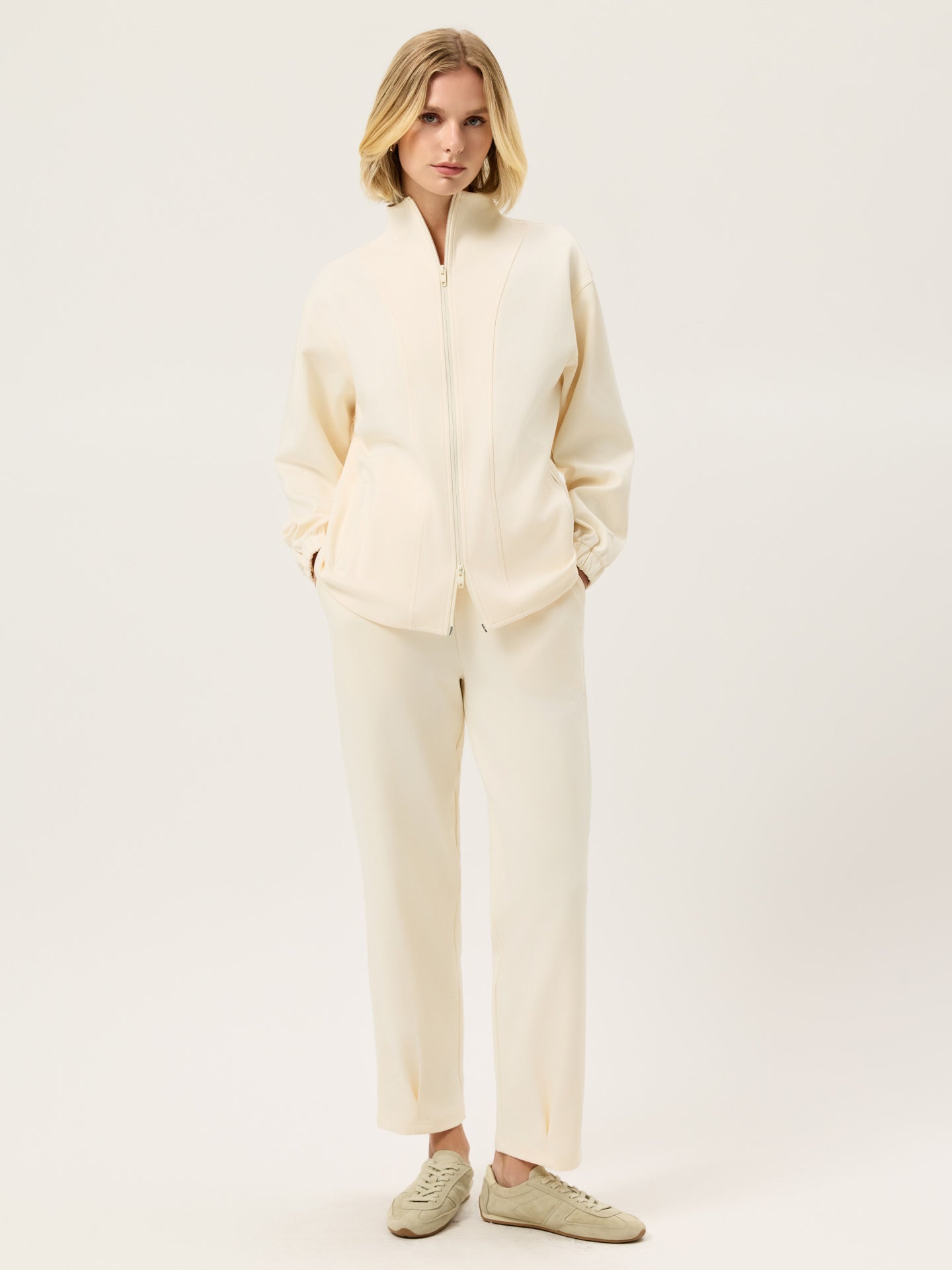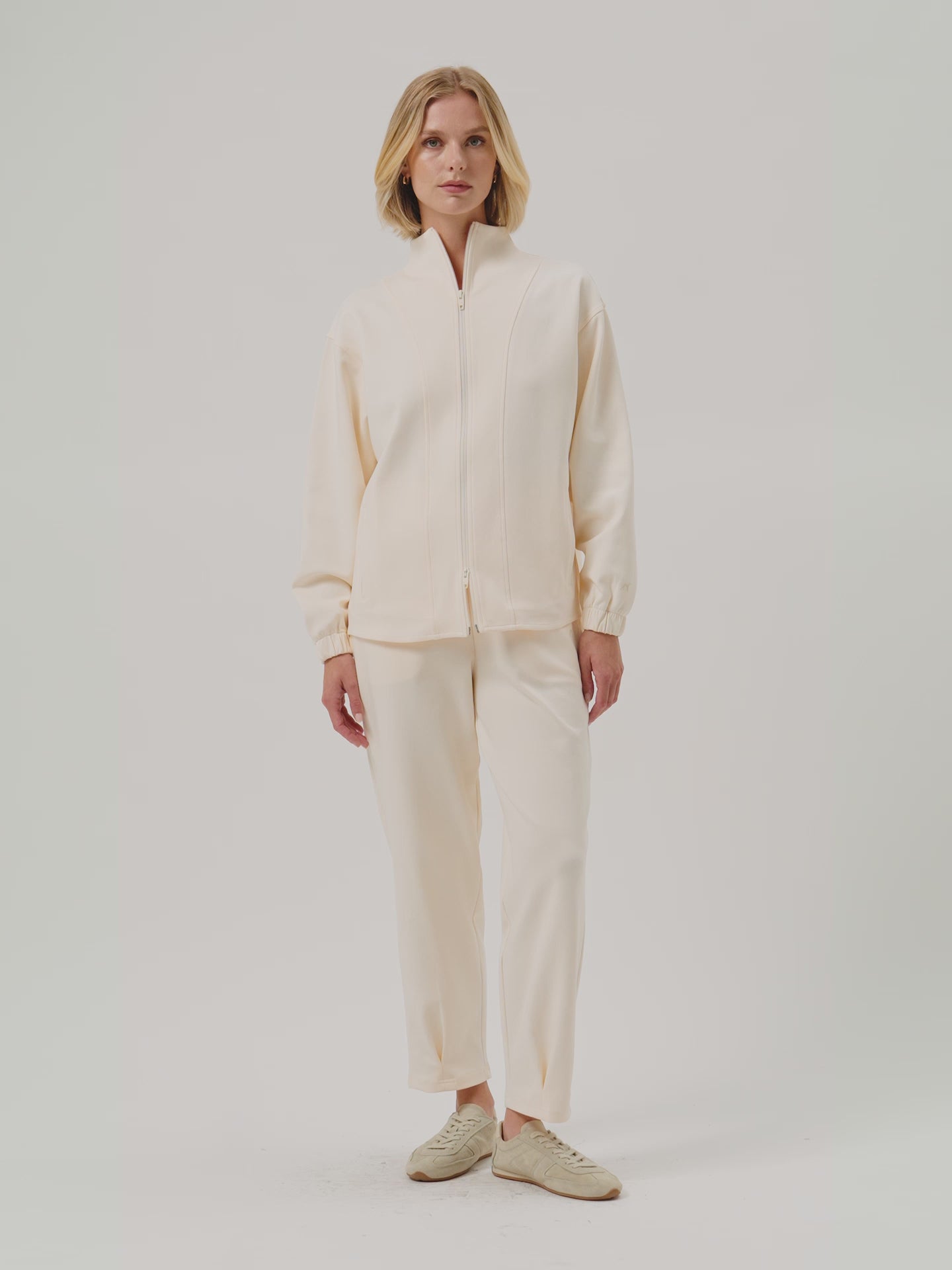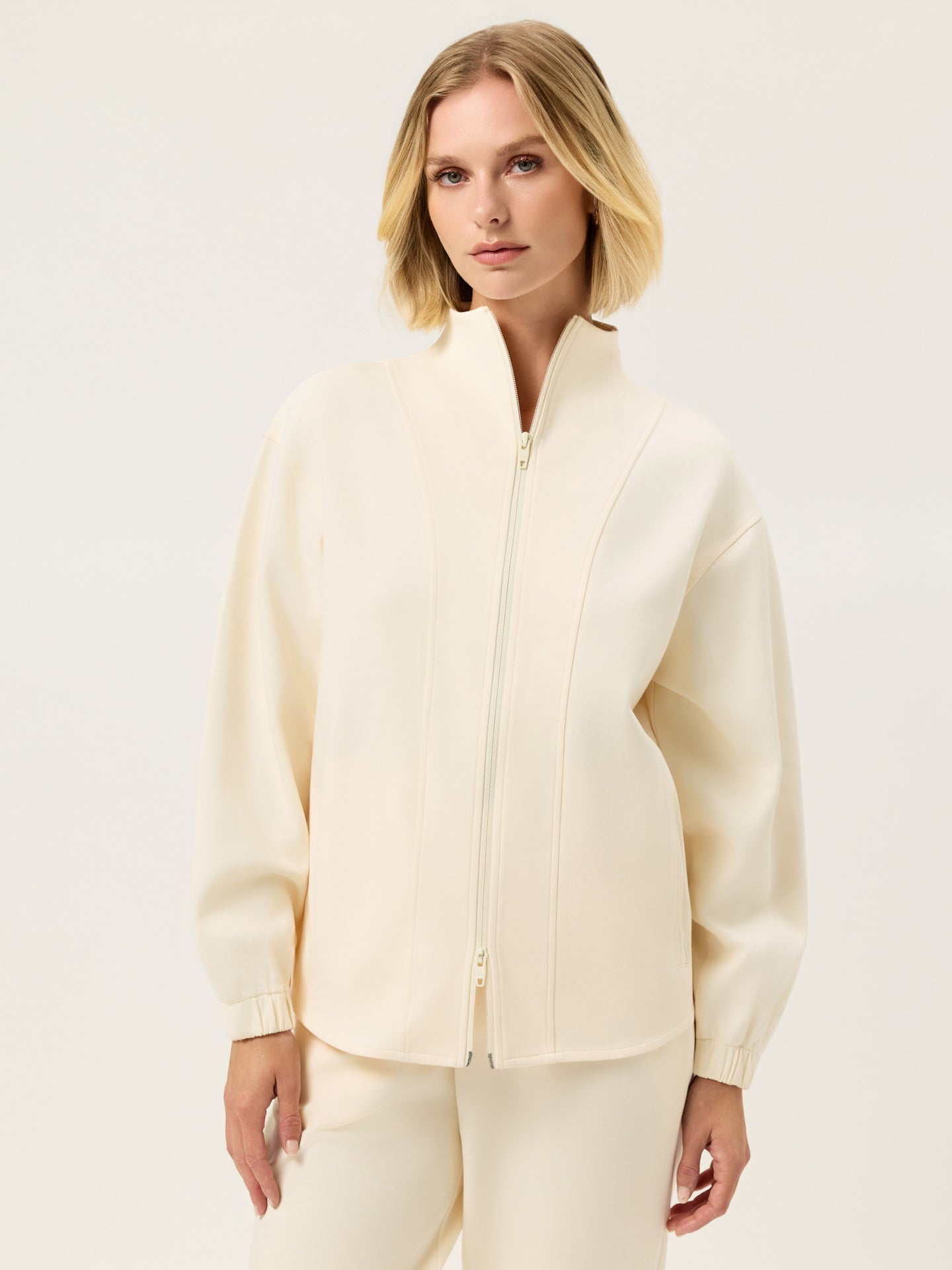 Luxe Leisure Cotton blend fleece jacket with pockets and high relief logo print at sleeve. Closes with double puller zipper. This capsule collection explores the space between refinement and relaxation, comfort and effortless style, functionality and elegance.
