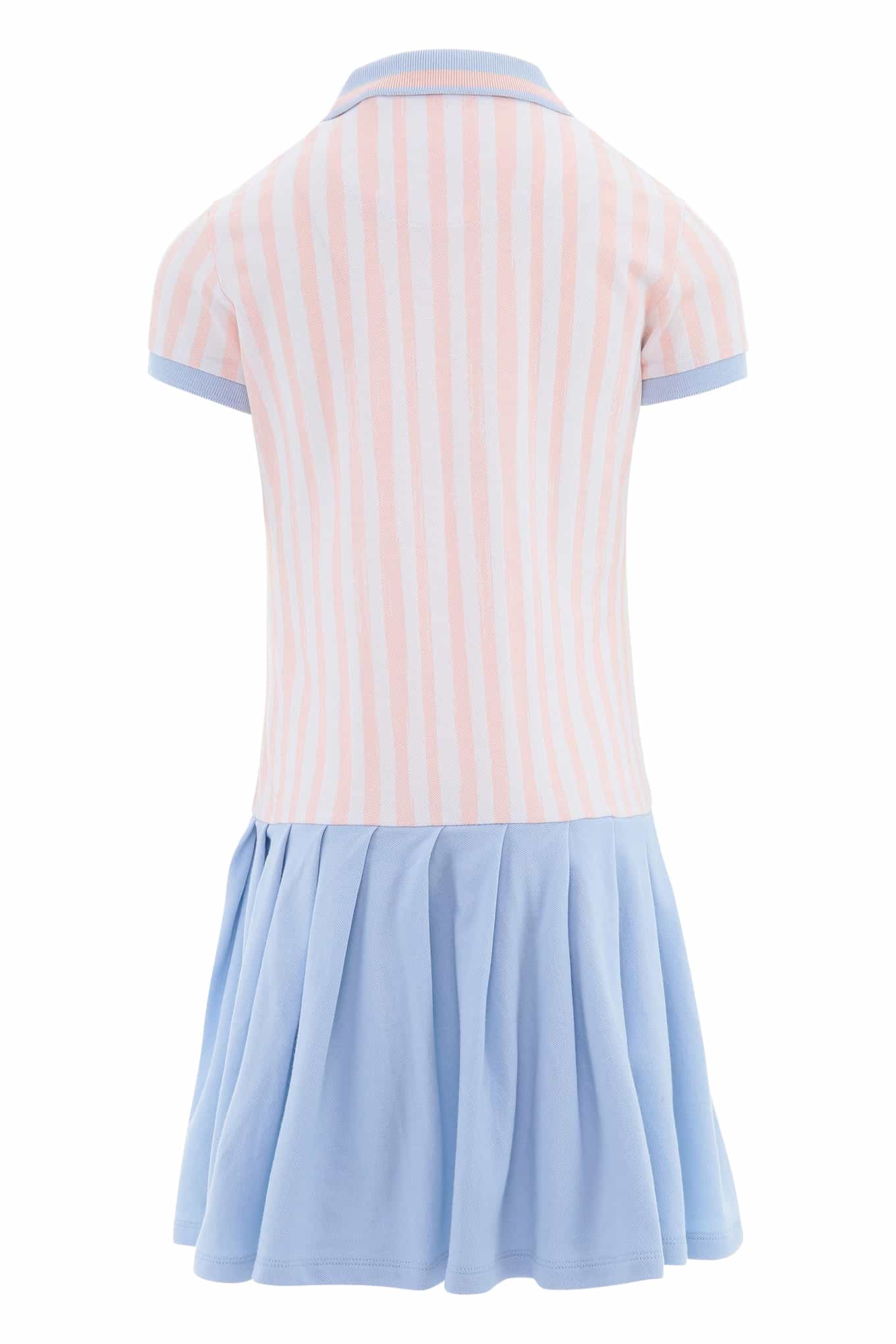 Printed cotton and elastane polo dress. Features a seamless placket with buttons all the way down to the waist, short sleeves with ribbed trims and ribbed collar with one stripe. Pleated waist, double-needle stitch hem and contrast embroidery artwork at chest.