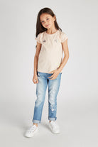 Girl's jeans made of 100% cotton with eye-catching floral print on the legs. Straight cut, wider model. Two side pockets with lace-trimmed piping. Two back pockets, also with lace-trimmed piping and floral print. Button-adjustable elastic waistband. With zip fastener and button. Spring/Summer 2019 collection available at Sacoor Brothers online store.